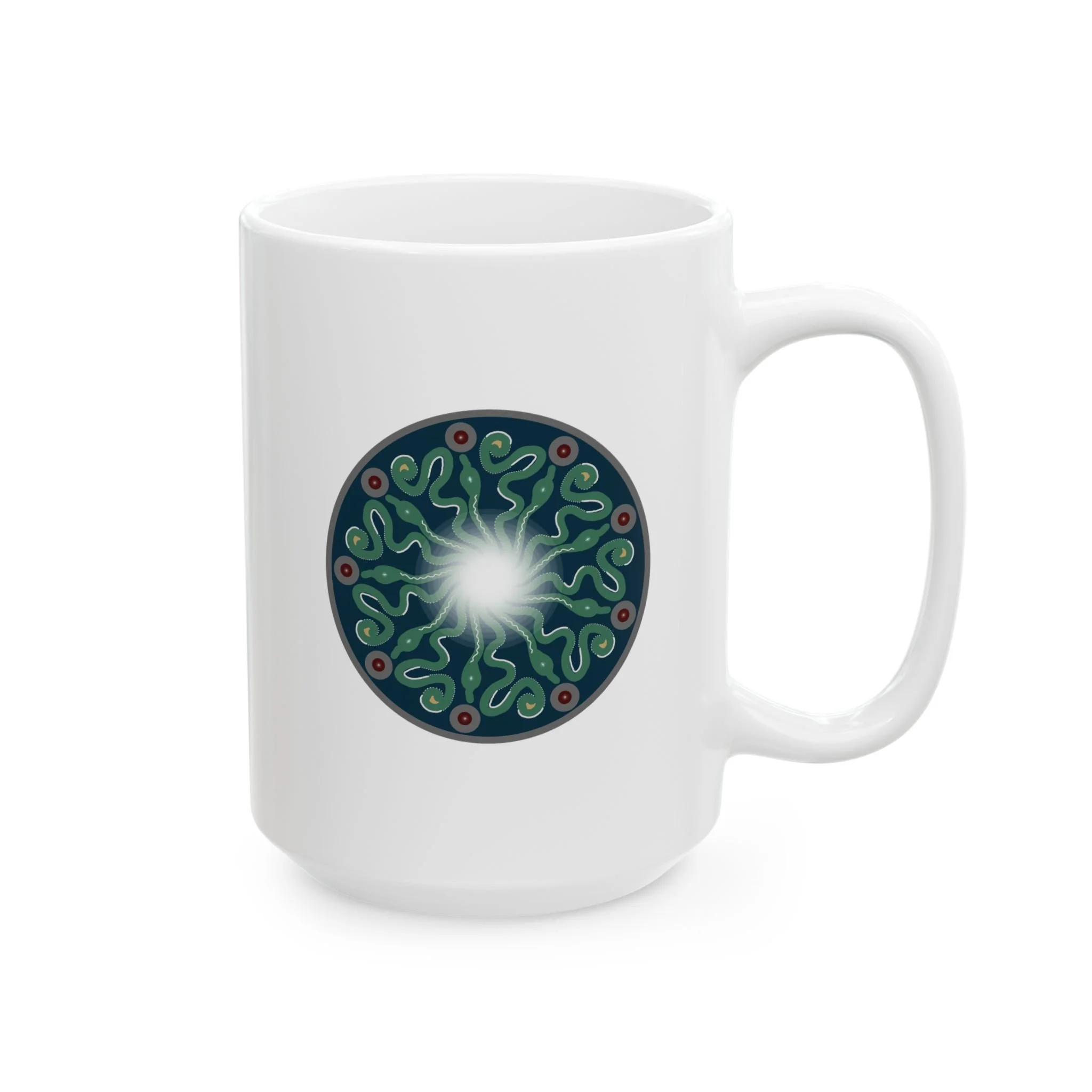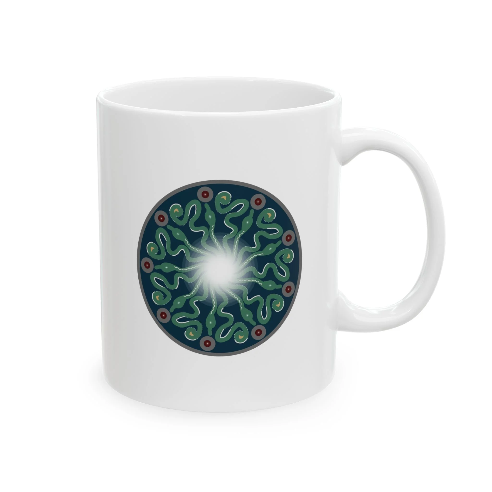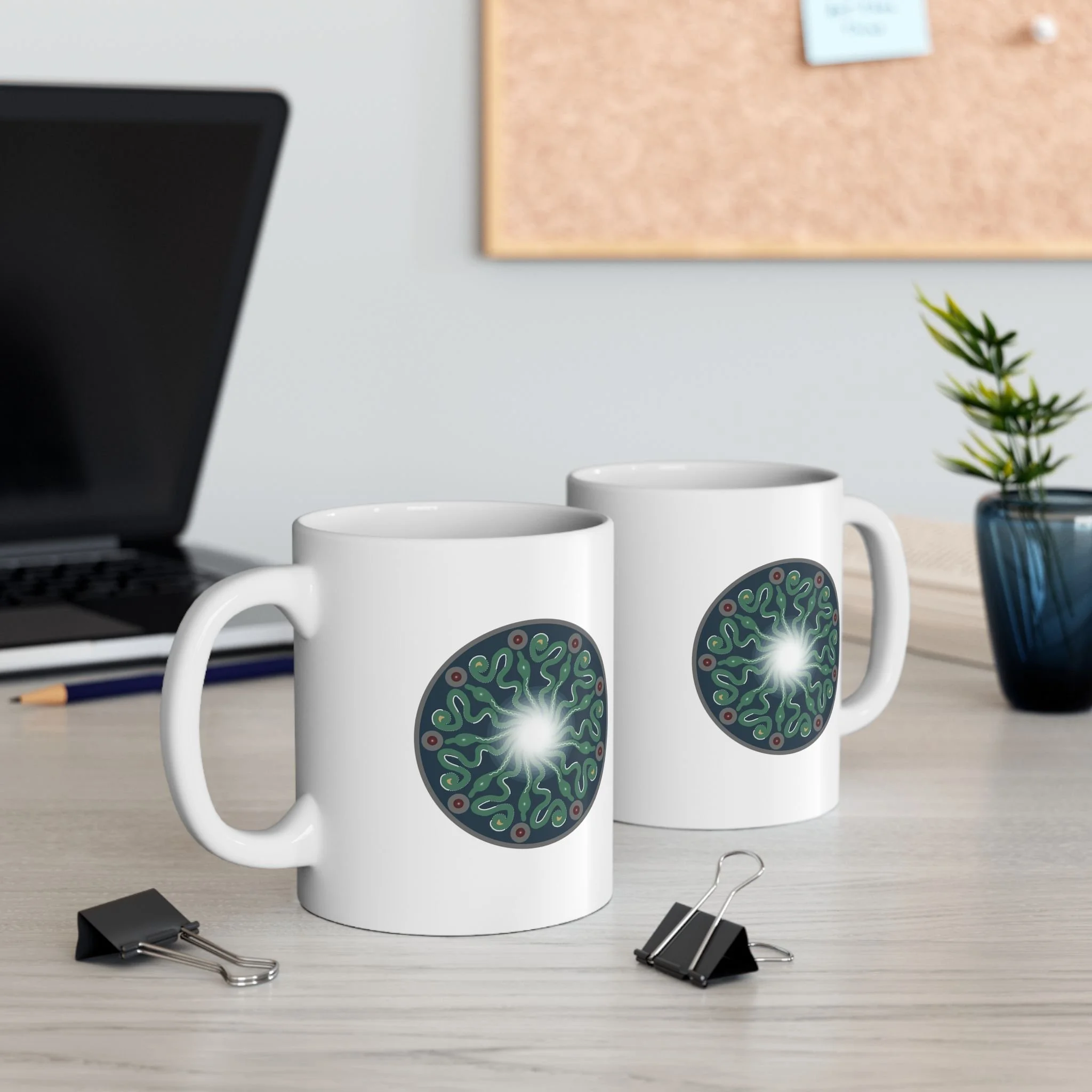 A glossy ceramic mug that brings a calm, artful moment to your morning routine. The deep, jewel-toned mandala-style artwork peeks from either side, framing your hands as you wrap them around the comfortable C-handle. Smooth, bright printing keeps the colors vivid pour after pour, while the durable white ceramic and shiny finish make the design pop on your desk or kitchen shelf. Use it for slow sips of tea, focused work sessions, or quiet weekend mornings when you want something pretty and steady in your hands. The result is a small ritual — a pause wrapped in color and pattern that fits right into a creative, mindful lifestyle.