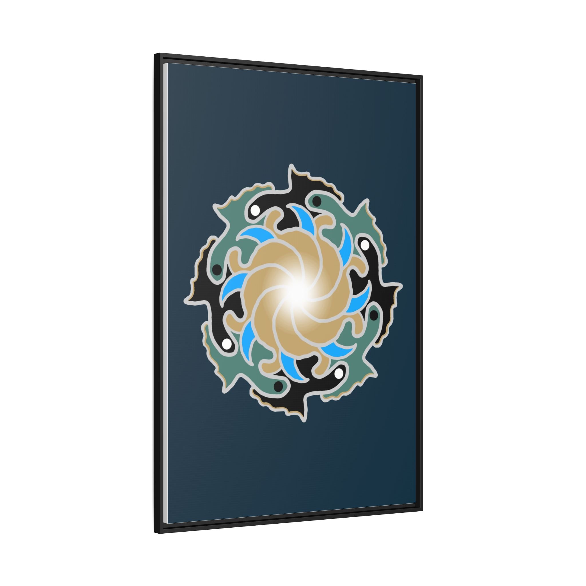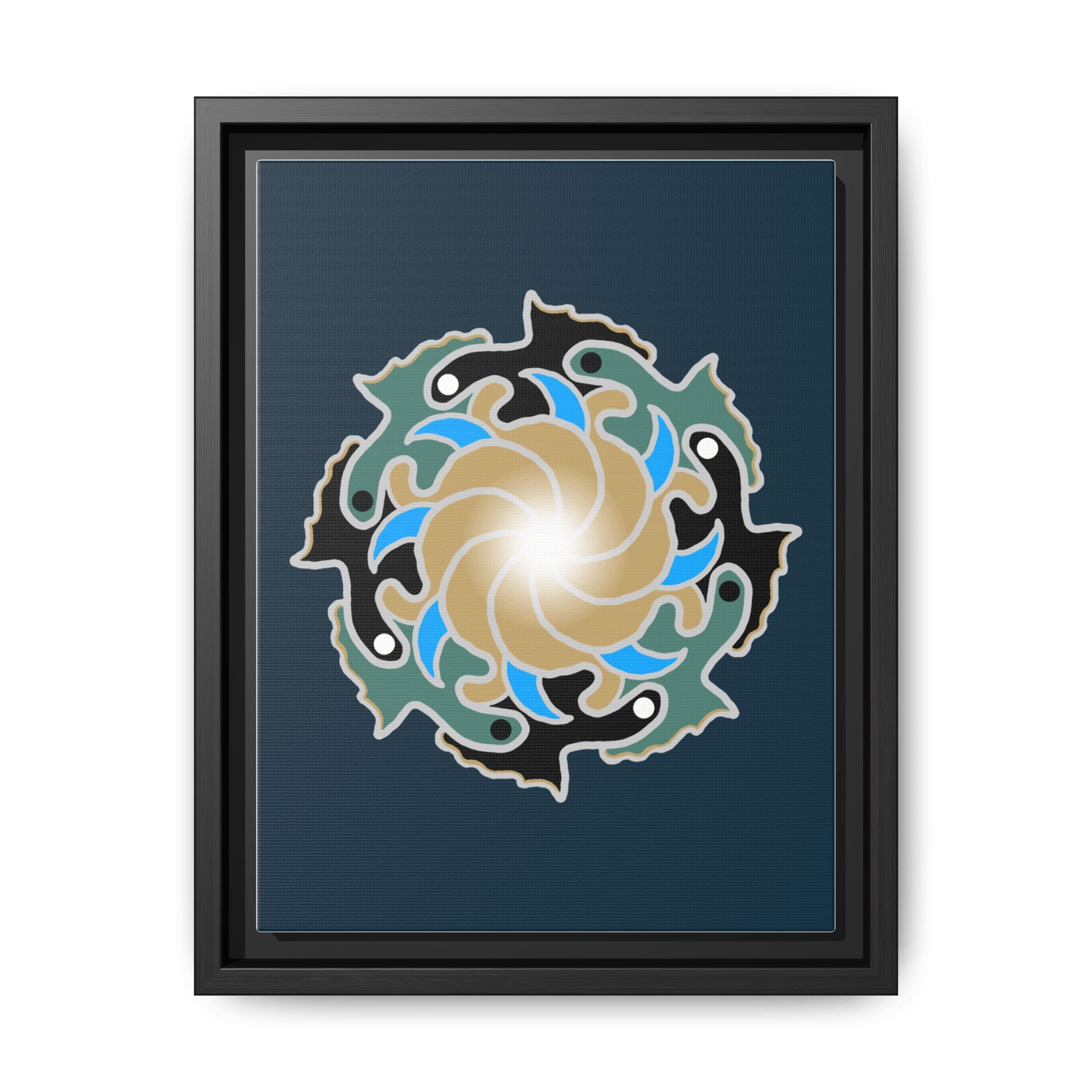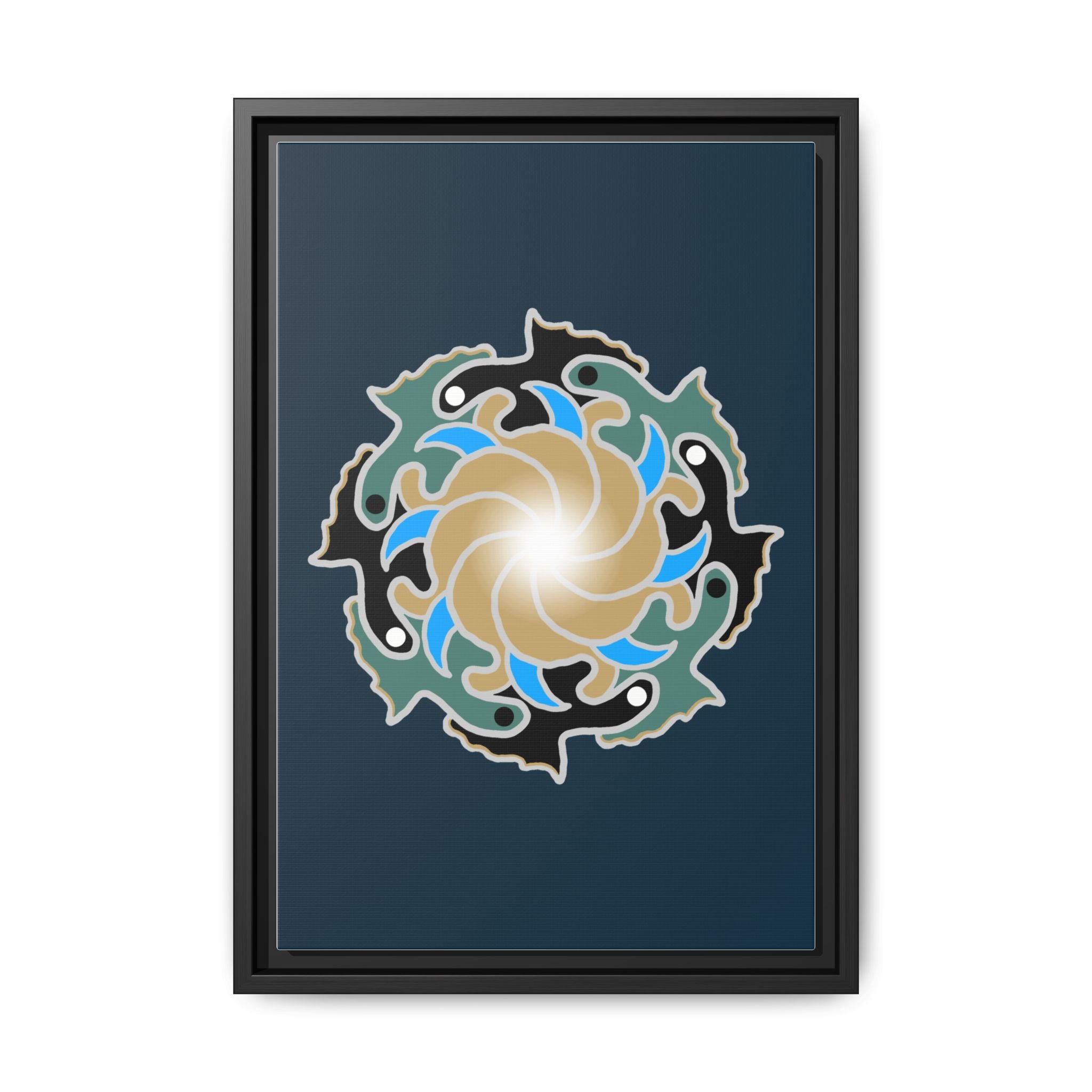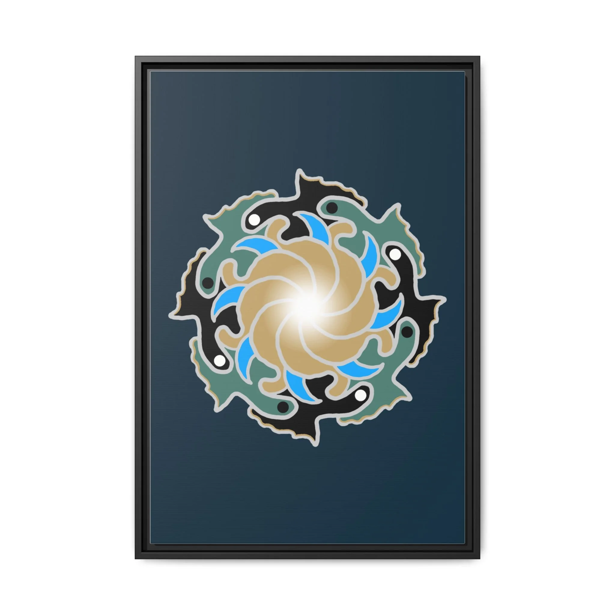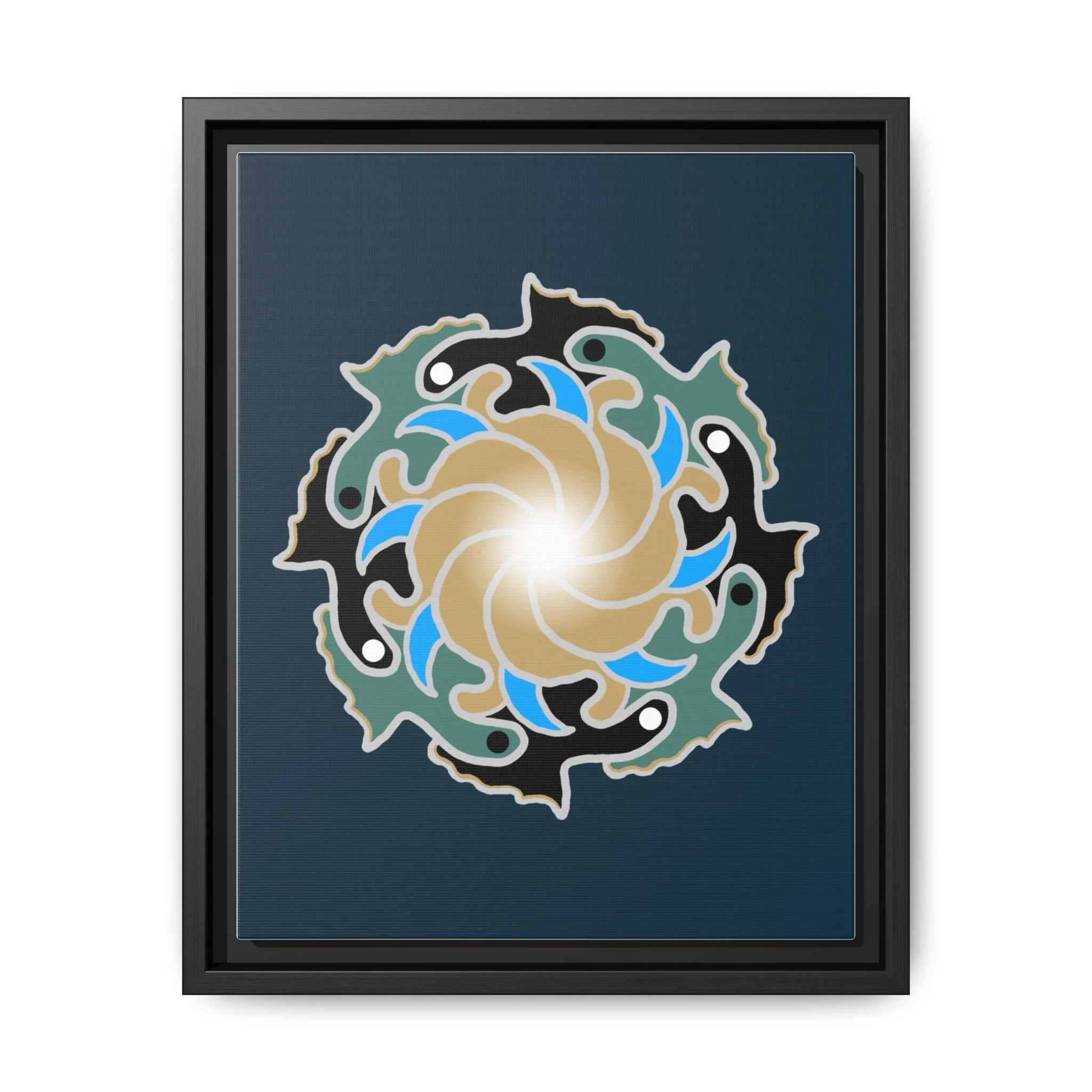 This matte canvas print is a study in dynamic contrast, featuring a golden vortex surrounded by abstract shapes in azure blue, black, and seafoam green. The design balances chaotic energy with a structured center, representing the harmony found within complexity. Framed in a slim pine profile, it creates an energetic yet balanced focal point for a busy living room, a collaborative workspace, or a modern hallway.