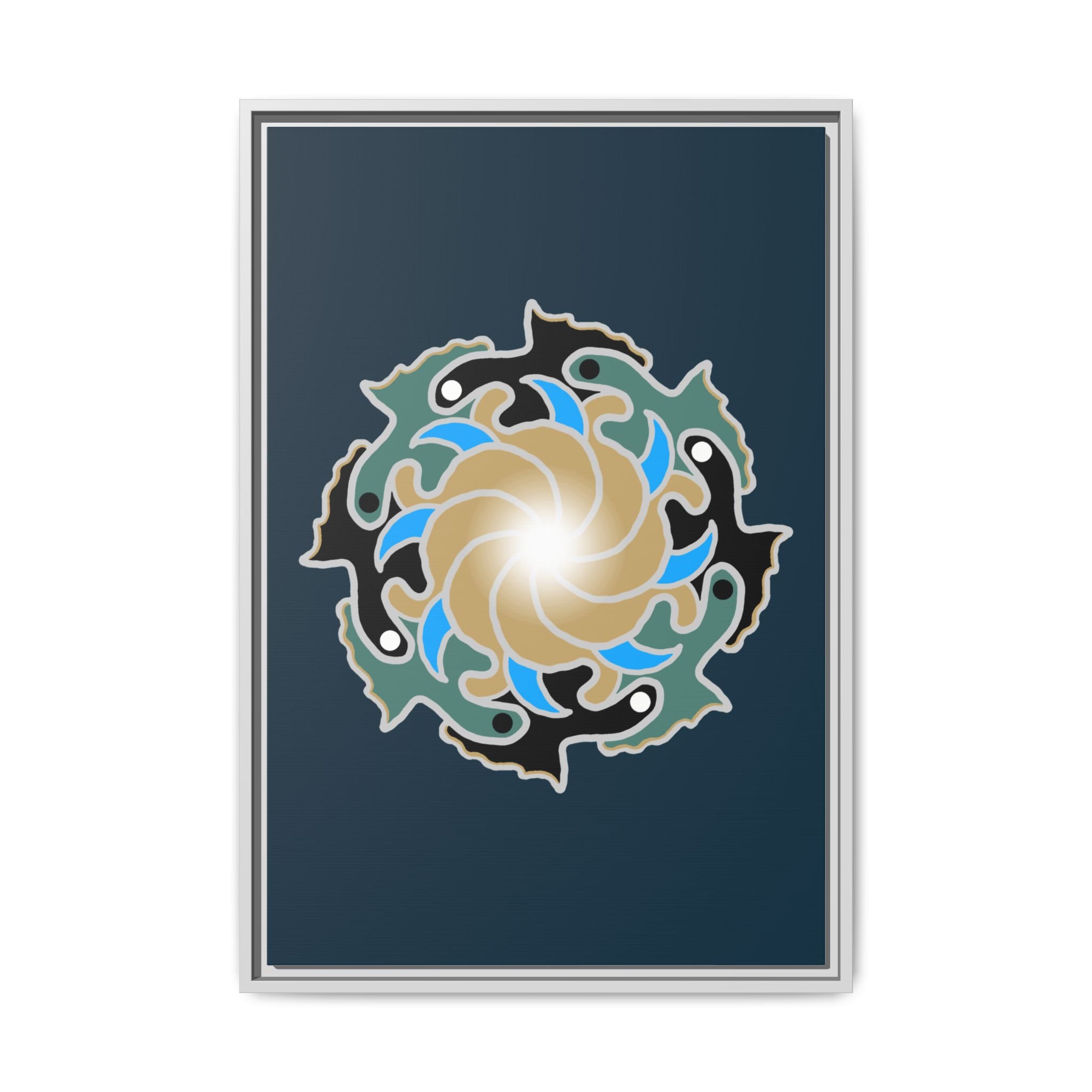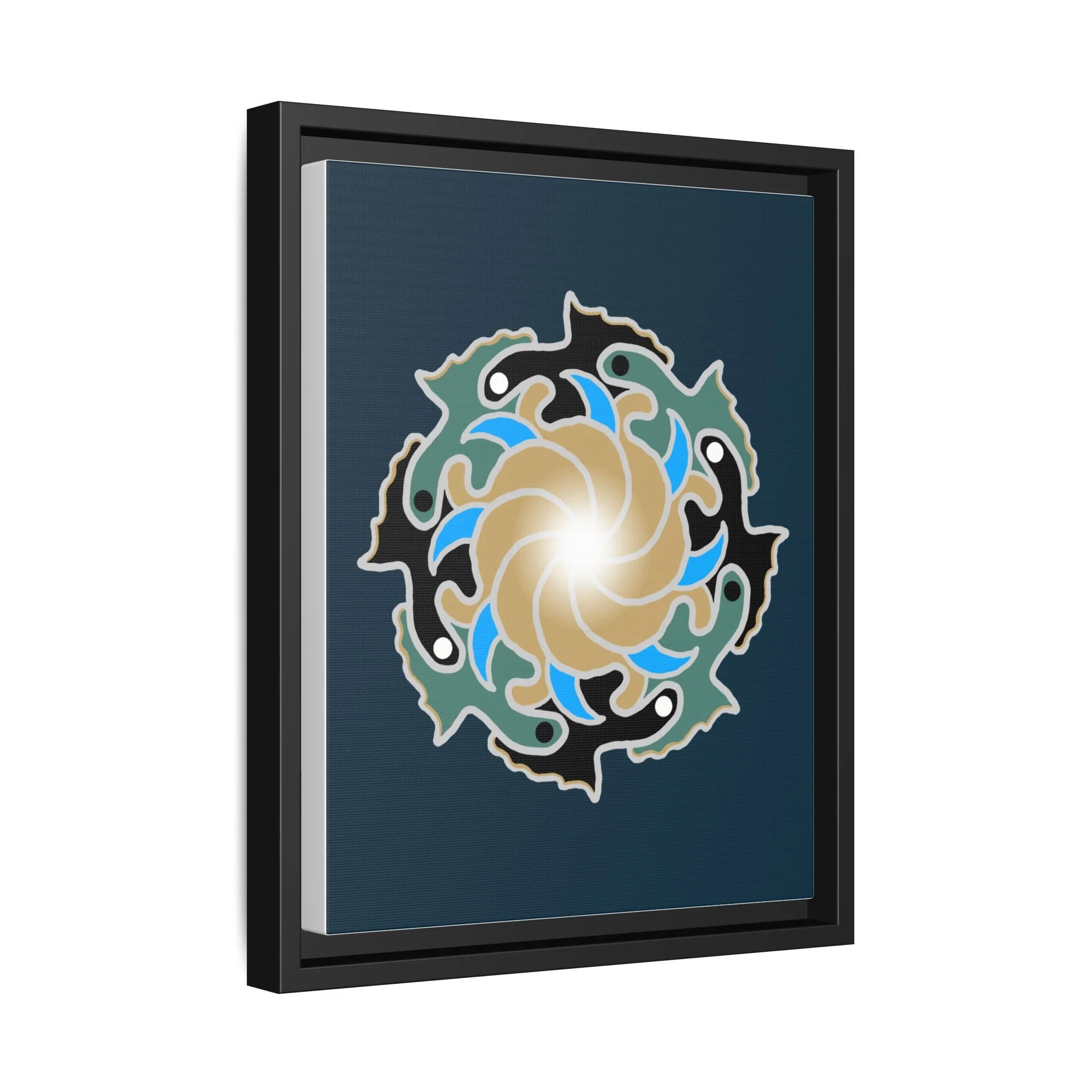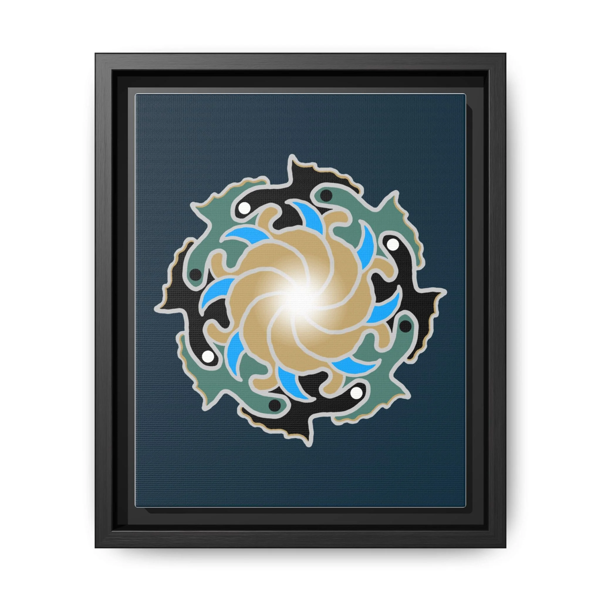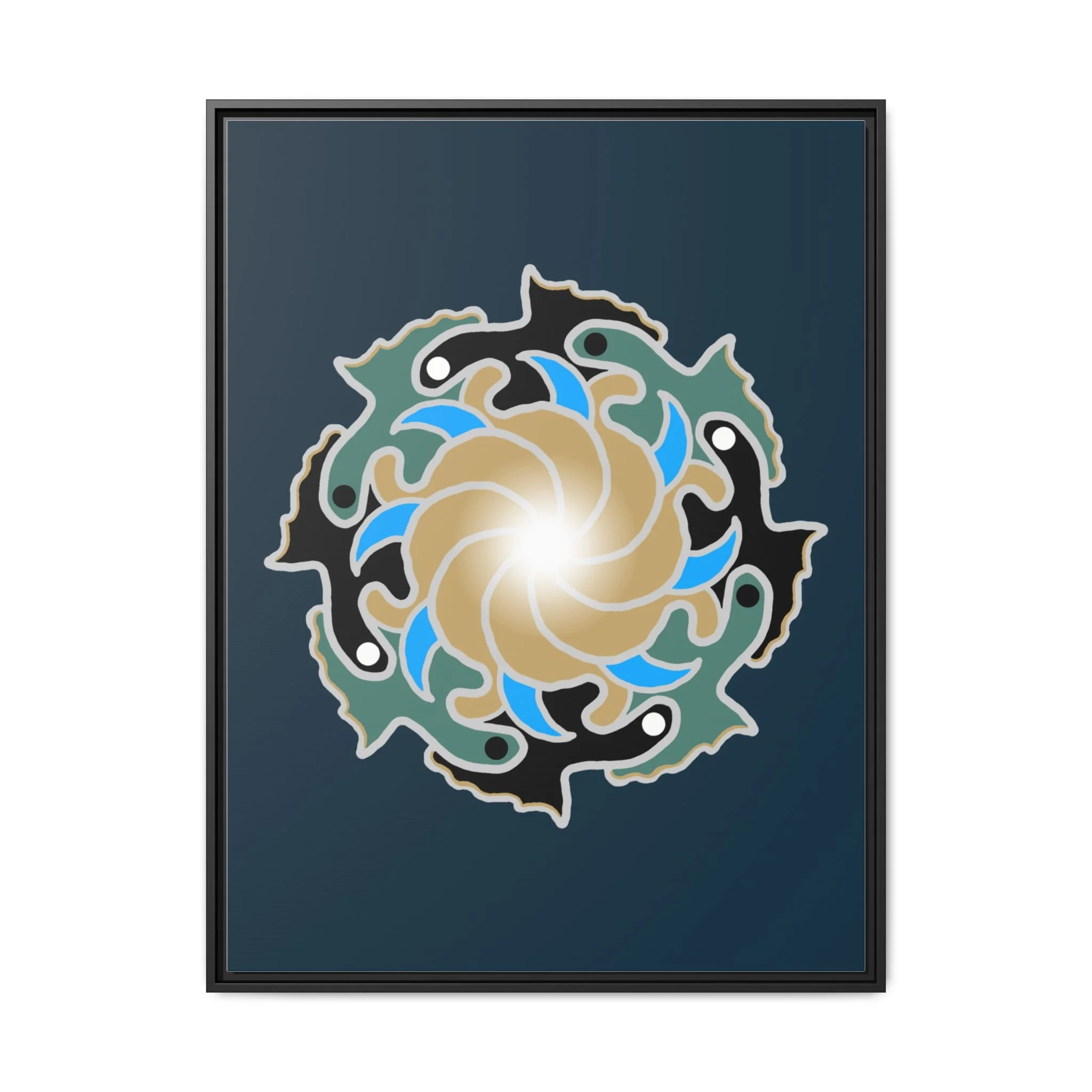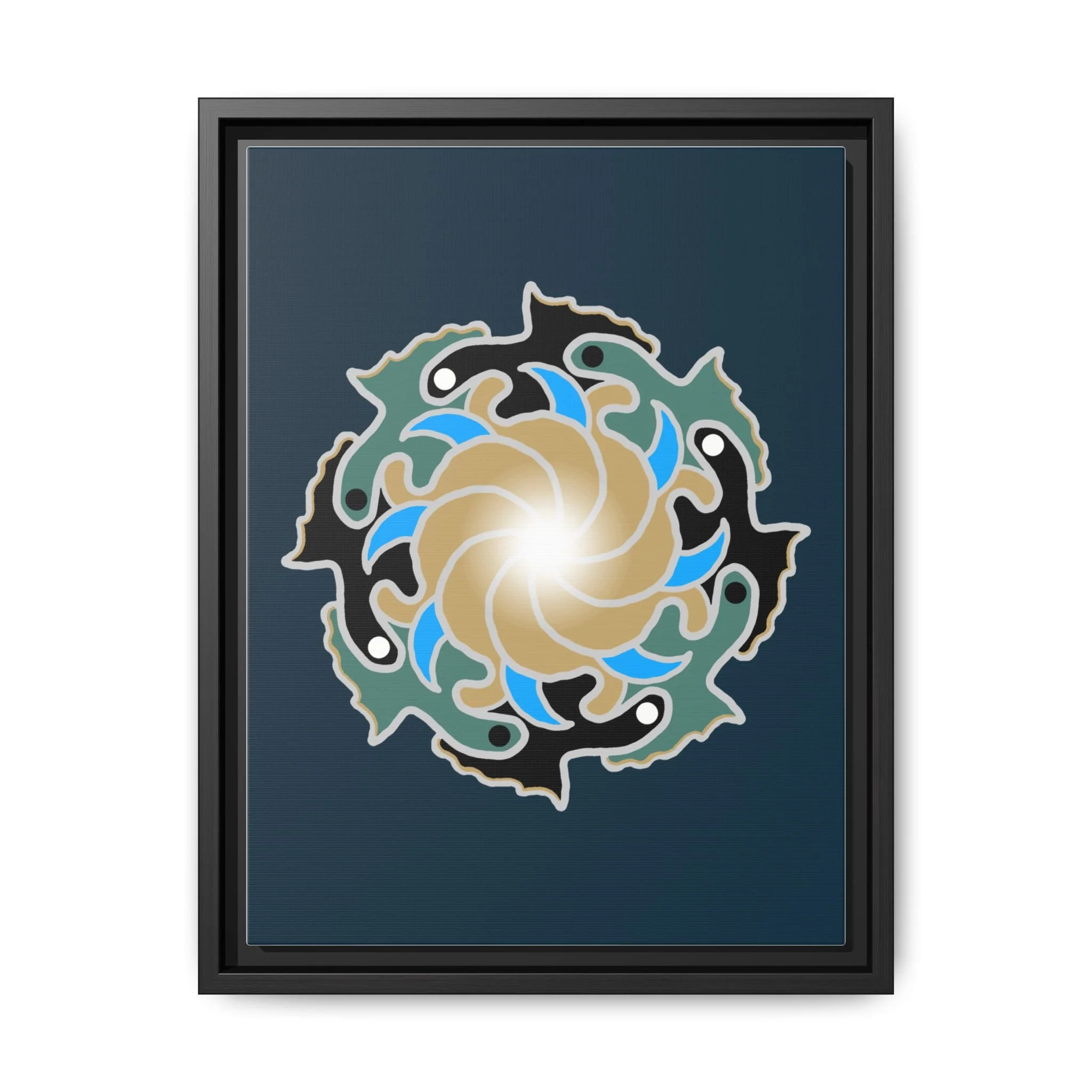 This matte canvas print is a study in dynamic contrast, featuring a golden vortex surrounded by abstract shapes in azure blue, black, and seafoam green. The design balances chaotic energy with a structured center, representing the harmony found within complexity. Framed in a slim pine profile, it creates an energetic yet balanced focal point for a busy living room, a collaborative workspace, or a modern hallway.