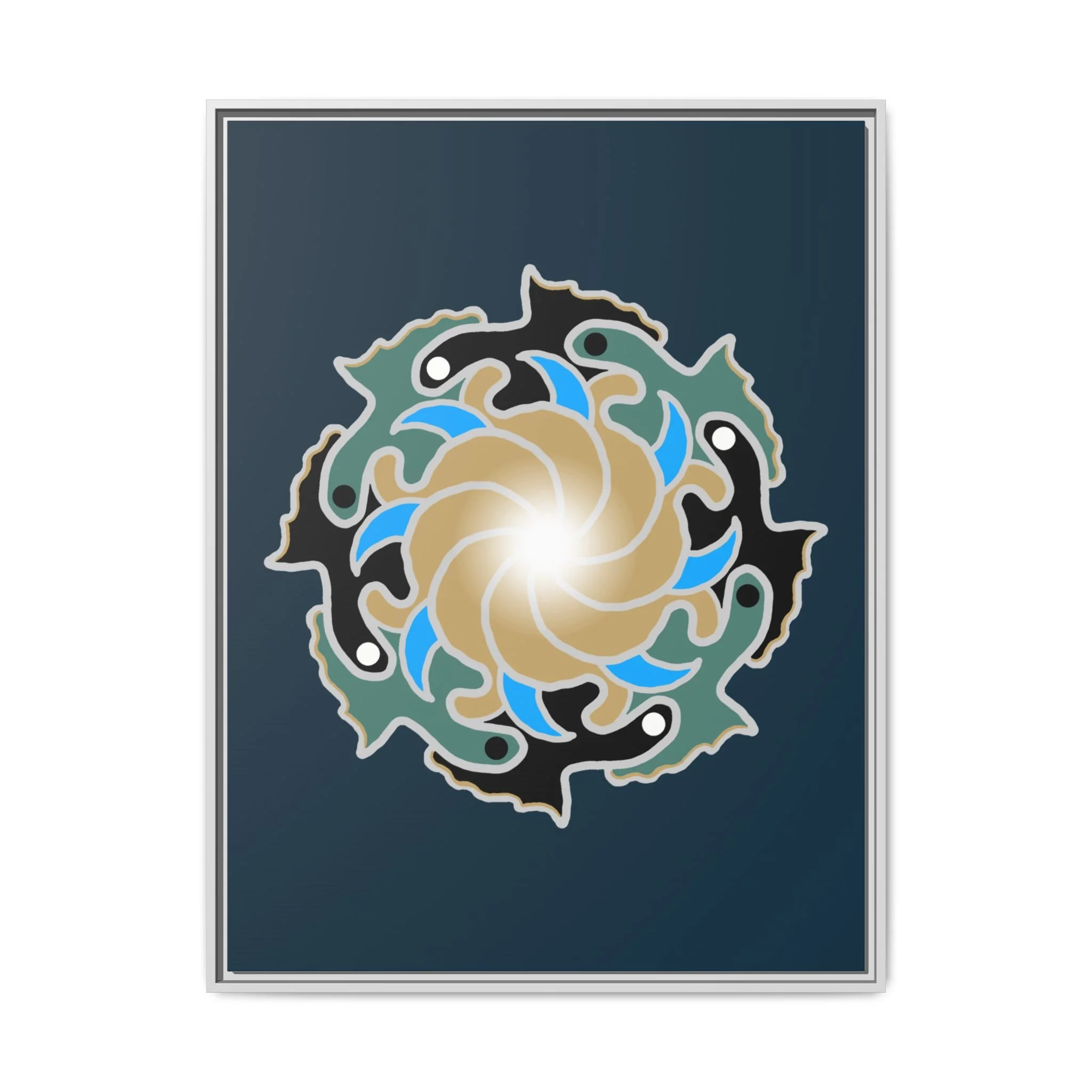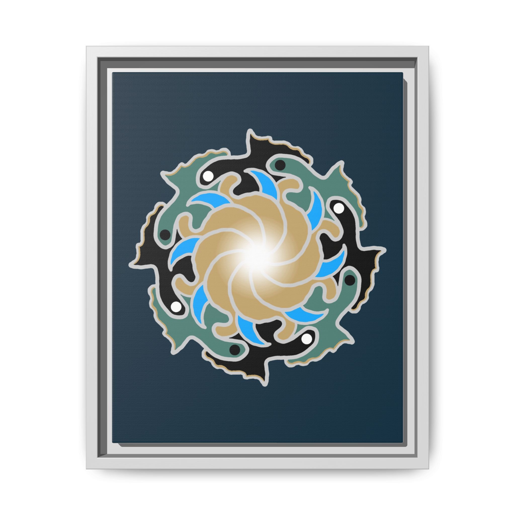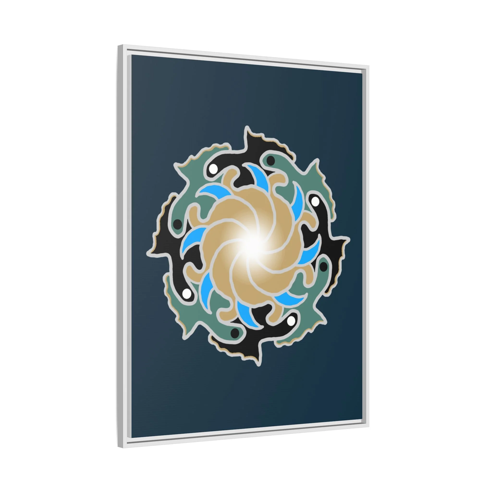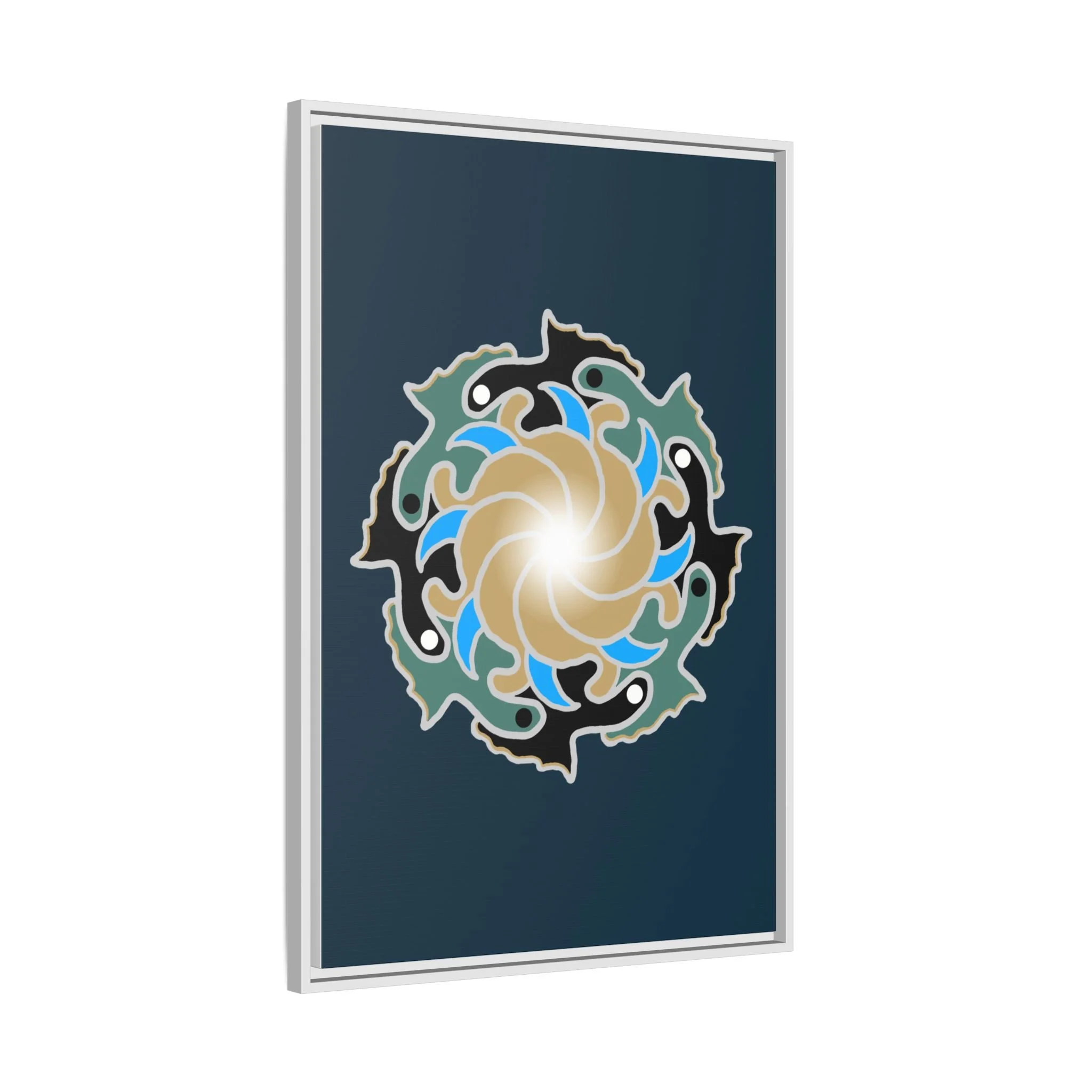 This matte canvas print is a study in dynamic contrast, featuring a golden vortex surrounded by abstract shapes in azure blue, black, and seafoam green. The design balances chaotic energy with a structured center, representing the harmony found within complexity. Framed in a slim pine profile, it creates an energetic yet balanced focal point for a busy living room, a collaborative workspace, or a modern hallway.