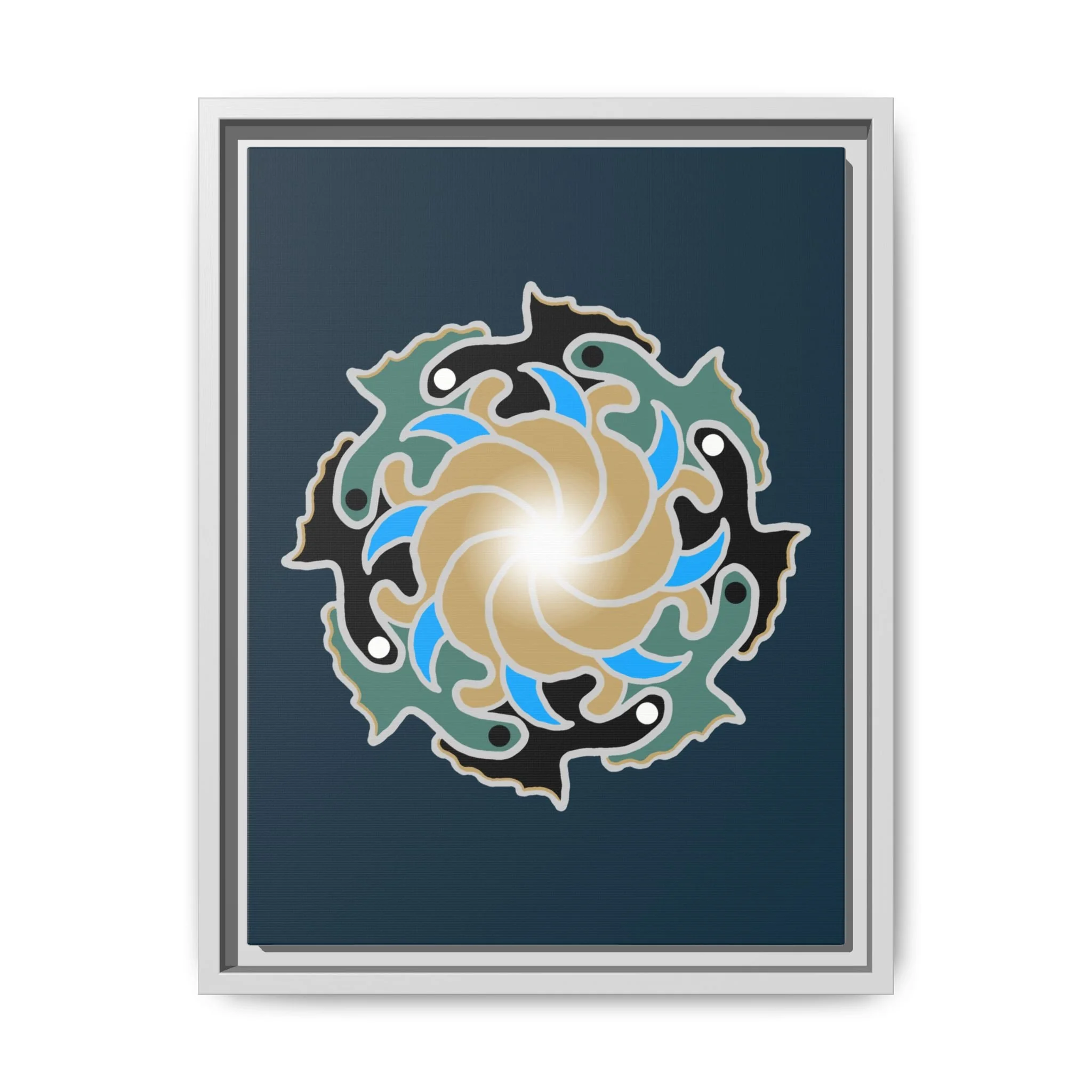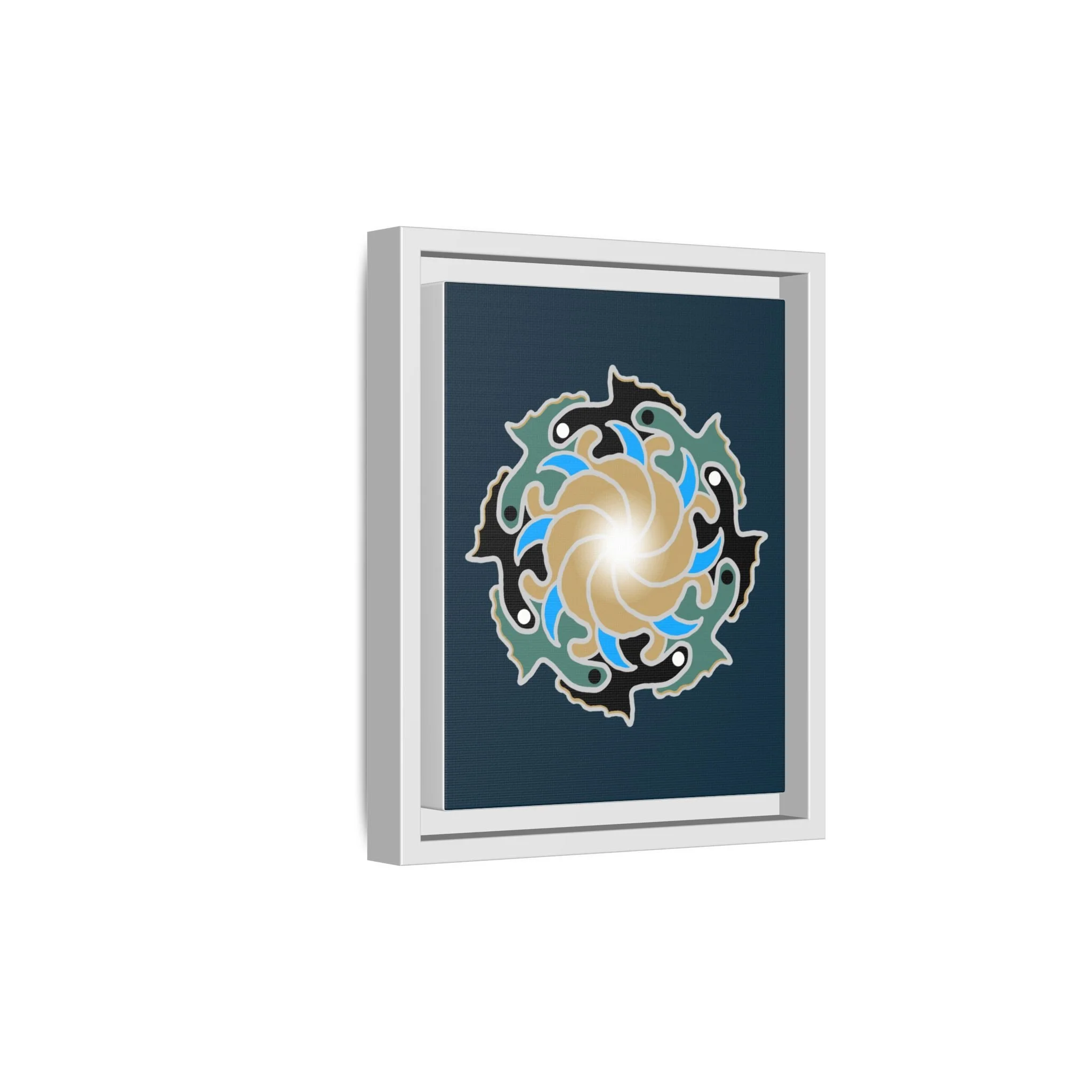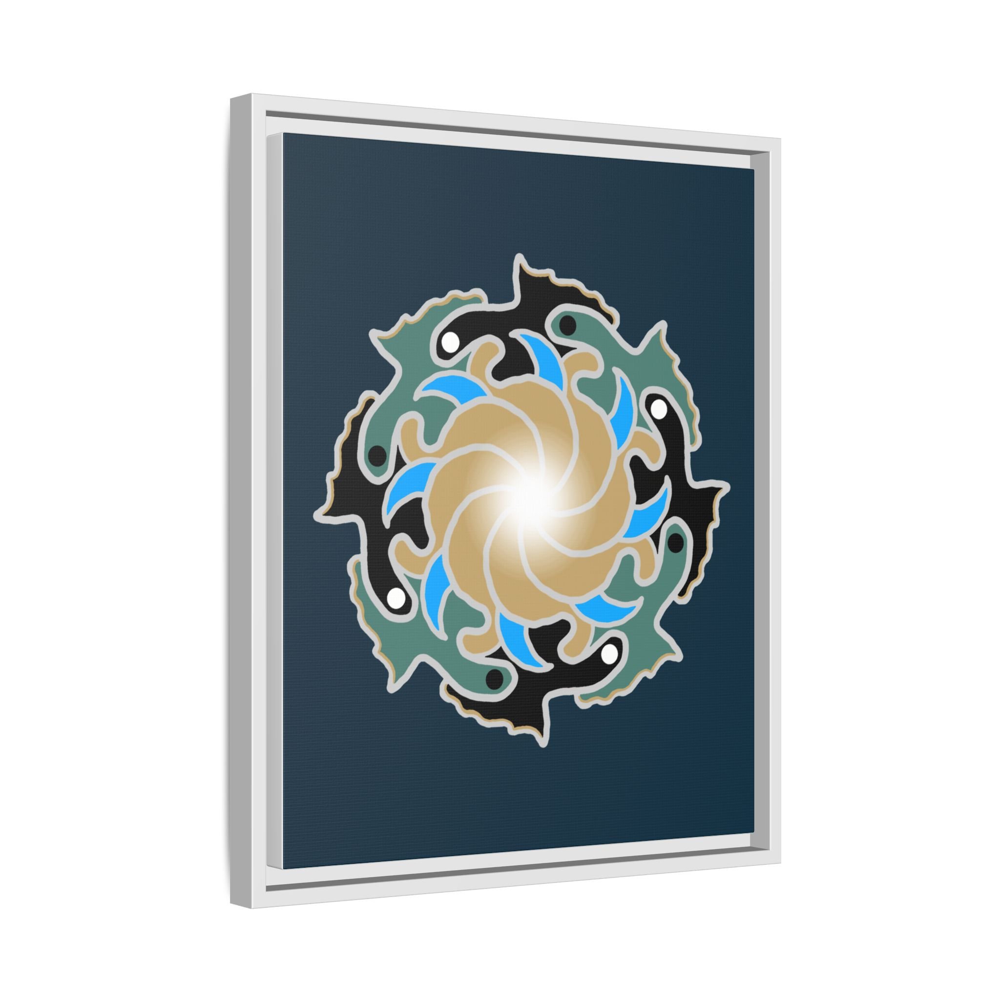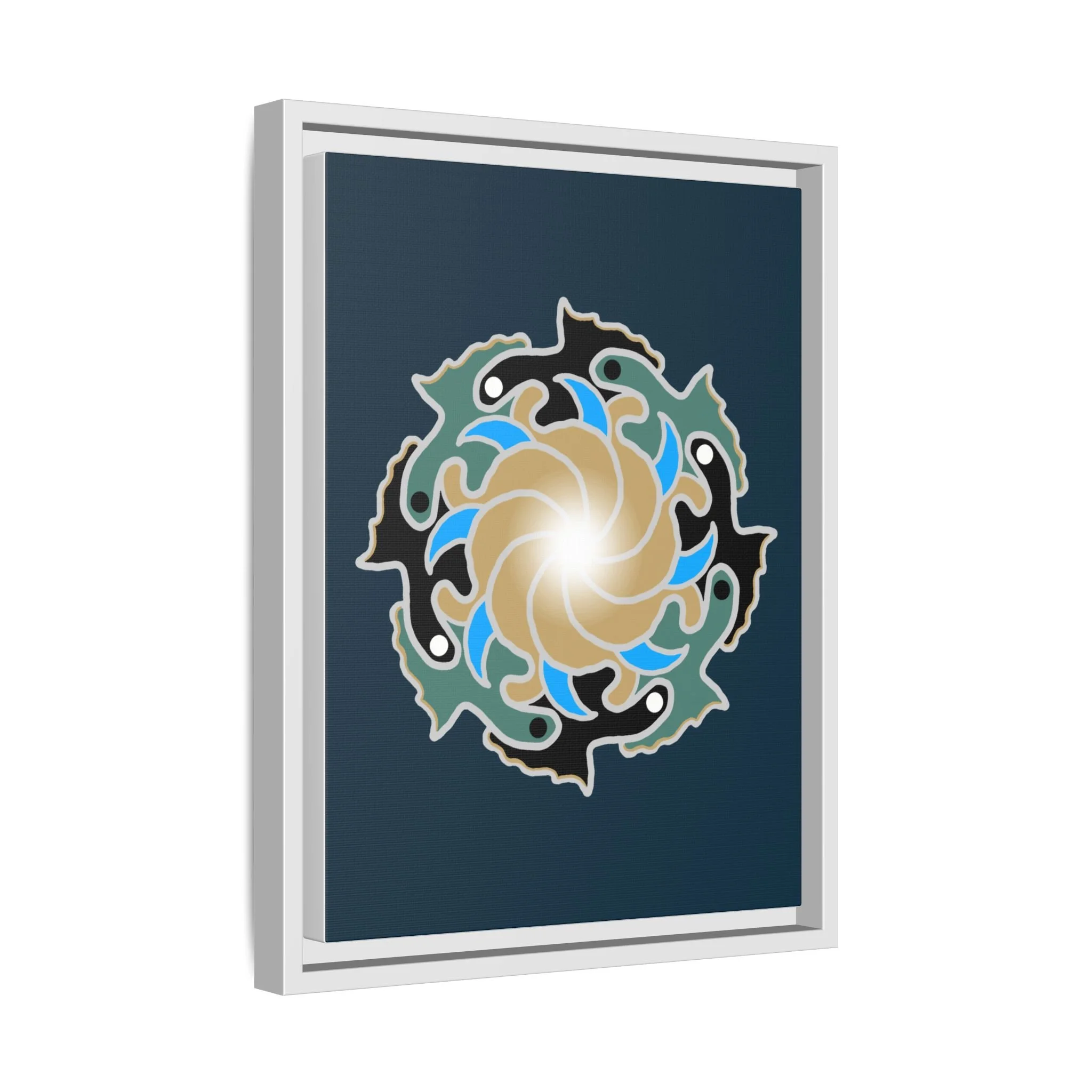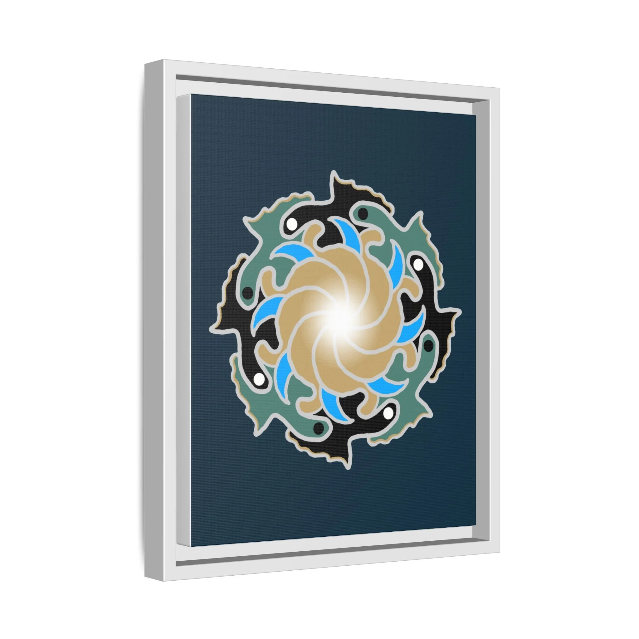 This matte canvas print is a study in dynamic contrast, featuring a golden vortex surrounded by abstract shapes in azure blue, black, and seafoam green. The design balances chaotic energy with a structured center, representing the harmony found within complexity. Framed in a slim pine profile, it creates an energetic yet balanced focal point for a busy living room, a collaborative workspace, or a modern hallway.