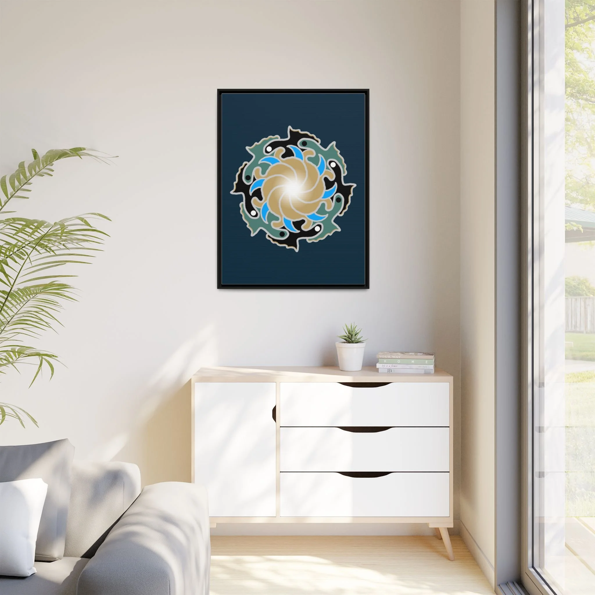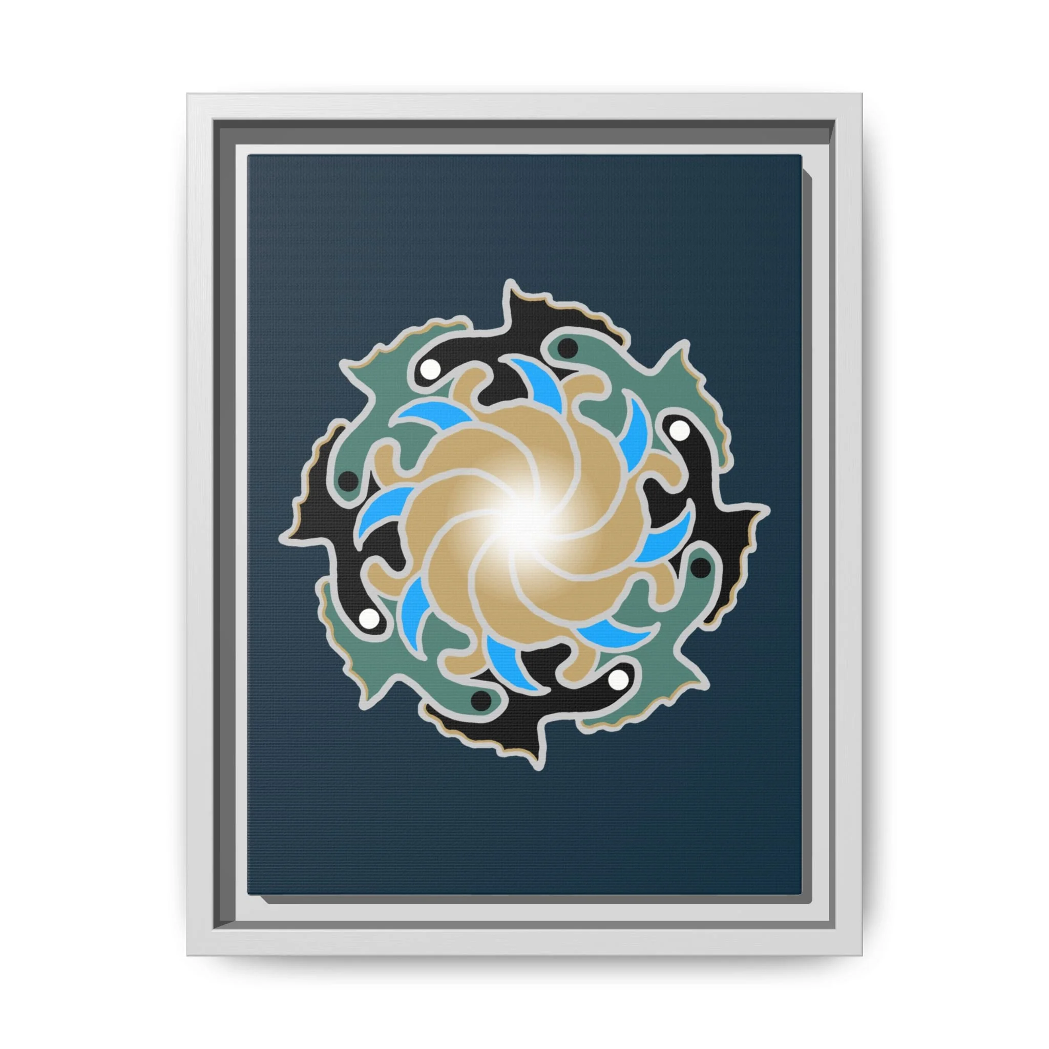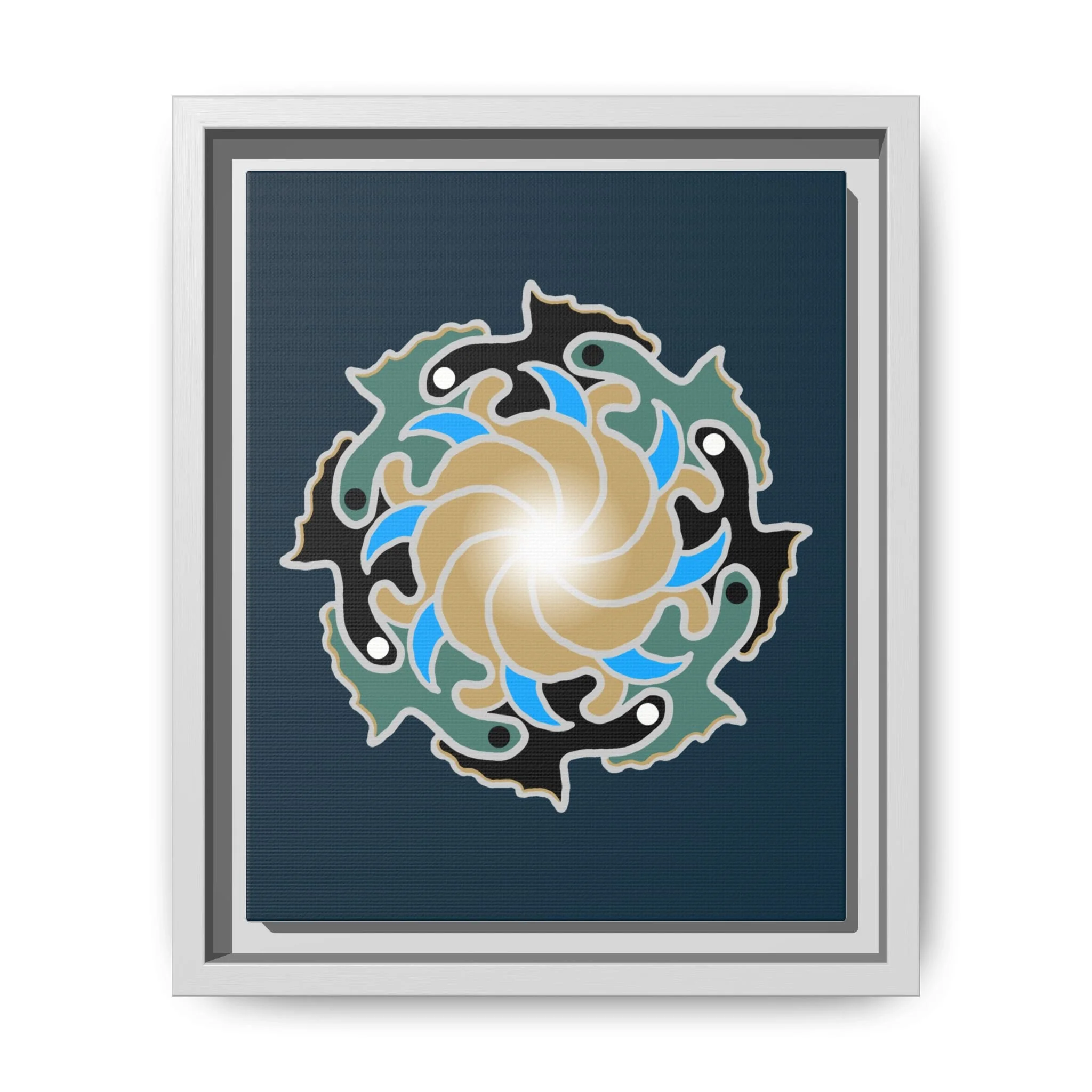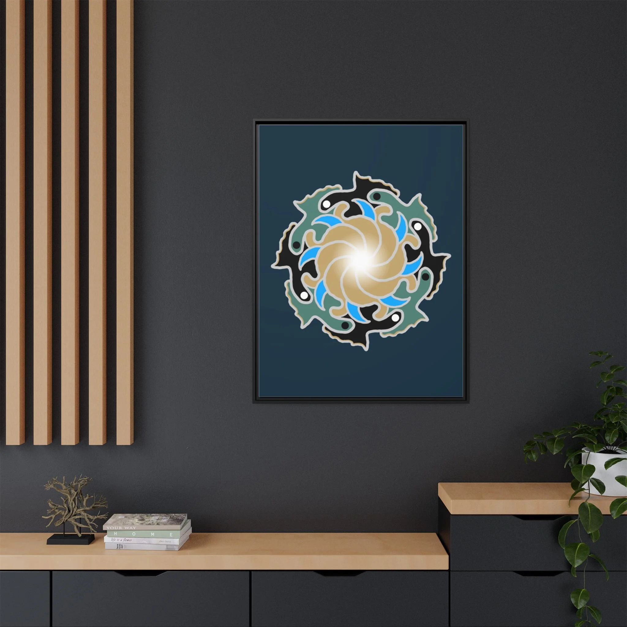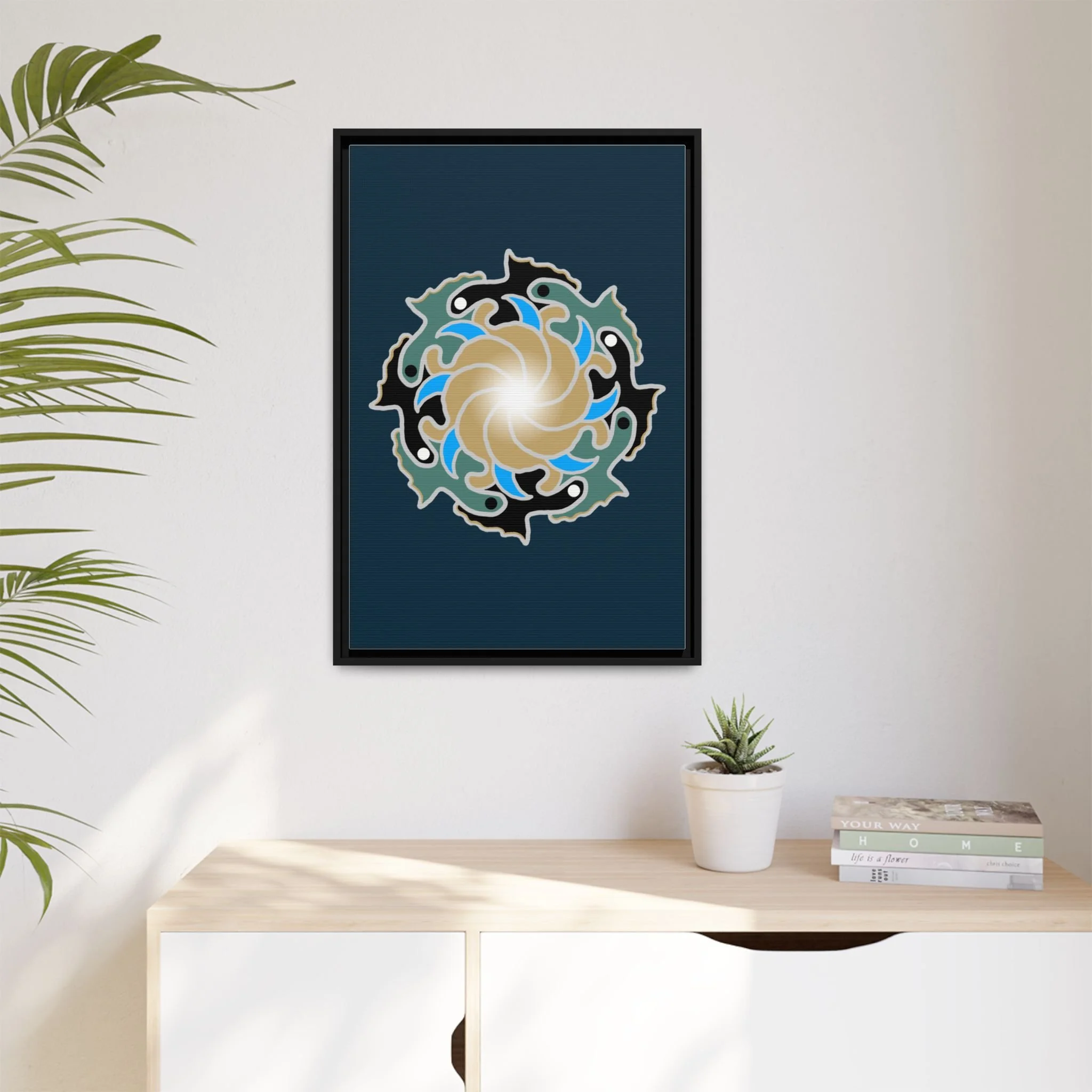 This matte canvas print is a study in dynamic contrast, featuring a golden vortex surrounded by abstract shapes in azure blue, black, and seafoam green. The design balances chaotic energy with a structured center, representing the harmony found within complexity. Framed in a slim pine profile, it creates an energetic yet balanced focal point for a busy living room, a collaborative workspace, or a modern hallway.