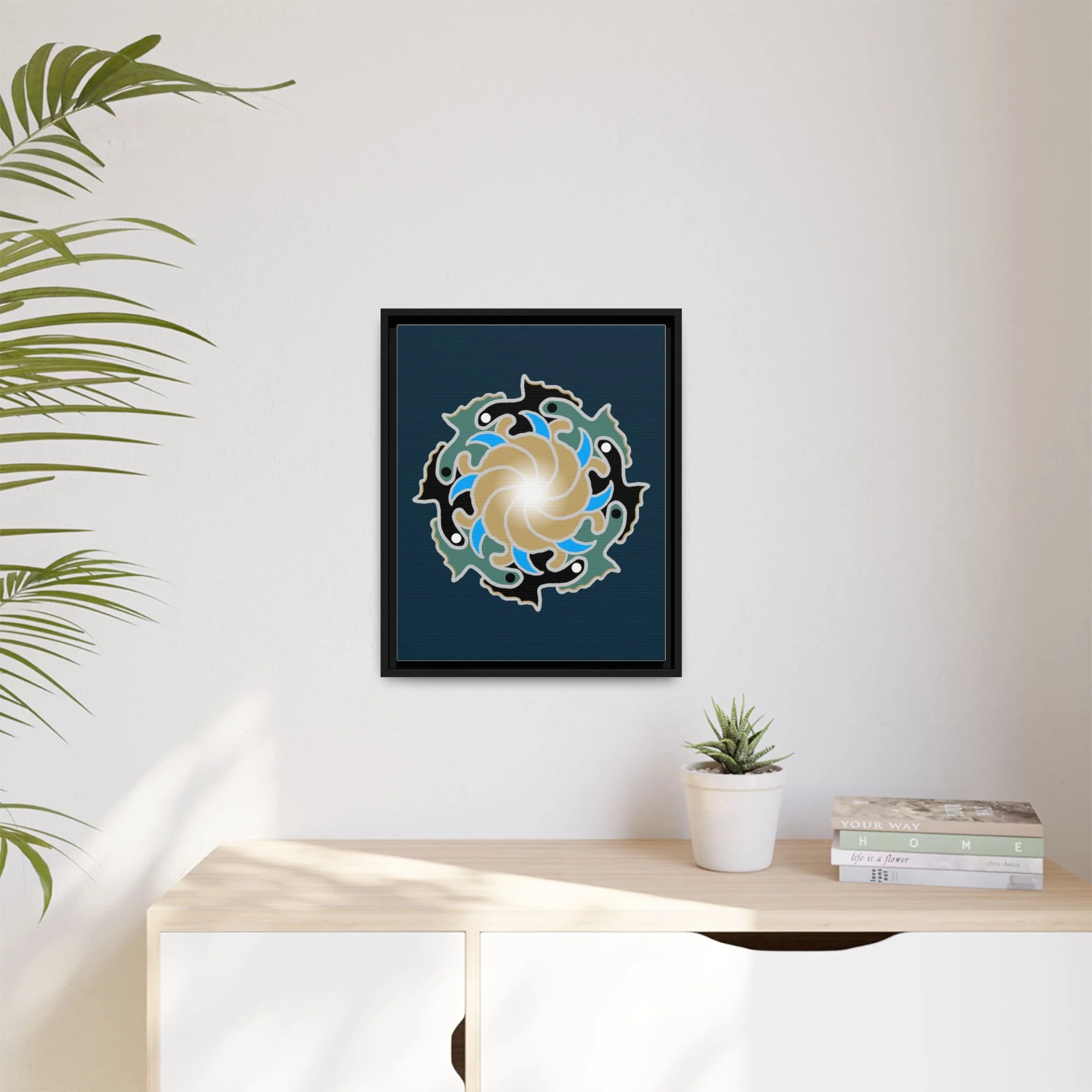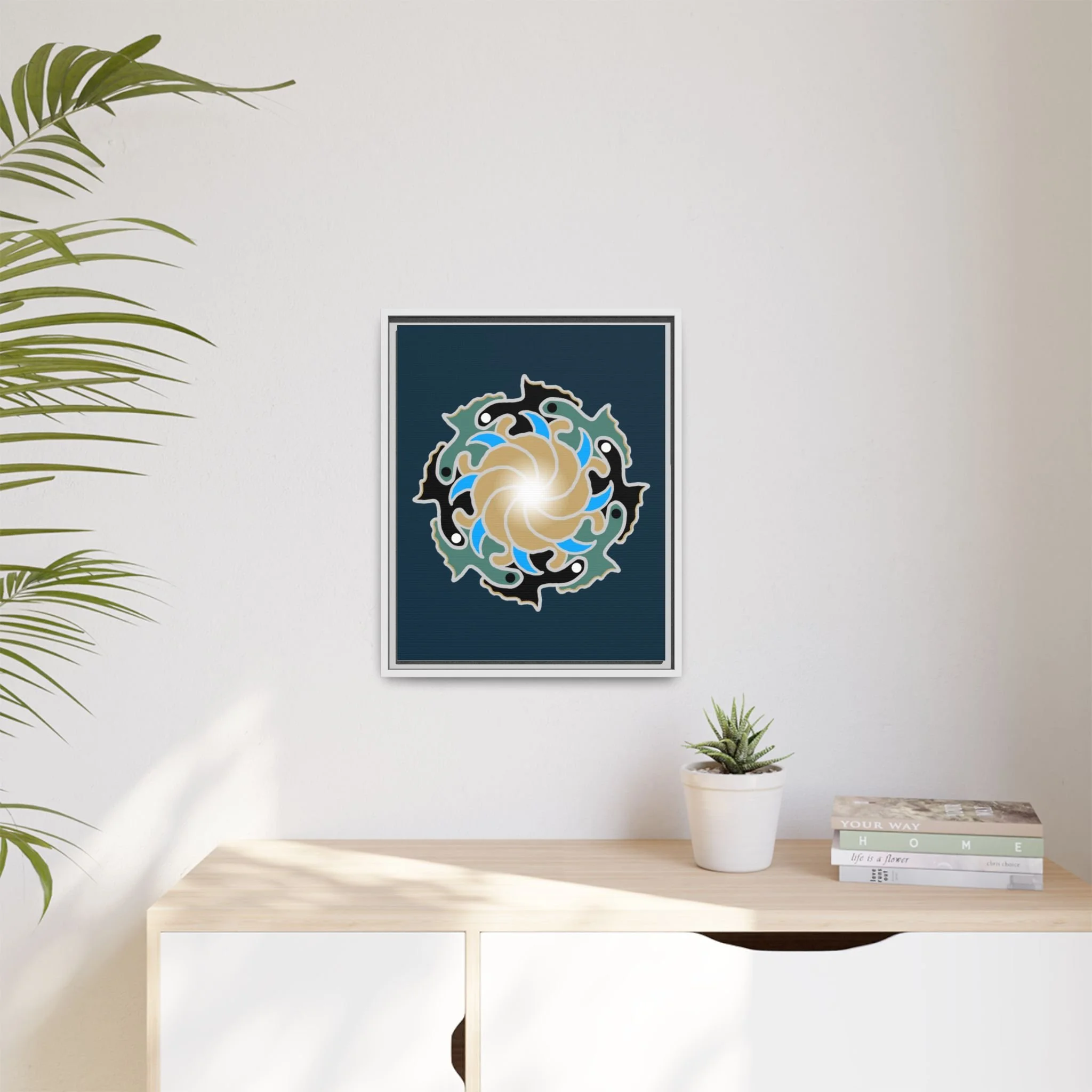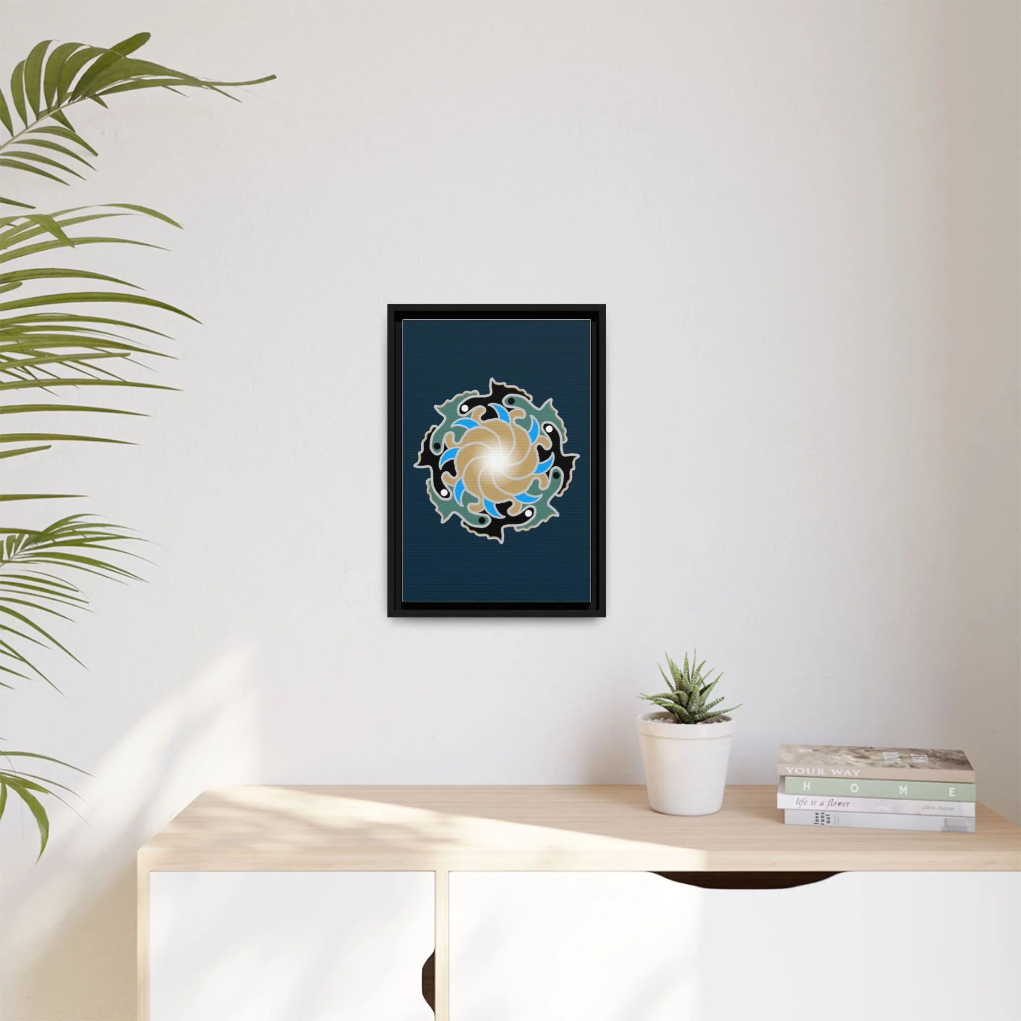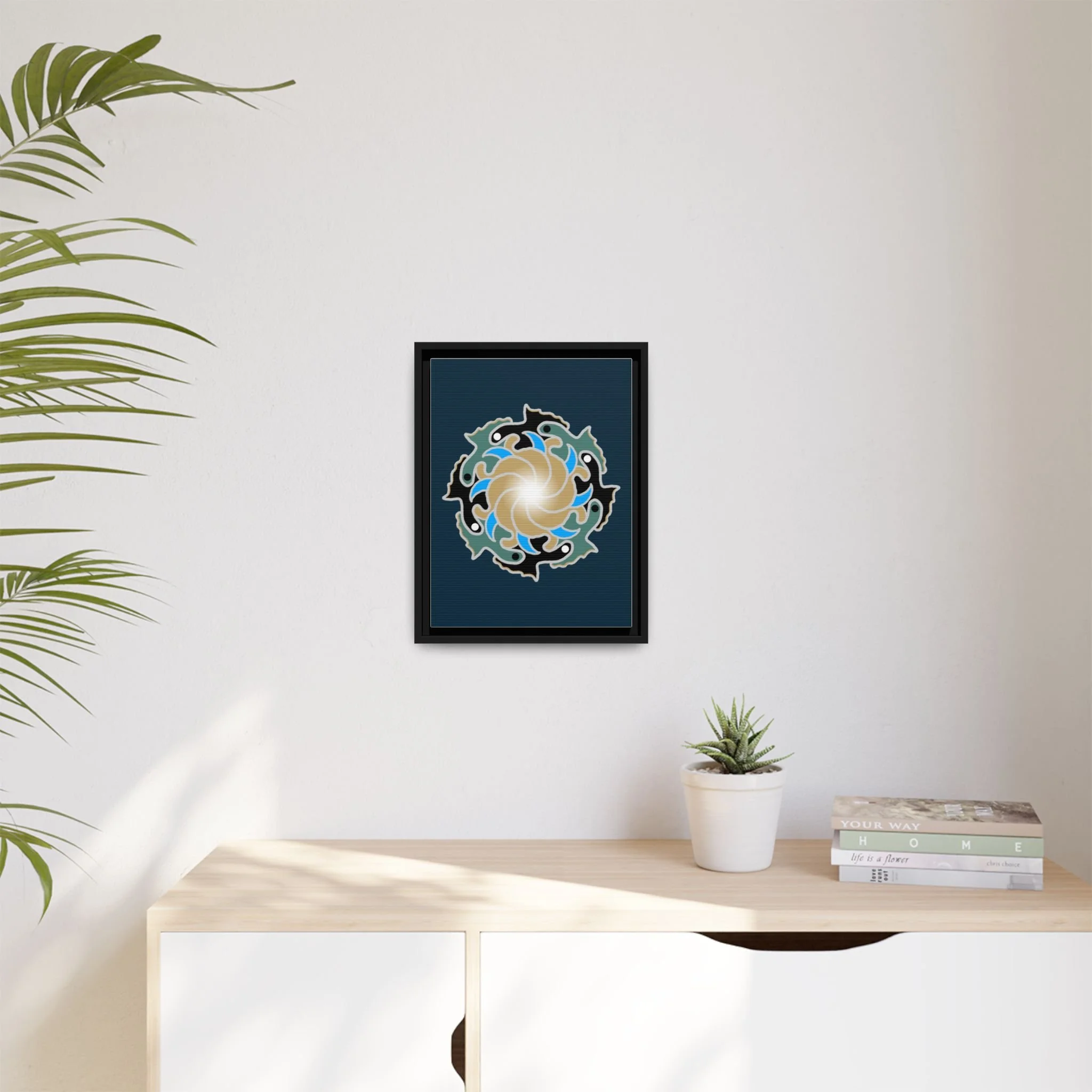 This framed canvas suits anyone who curates calm: people building a tranquil home, studio owners aiming for a soothing backdrop, or friends who value mindful, handmade decor. It complements moments like relaxed weekend mornings, intimate gatherings, or a quiet evening of journaling and tea.