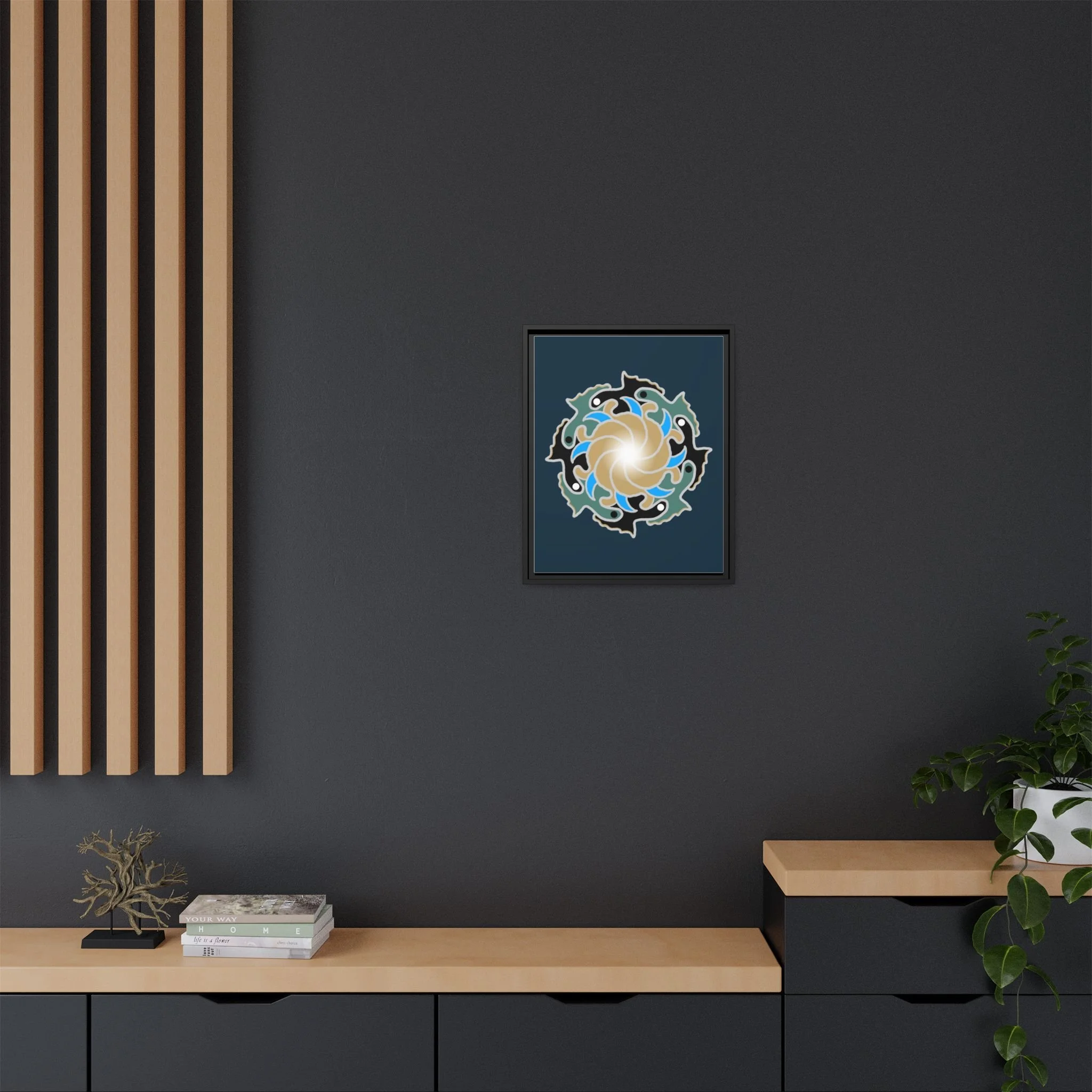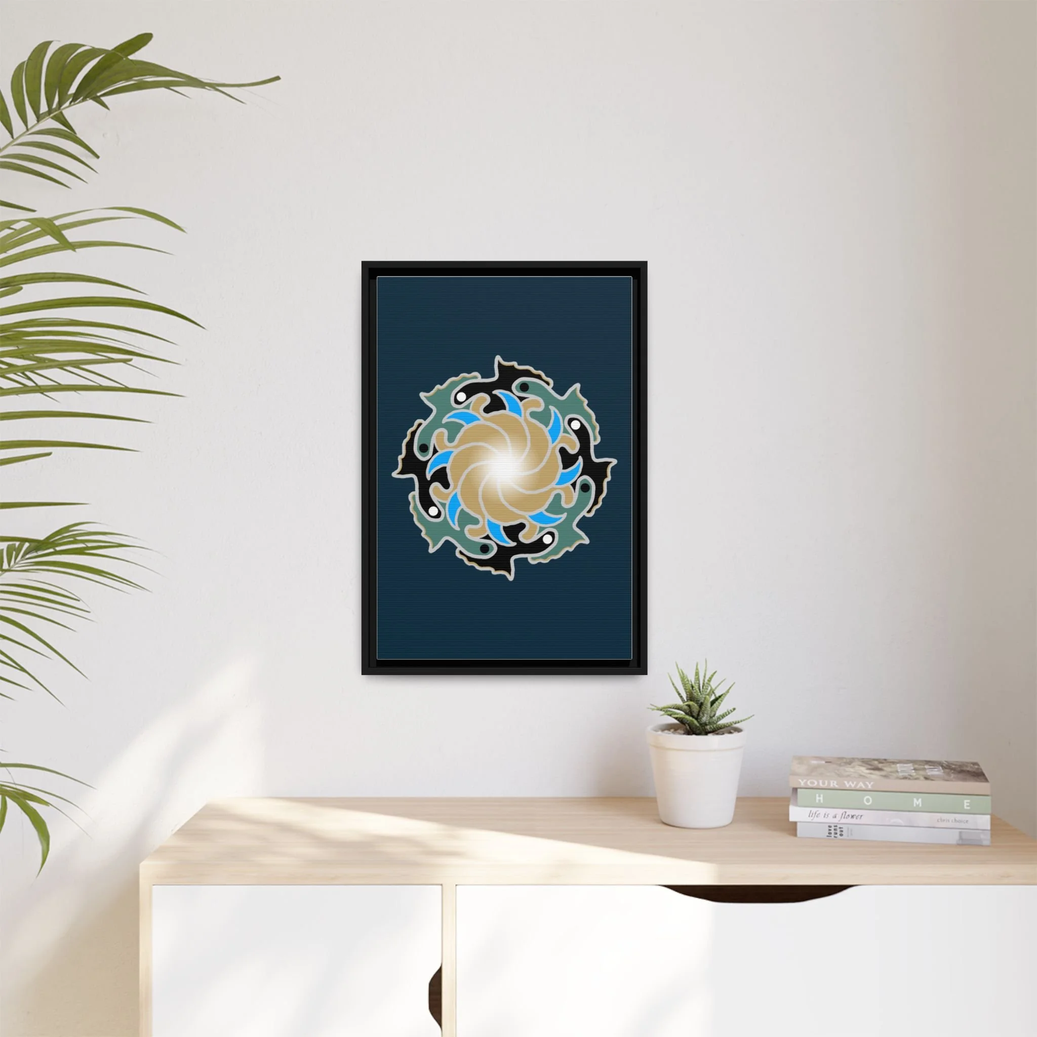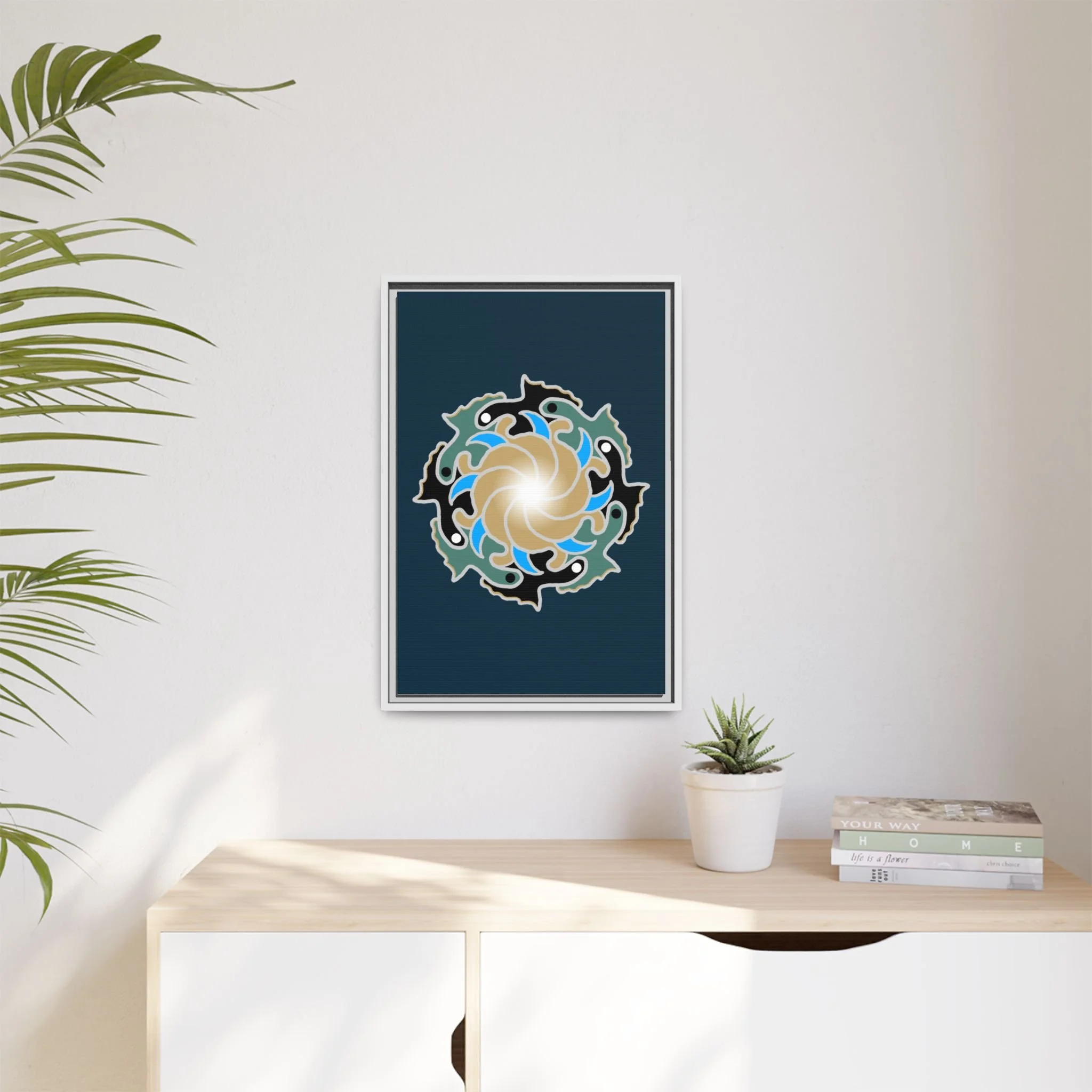 This framed canvas suits anyone who curates calm: people building a tranquil home, studio owners aiming for a soothing backdrop, or friends who value mindful, handmade decor. It complements moments like relaxed weekend mornings, intimate gatherings, or a quiet evening of journaling and tea.