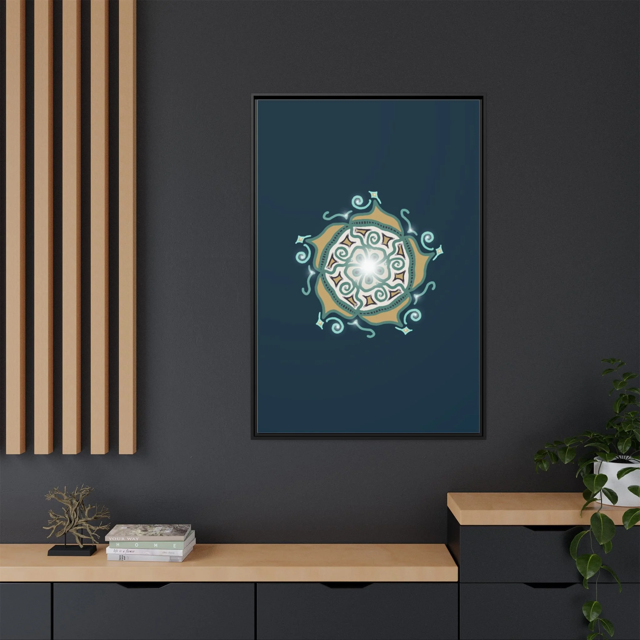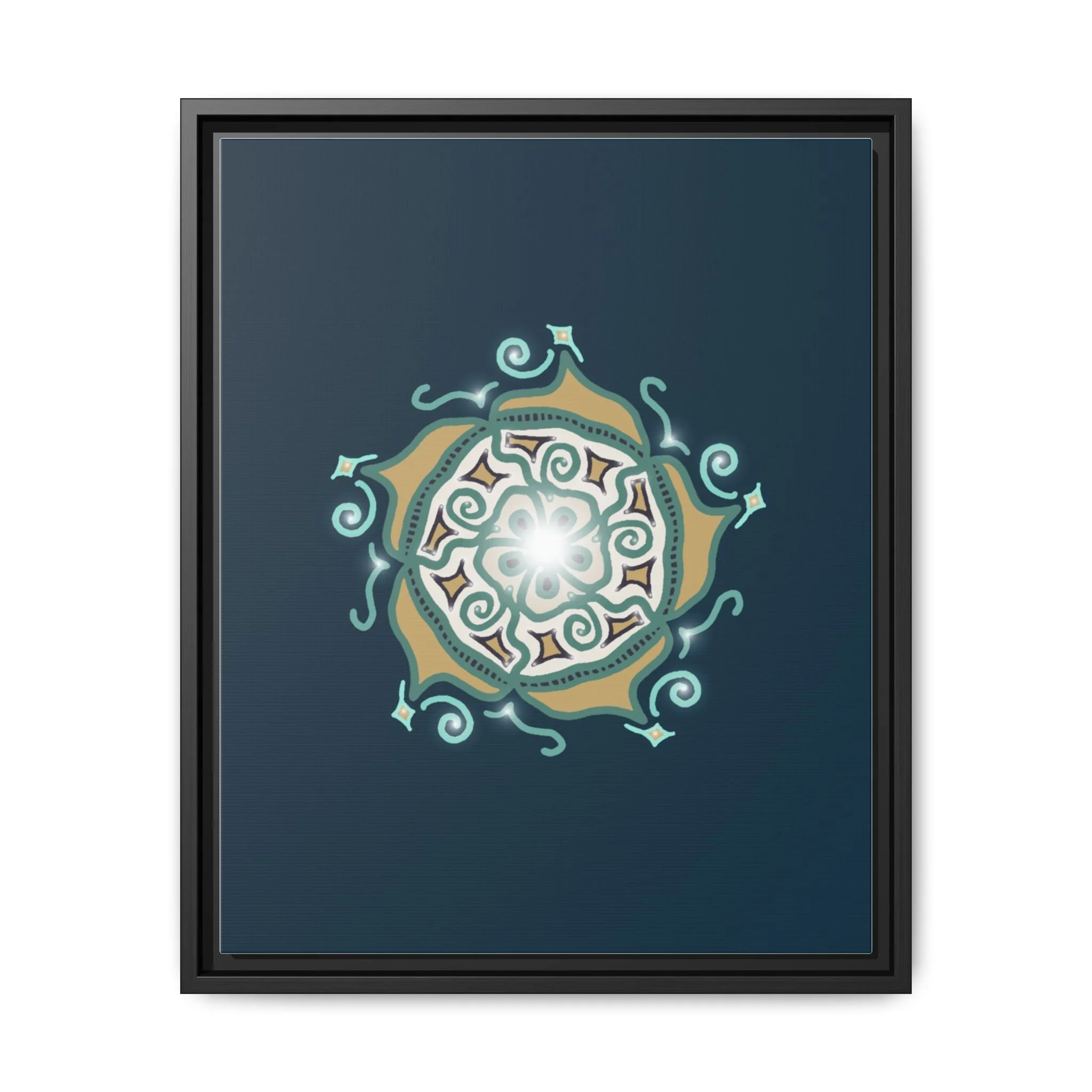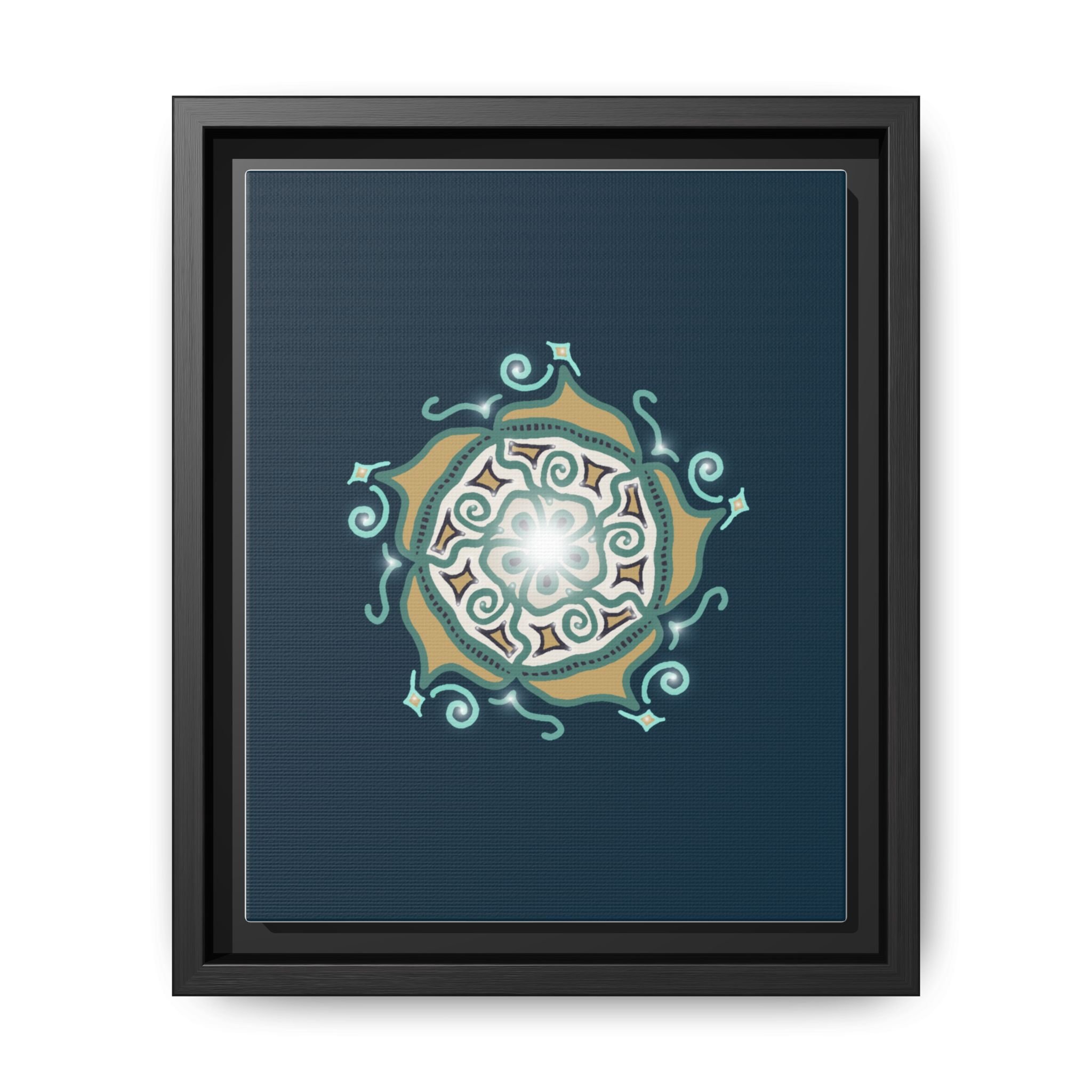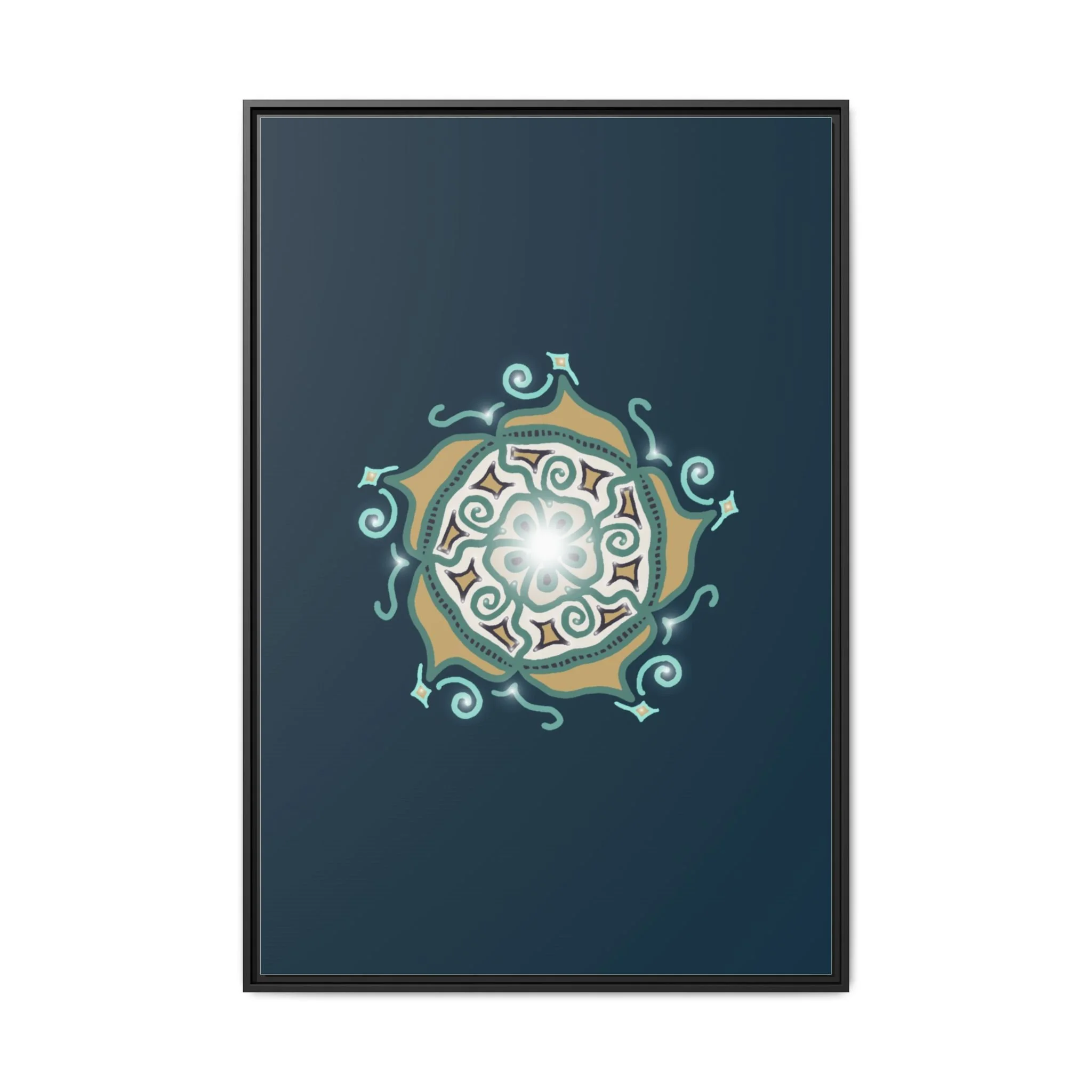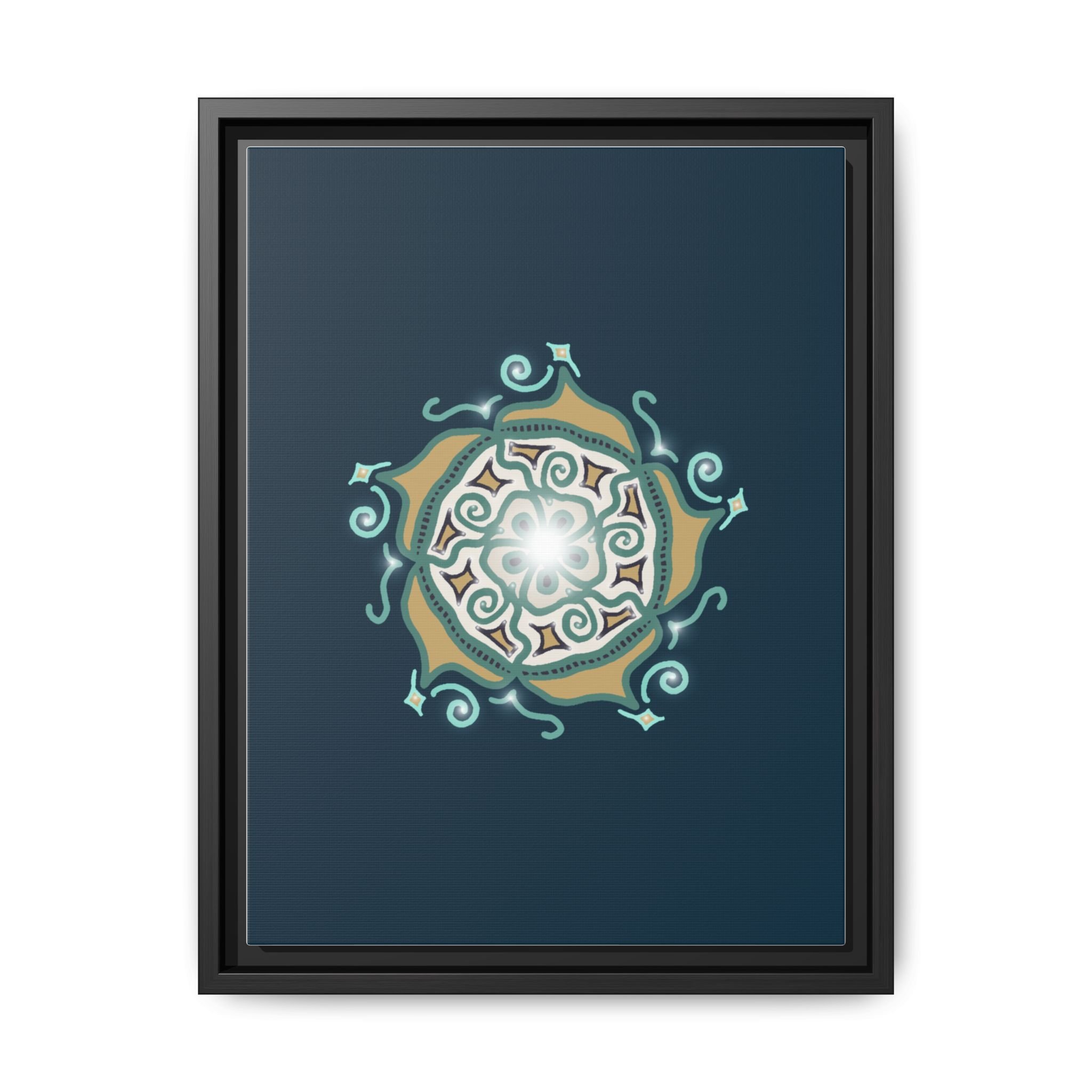 This matte canvas print offers a sense of guidance and depth with its rich dark teal background and striking star-like mandala. The gold and cream geometric patterns radiate outward like a compass or a celestial body, creating a meditative focal point that encourages focus and clarity. Framed in a slim pine profile, the piece reads bold yet serene — it anchors a modern living room, a focused study, or a quiet night-time retreat.