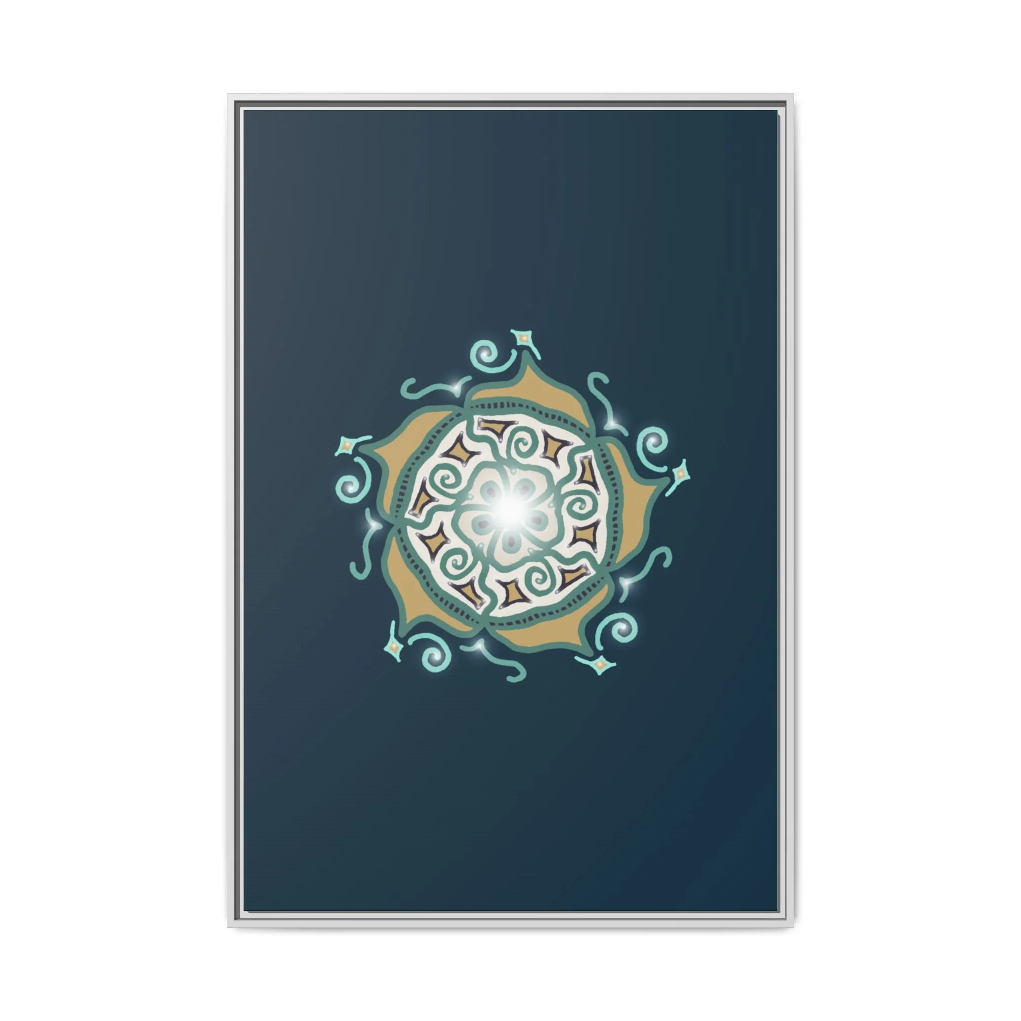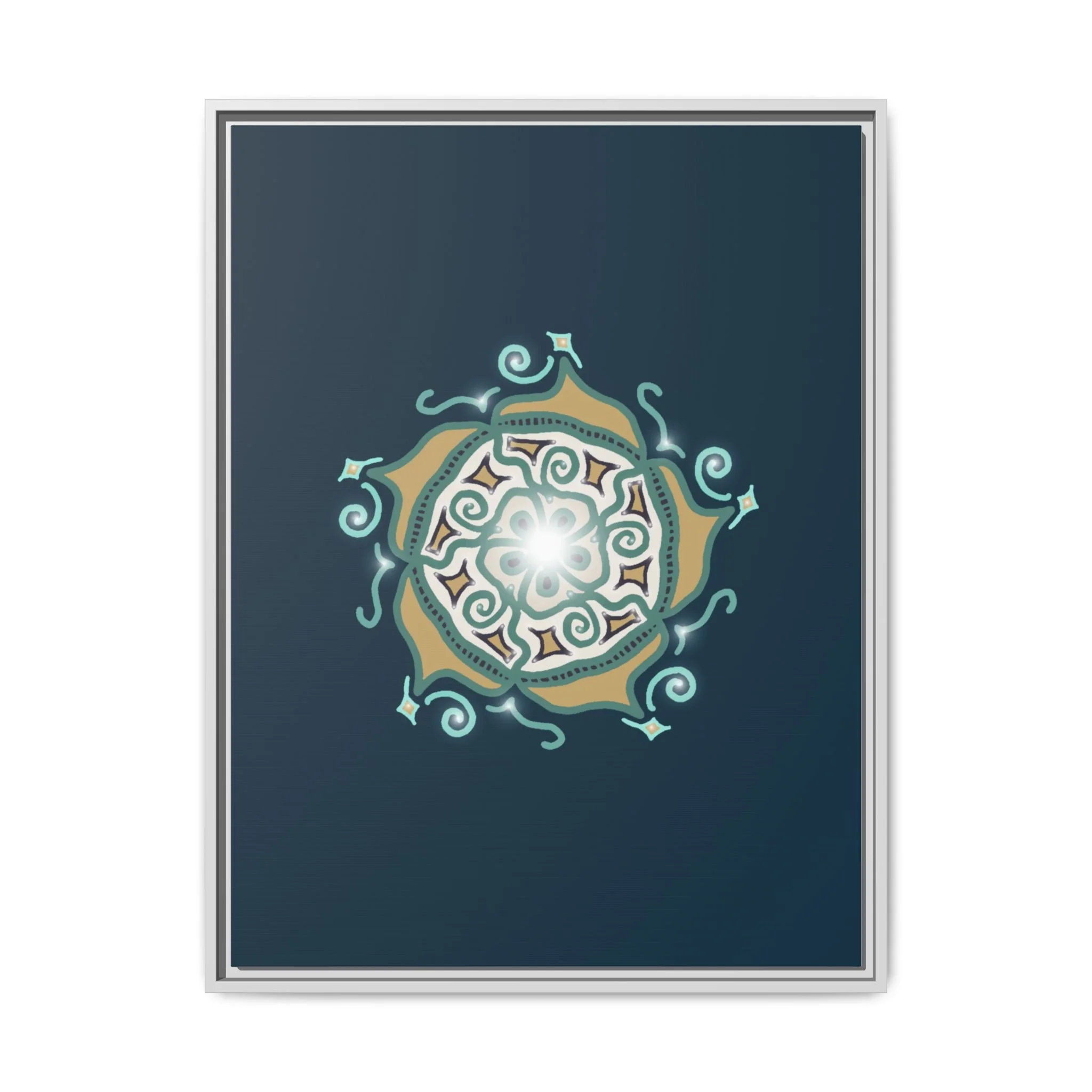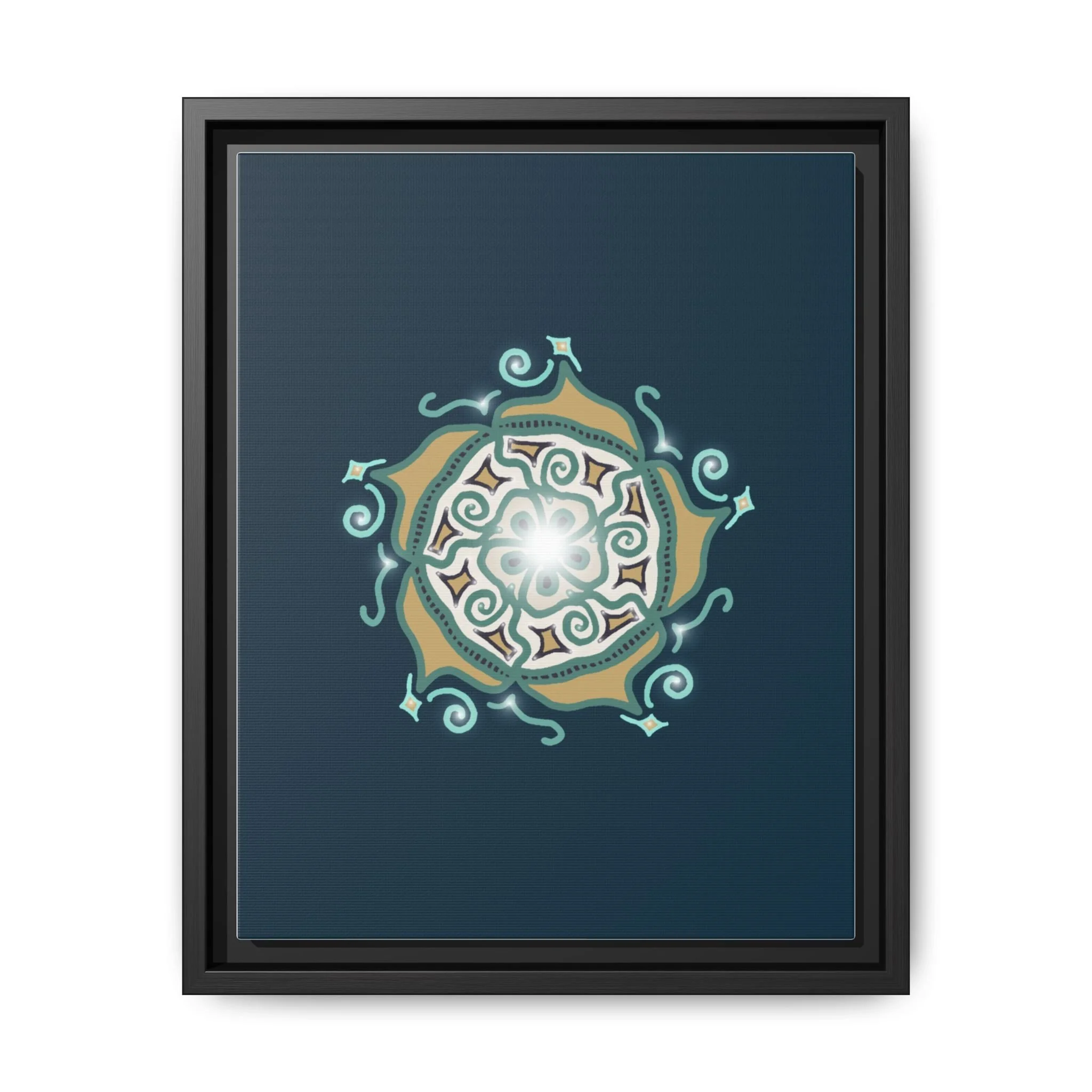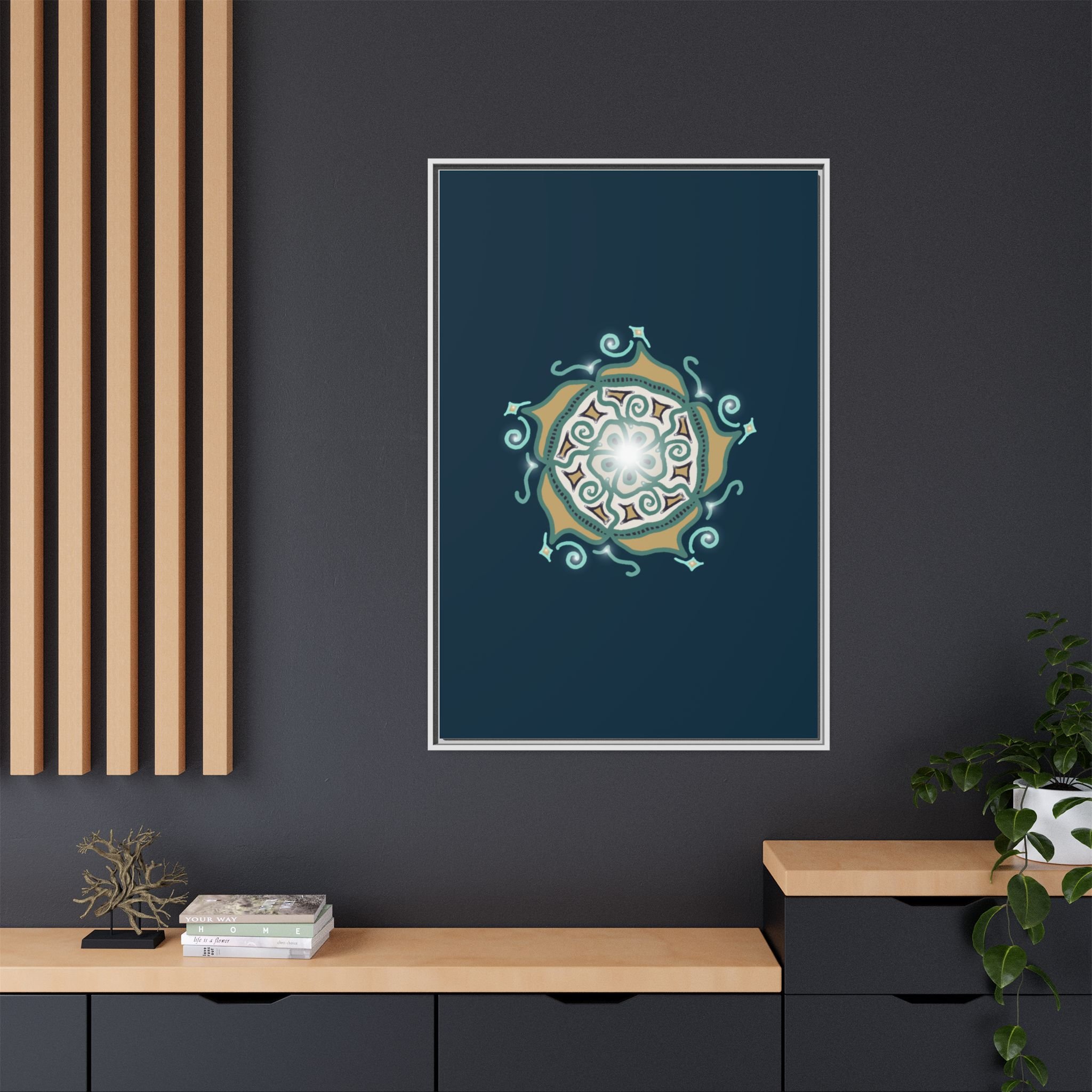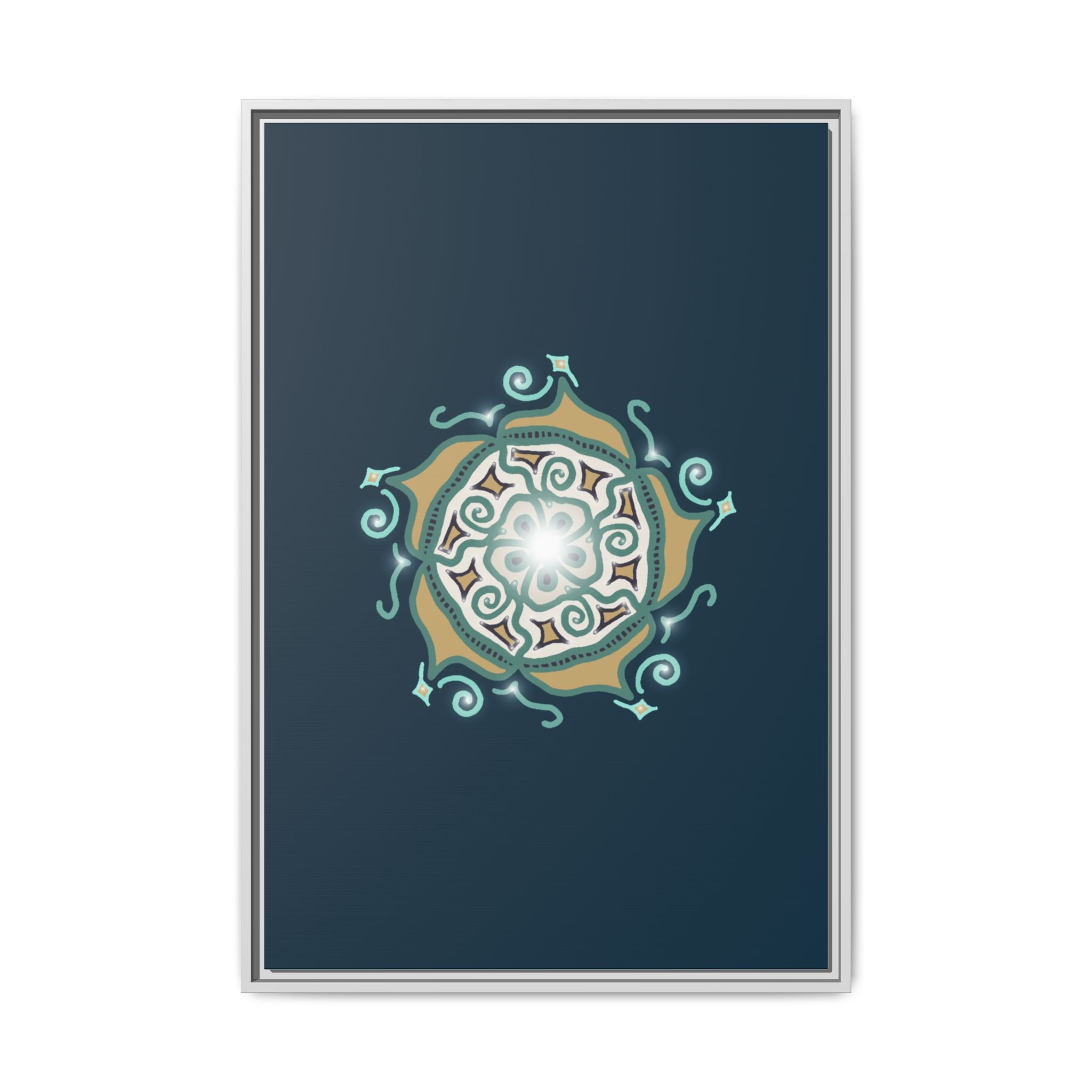 This matte canvas print offers a sense of guidance and depth with its rich dark teal background and striking star-like mandala. The gold and cream geometric patterns radiate outward like a compass or a celestial body, creating a meditative focal point that encourages focus and clarity. Framed in a slim pine profile, the piece reads bold yet serene — it anchors a modern living room, a focused study, or a quiet night-time retreat.