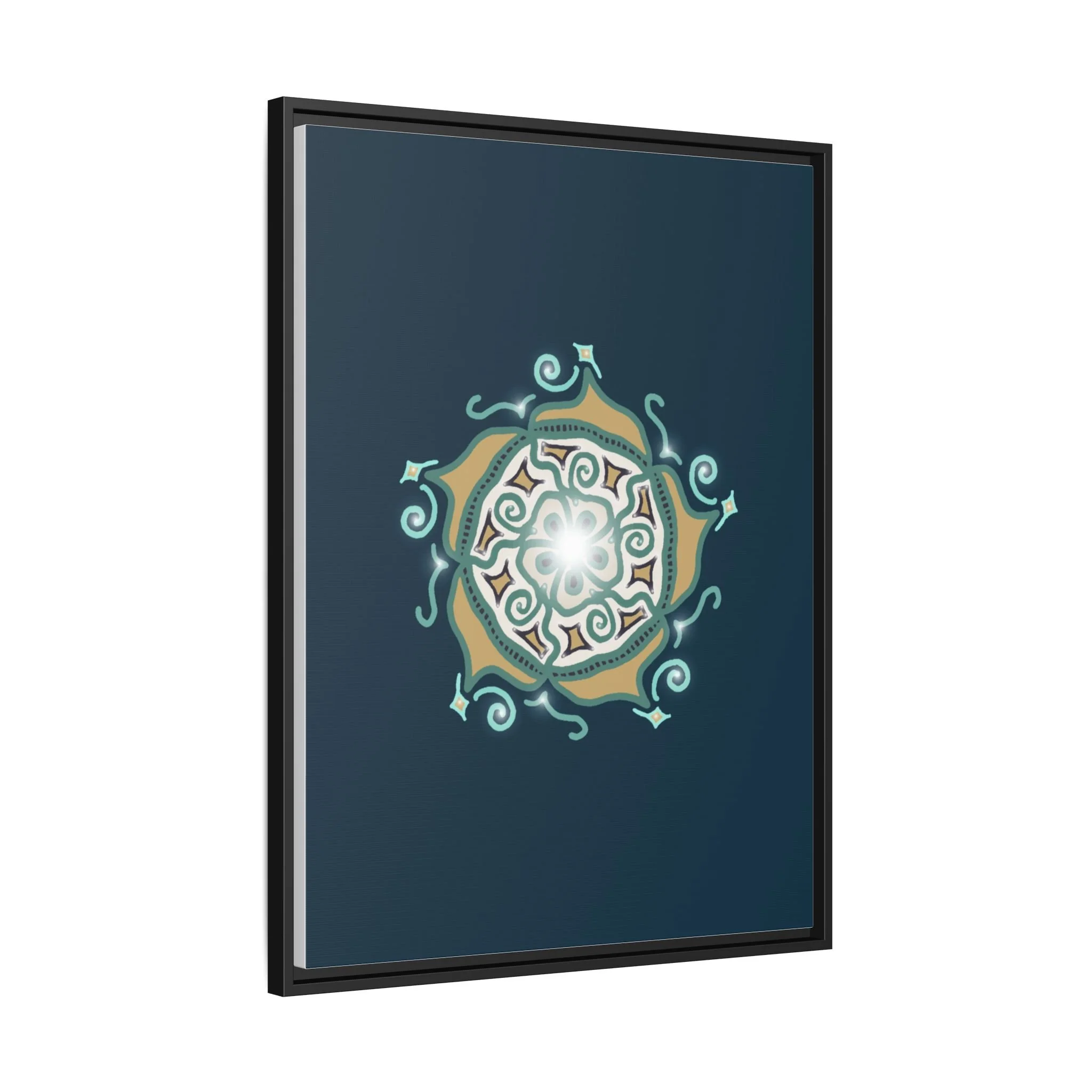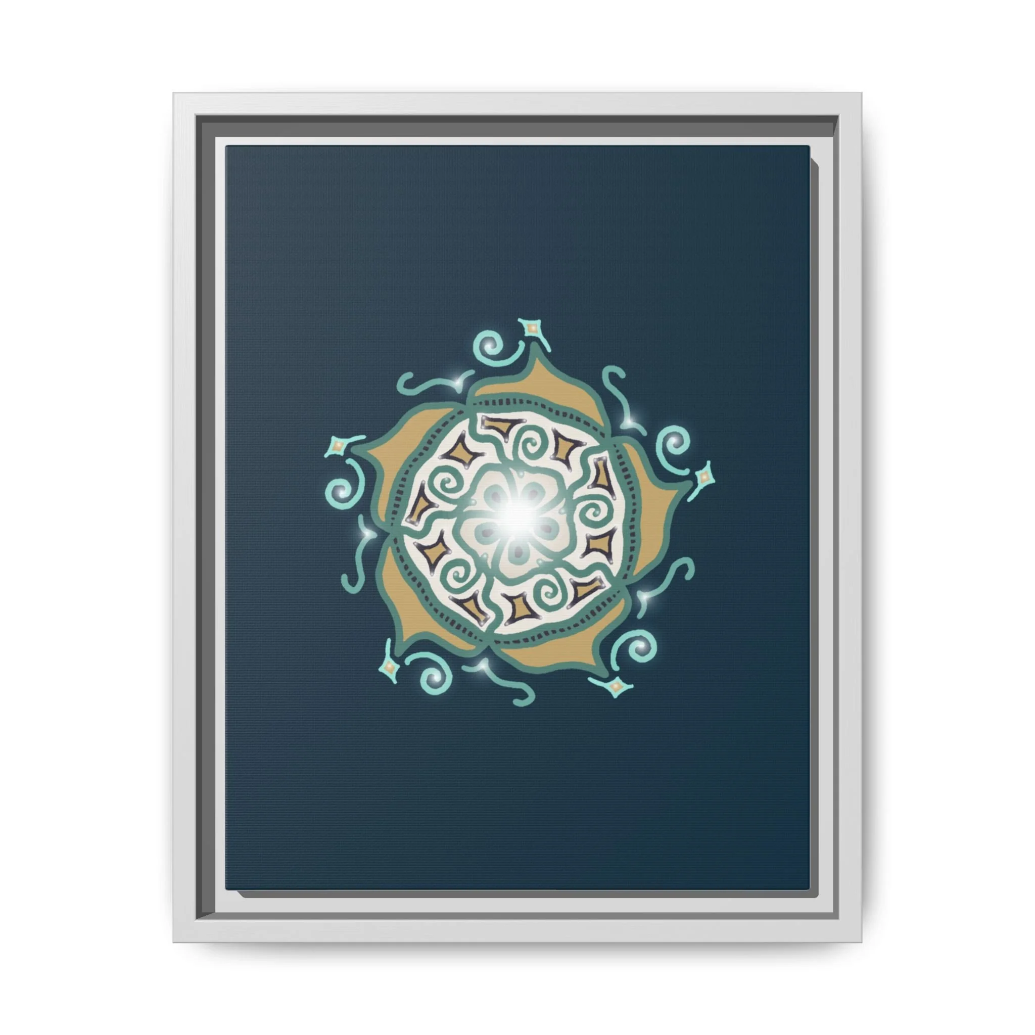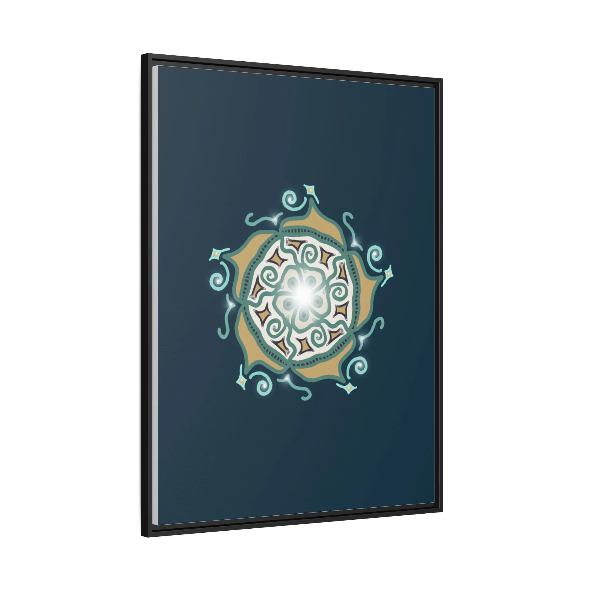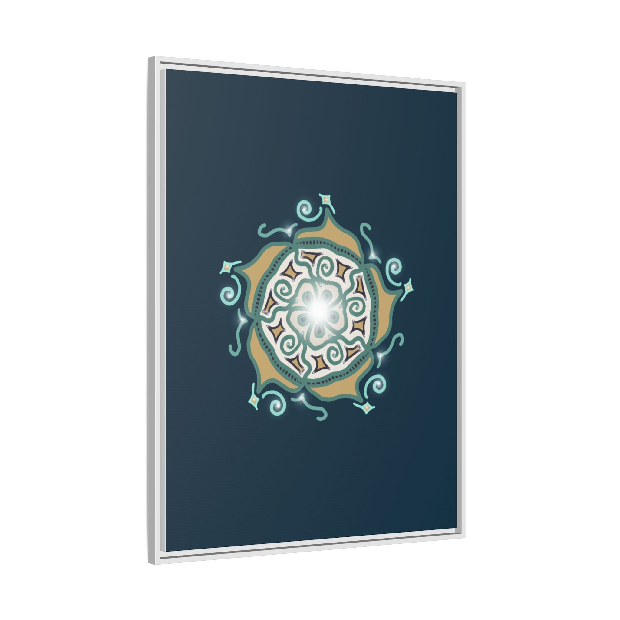 This matte canvas print offers a sense of guidance and depth with its rich dark teal background and striking star-like mandala. The gold and cream geometric patterns radiate outward like a compass or a celestial body, creating a meditative focal point that encourages focus and clarity. Framed in a slim pine profile, the piece reads bold yet serene — it anchors a modern living room, a focused study, or a quiet night-time retreat.