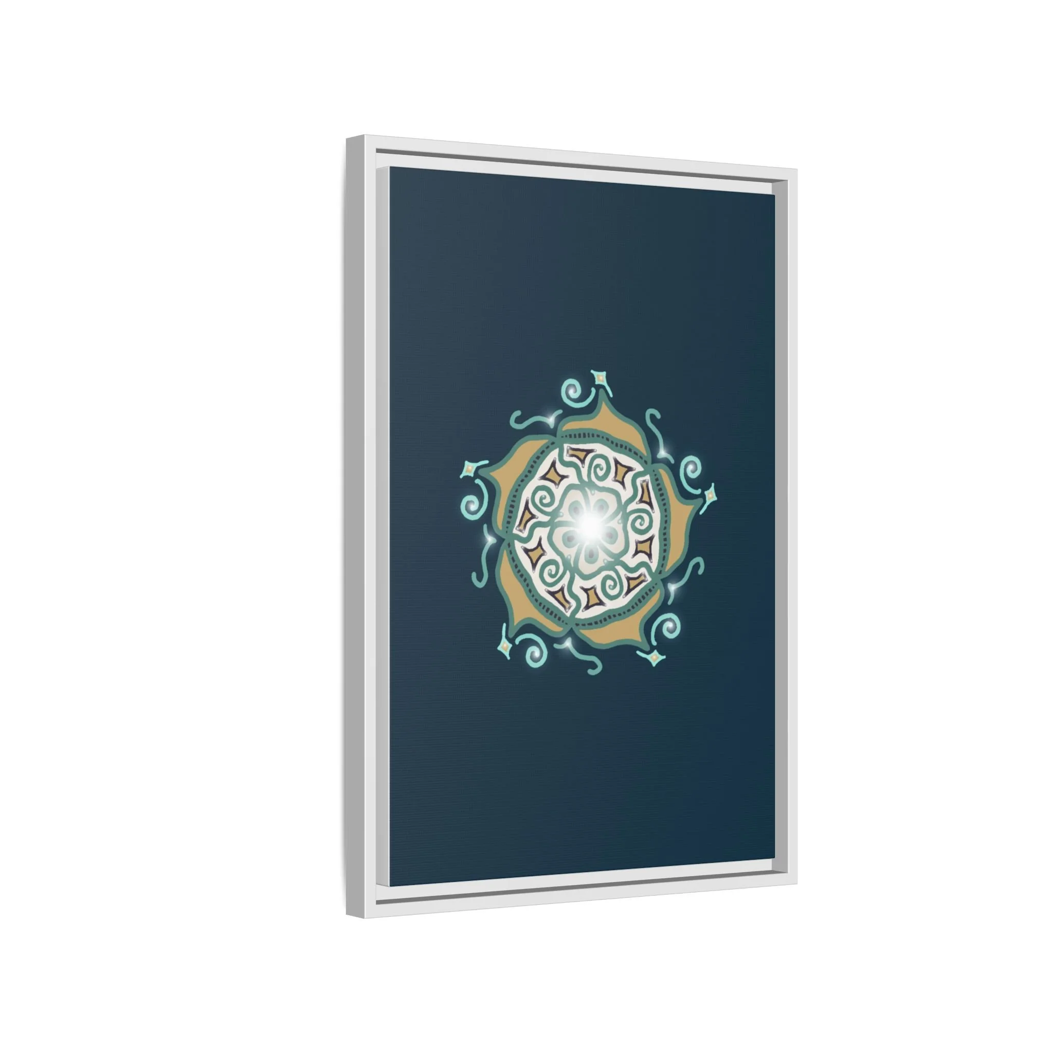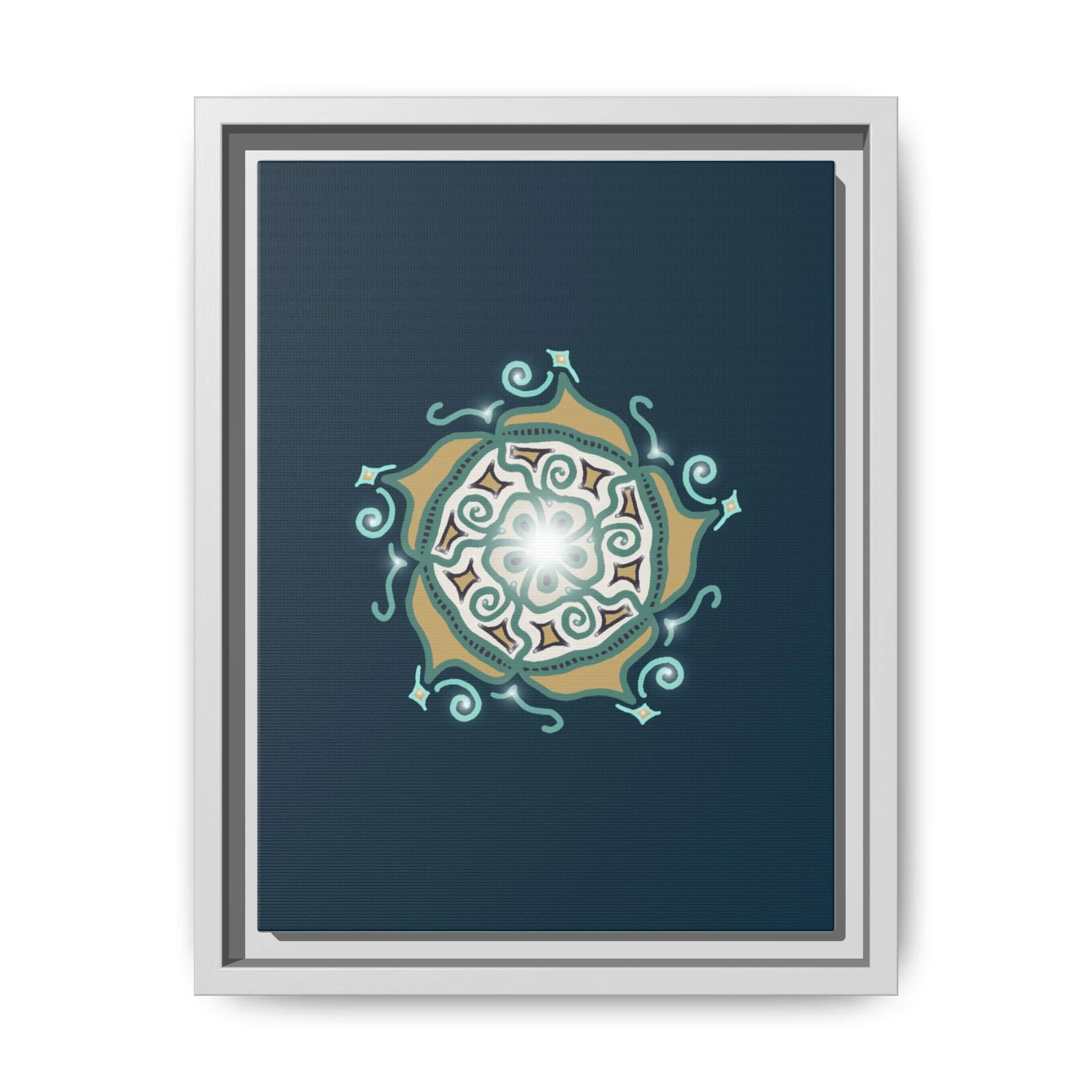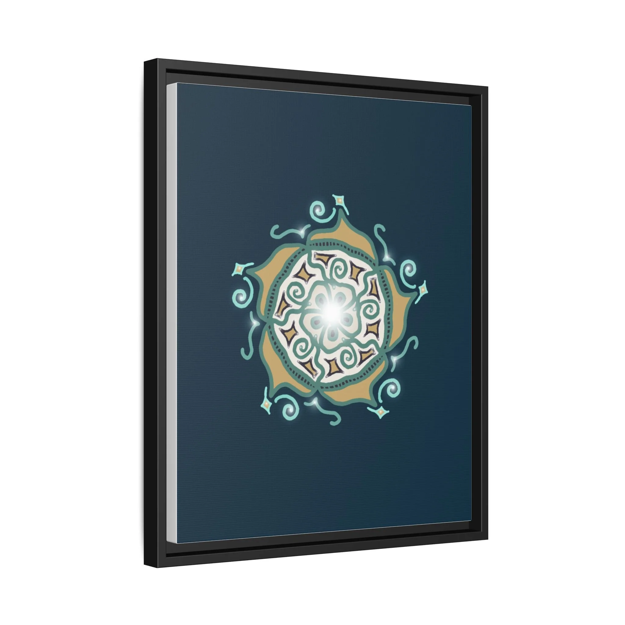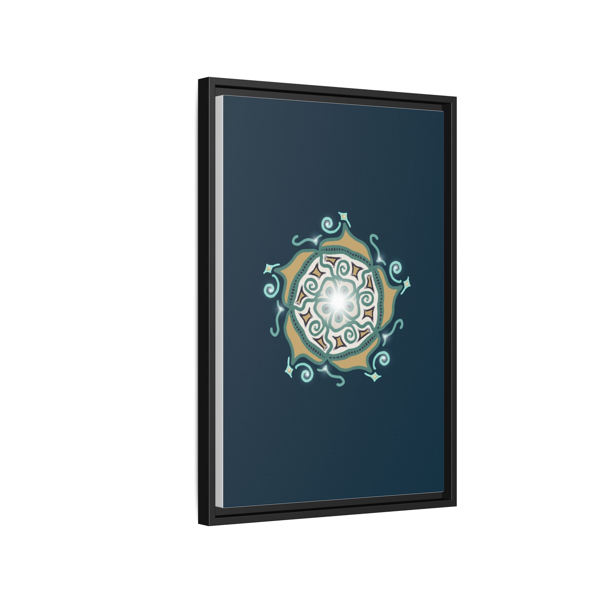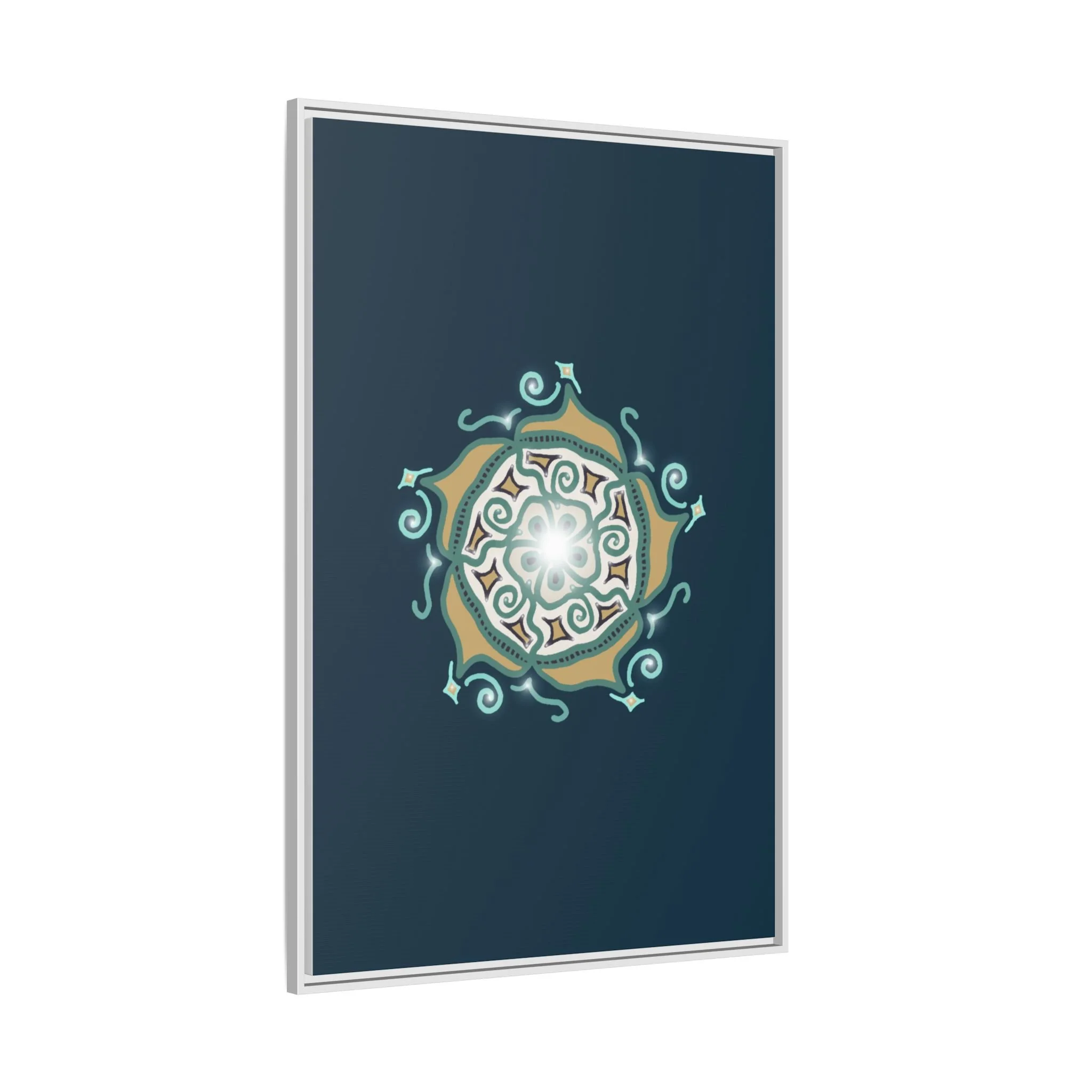 This matte canvas print offers a sense of guidance and depth with its rich dark teal background and striking star-like mandala. The gold and cream geometric patterns radiate outward like a compass or a celestial body, creating a meditative focal point that encourages focus and clarity. Framed in a slim pine profile, the piece reads bold yet serene — it anchors a modern living room, a focused study, or a quiet night-time retreat.