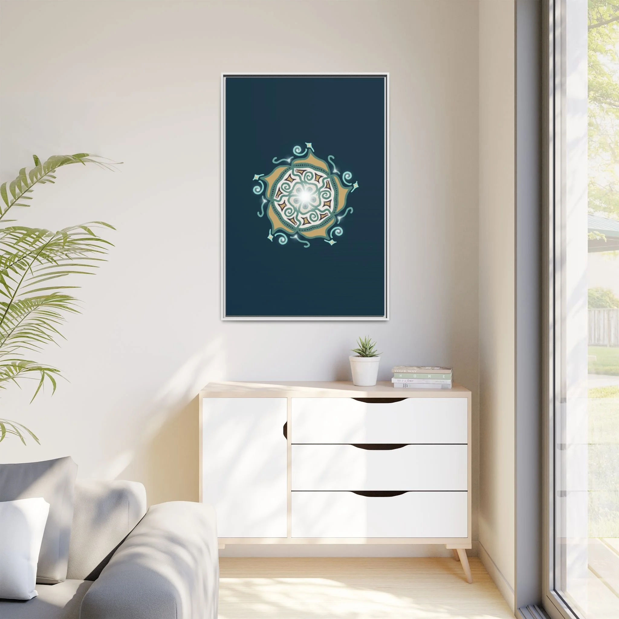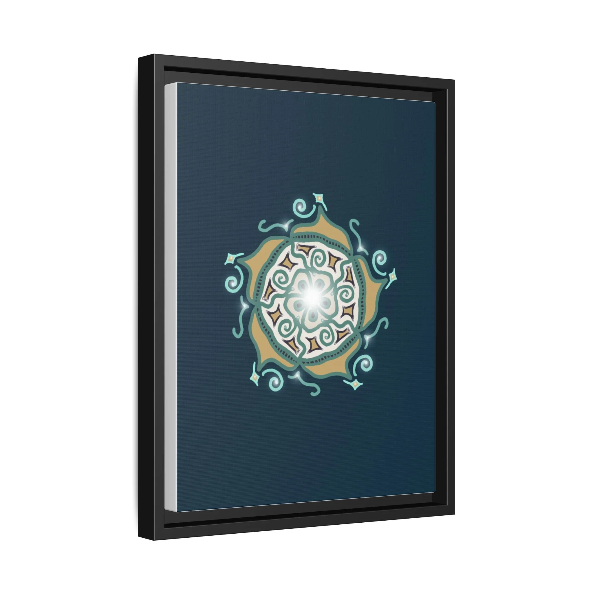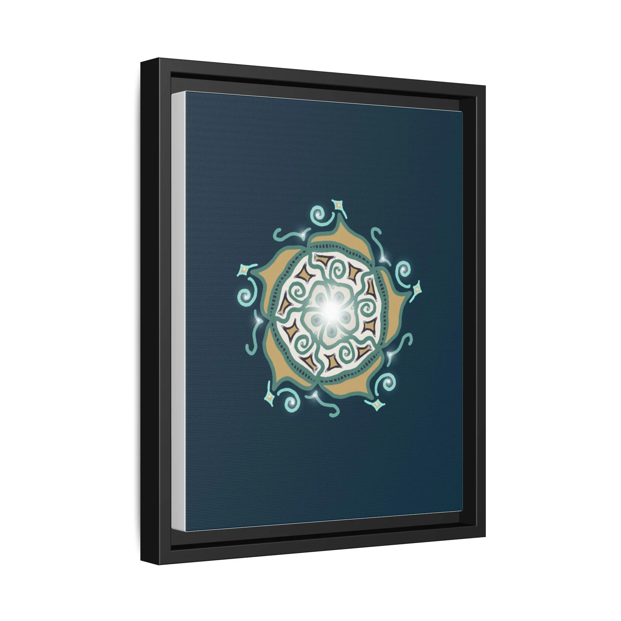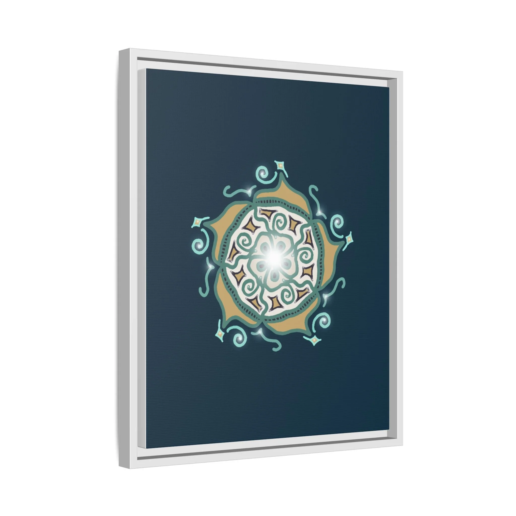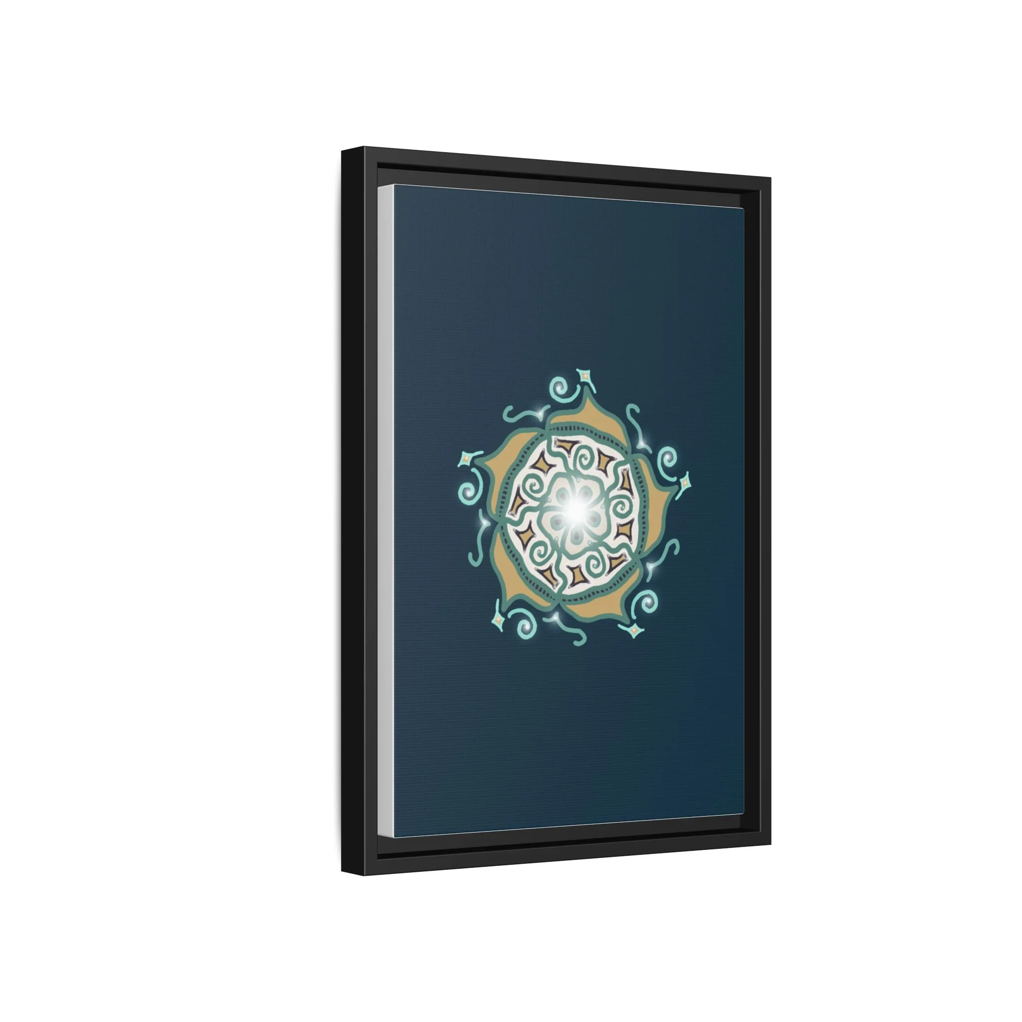 This matte canvas print offers a sense of guidance and depth with its rich dark teal background and striking star-like mandala. The gold and cream geometric patterns radiate outward like a compass or a celestial body, creating a meditative focal point that encourages focus and clarity. Framed in a slim pine profile, the piece reads bold yet serene — it anchors a modern living room, a focused study, or a quiet night-time retreat.
