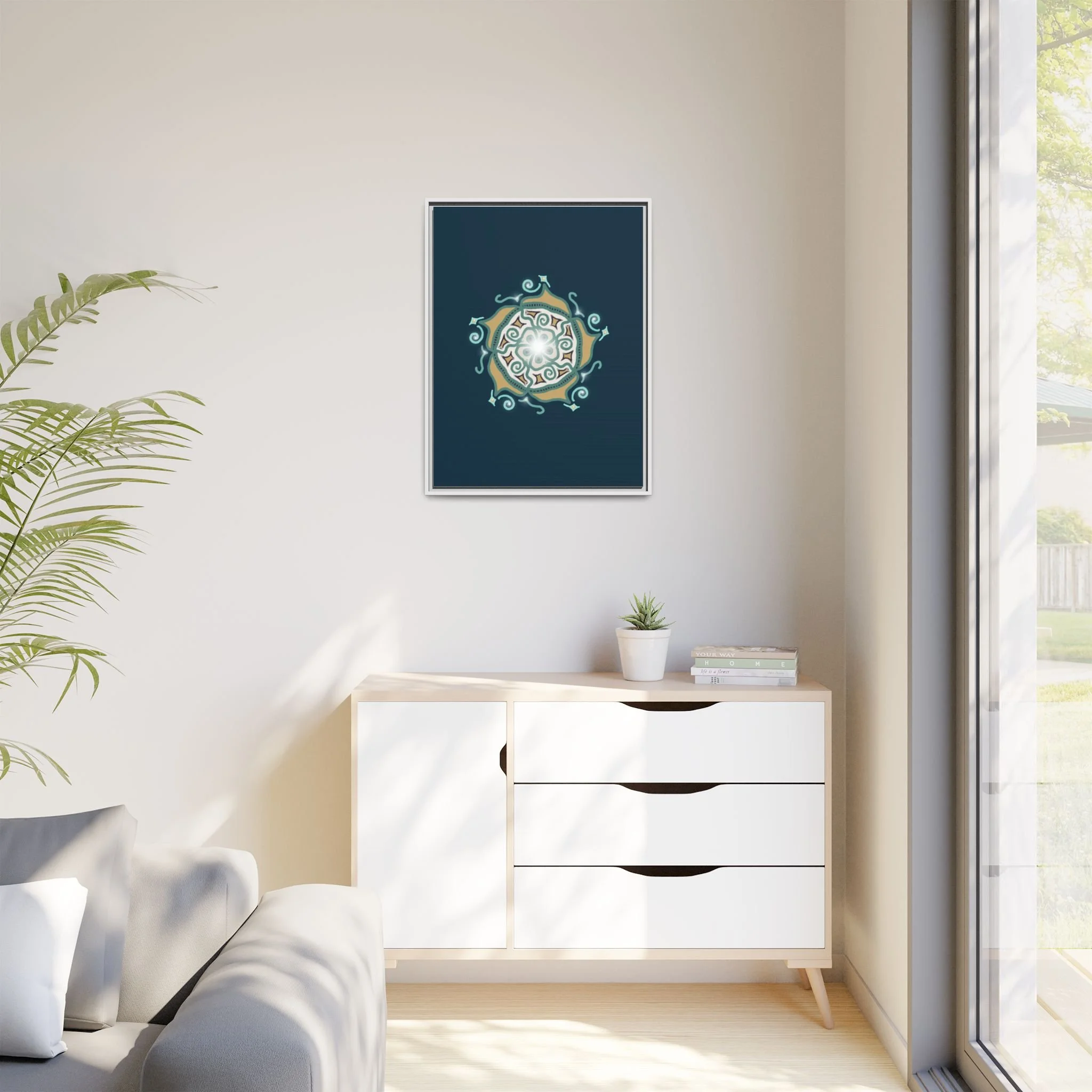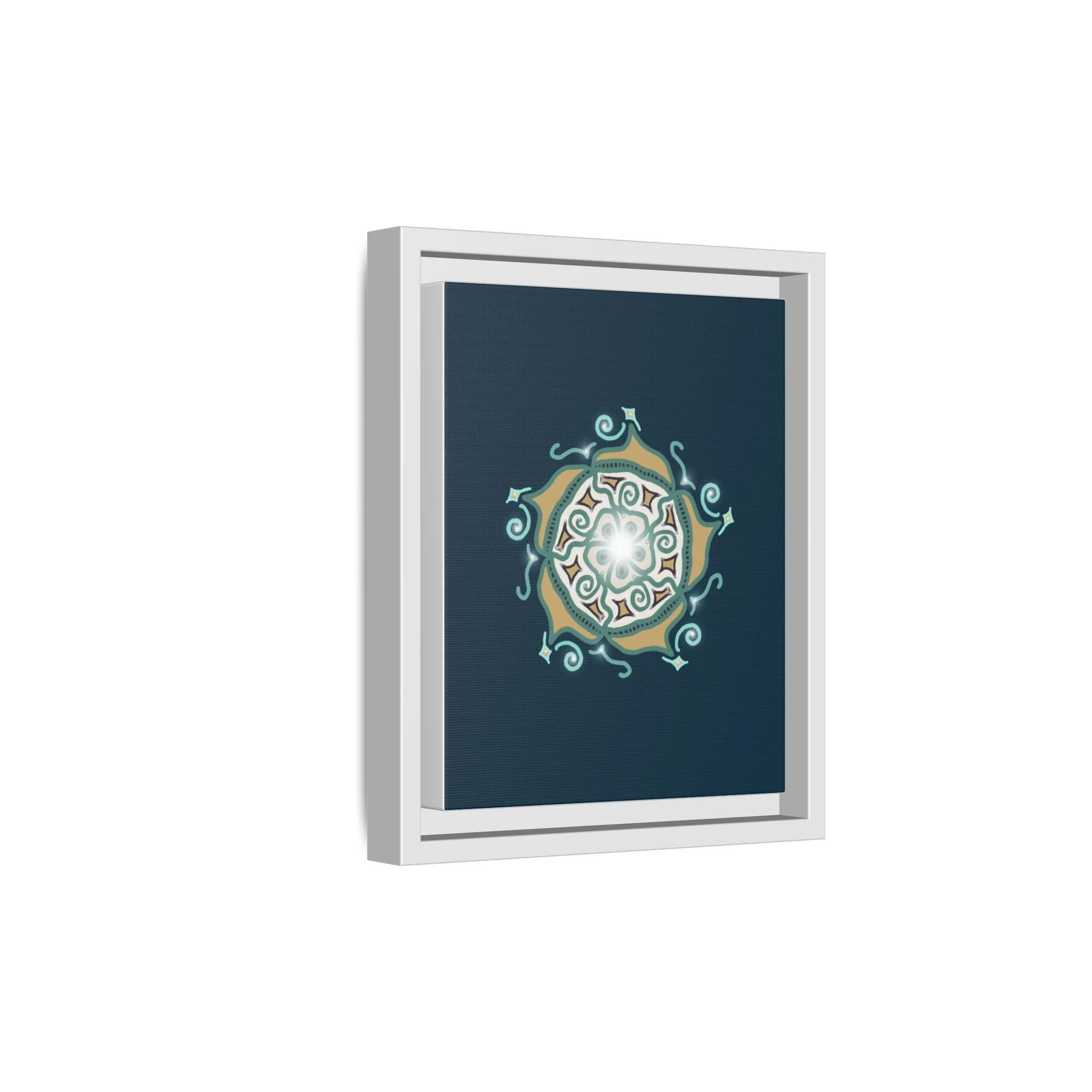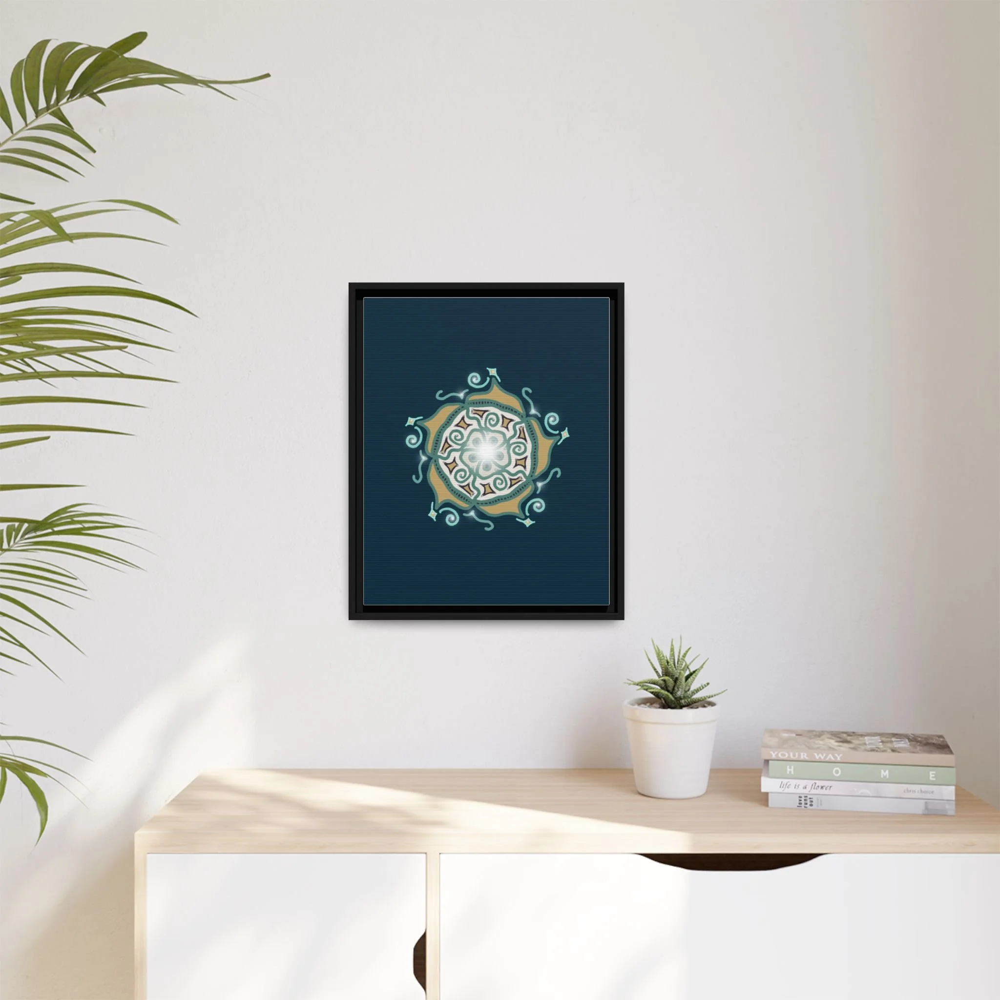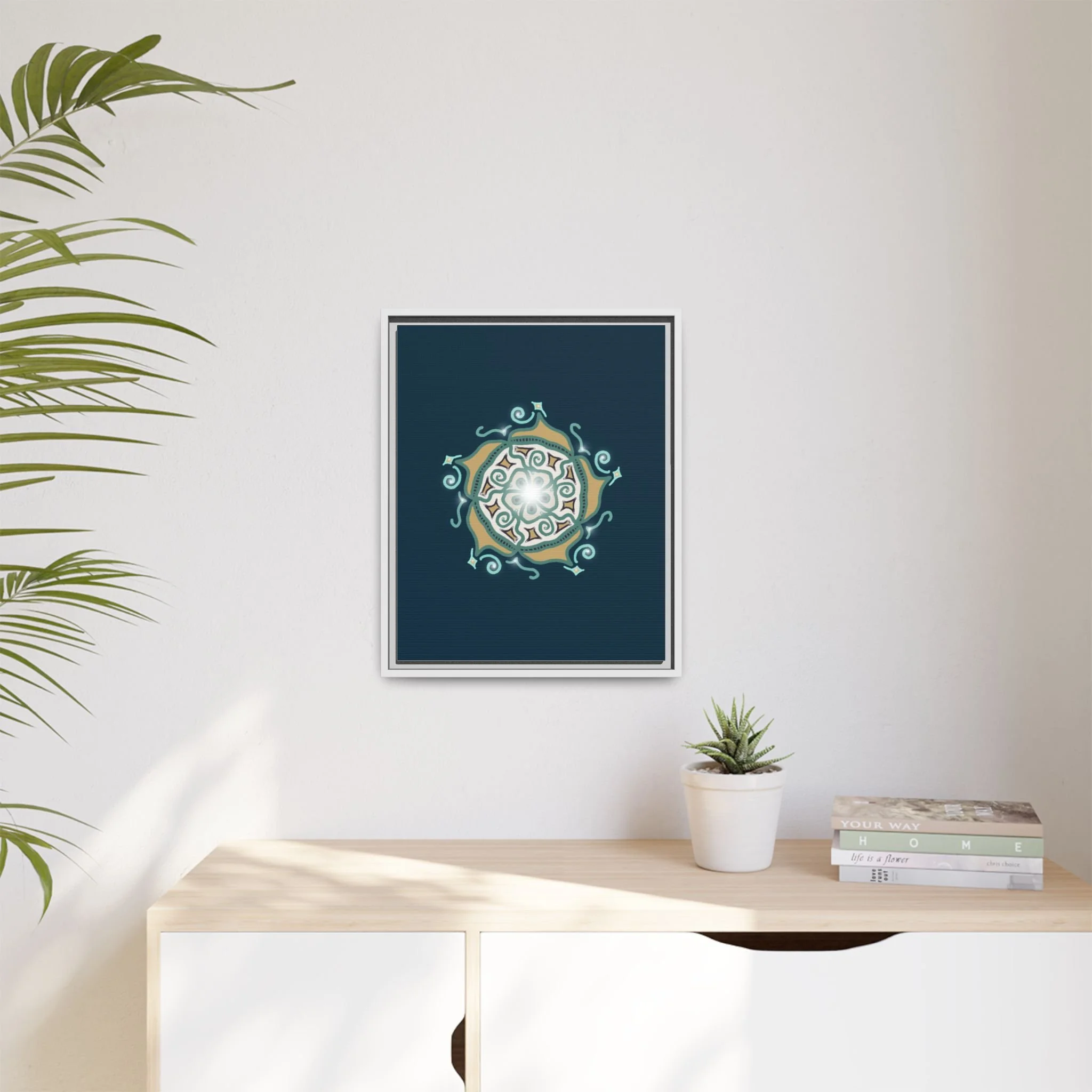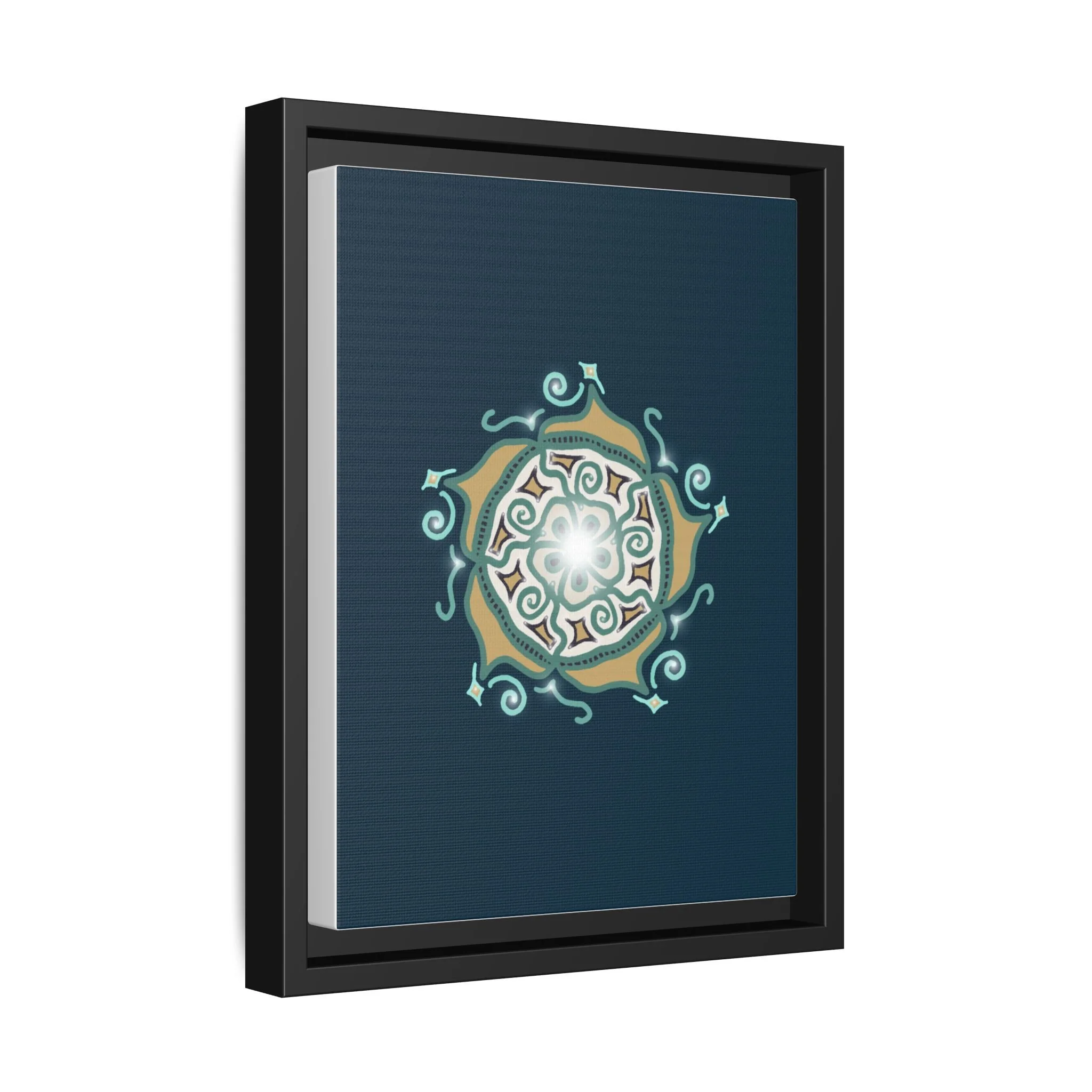 This matte canvas print offers a sense of guidance and depth with its rich dark teal background and striking star-like mandala. The gold and cream geometric patterns radiate outward like a compass or a celestial body, creating a meditative focal point that encourages focus and clarity. Framed in a slim pine profile, the piece reads bold yet serene — it anchors a modern living room, a focused study, or a quiet night-time retreat.