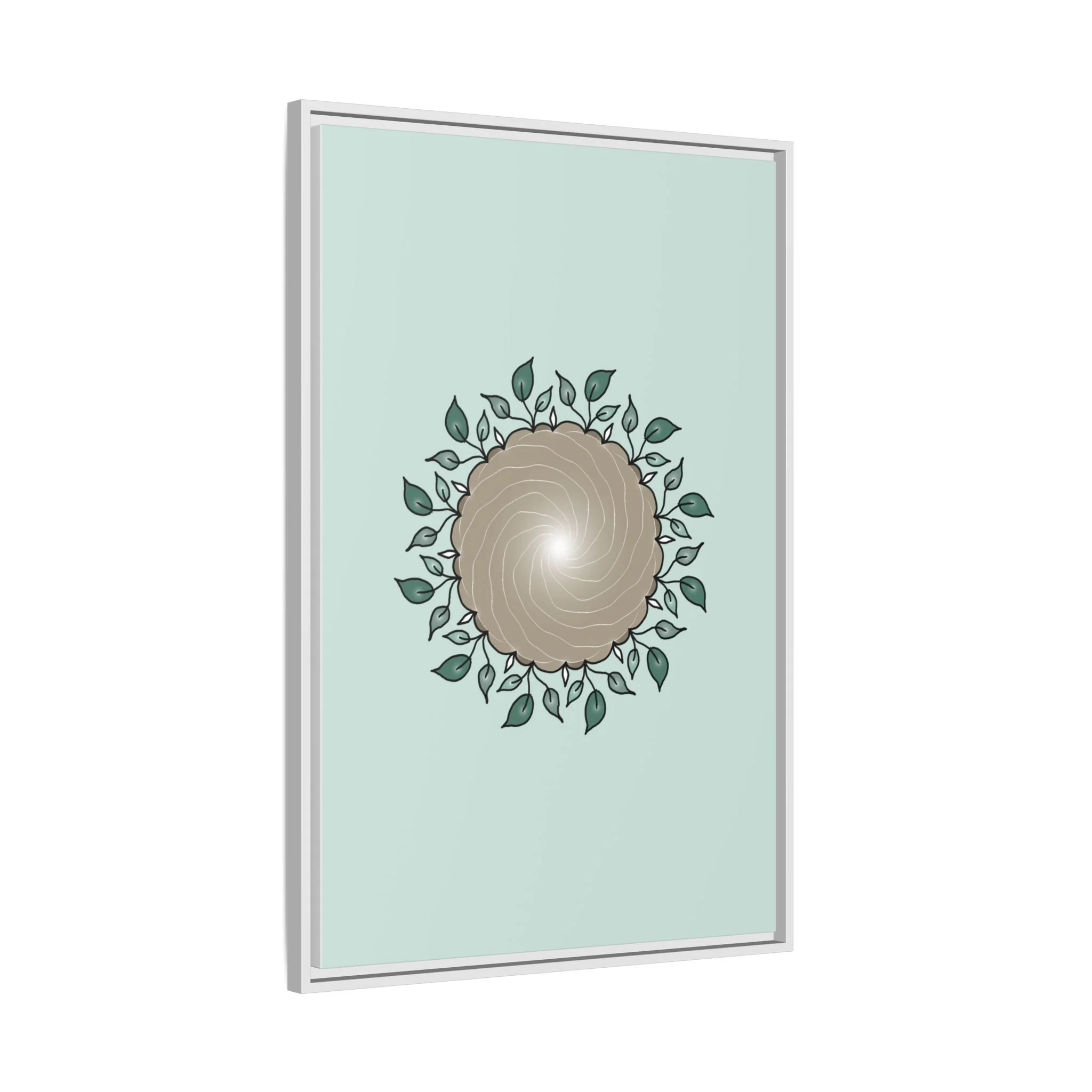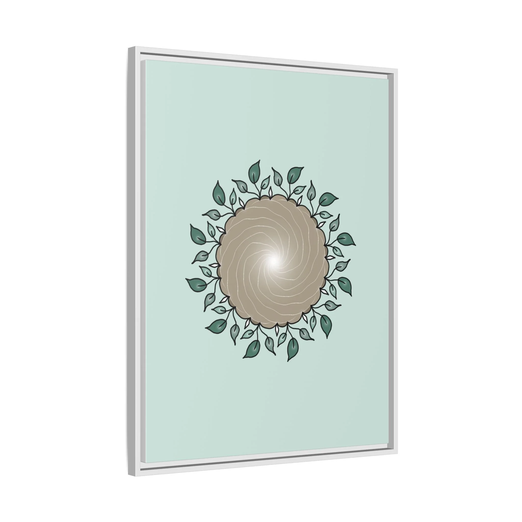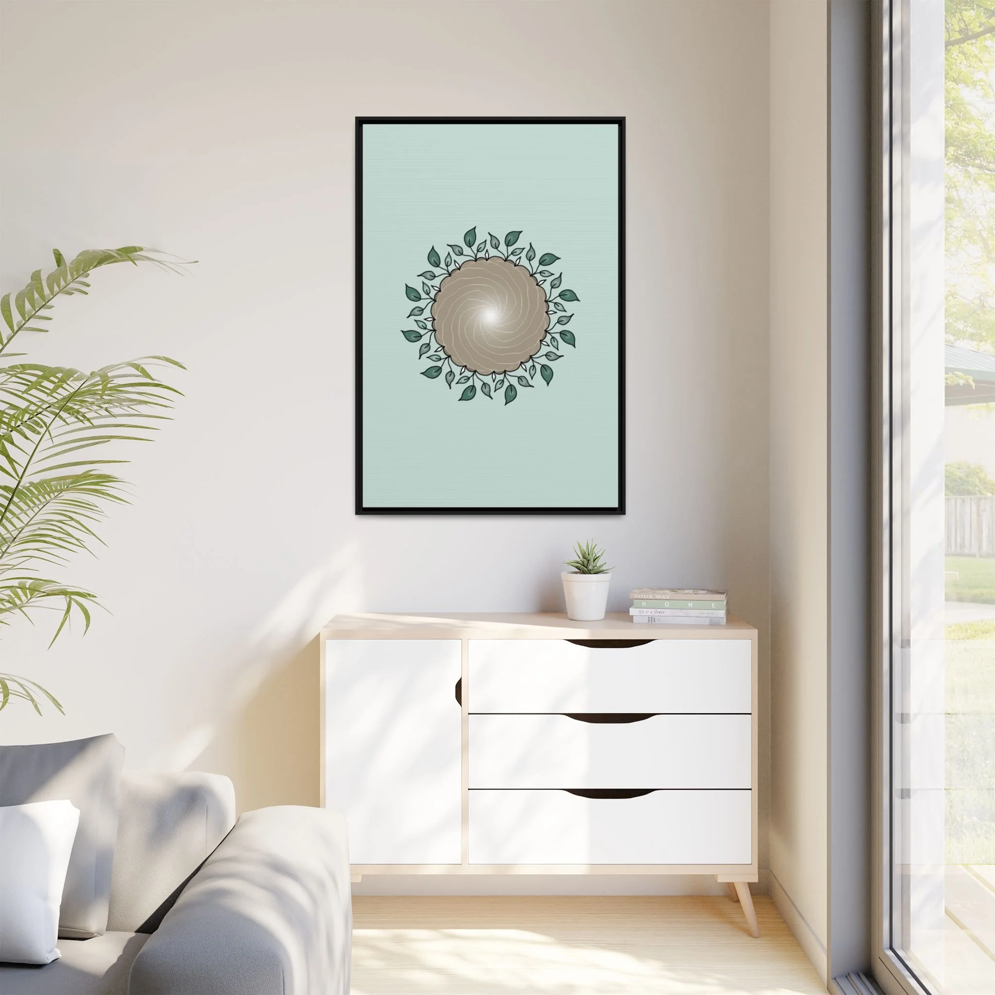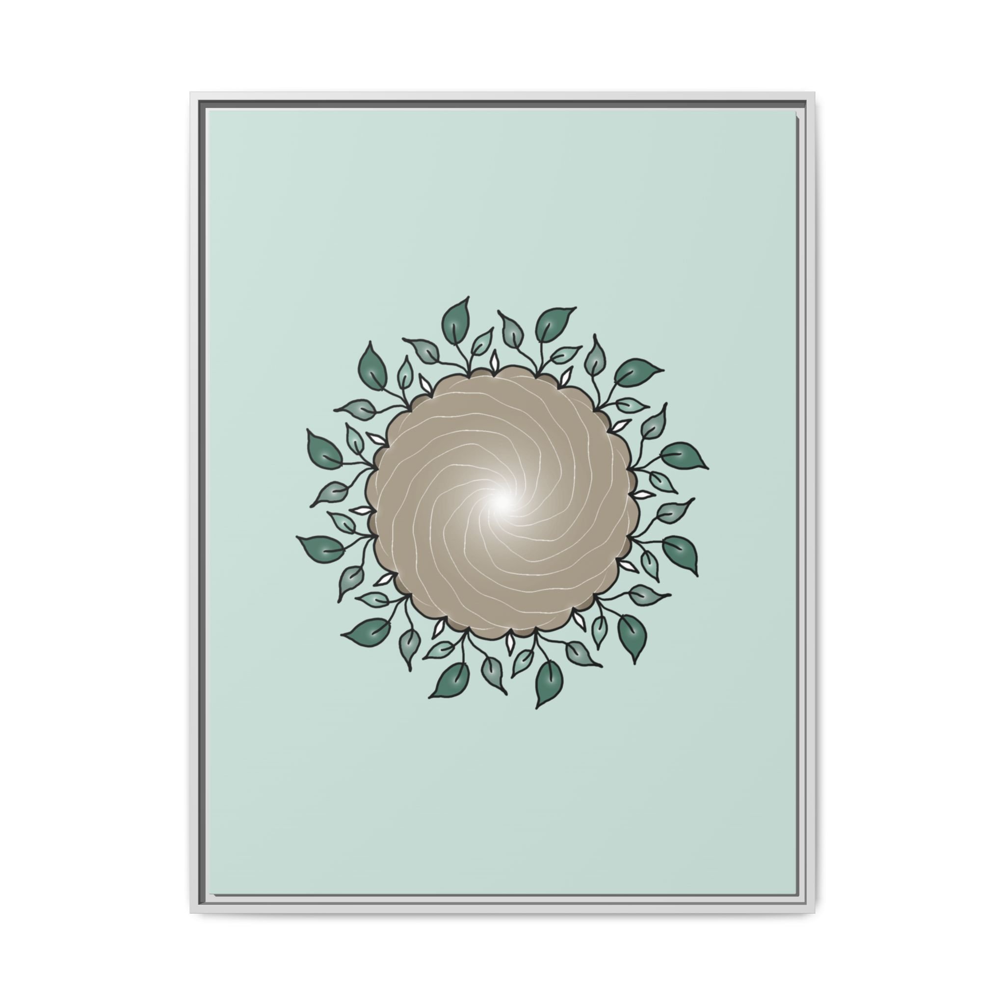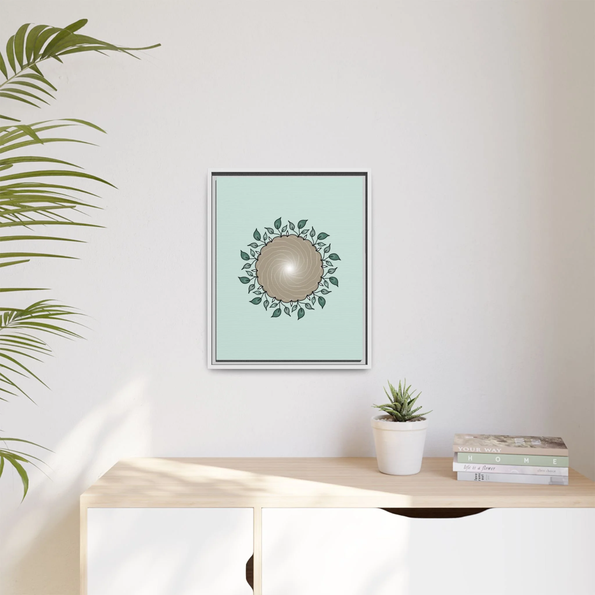 This matte canvas print evokes the grounding energy of nature with its soft sage green background and organic, spiraling center. The earthy cream tones and surrounding leaf-like border create a sense of natural rhythm and growth, making it a perfect visual anchor for slowing down. Framed in a slim pine profile, it brings the quiet essence of a forest glade into a minimalist bedroom, a home office, or a meditation space.