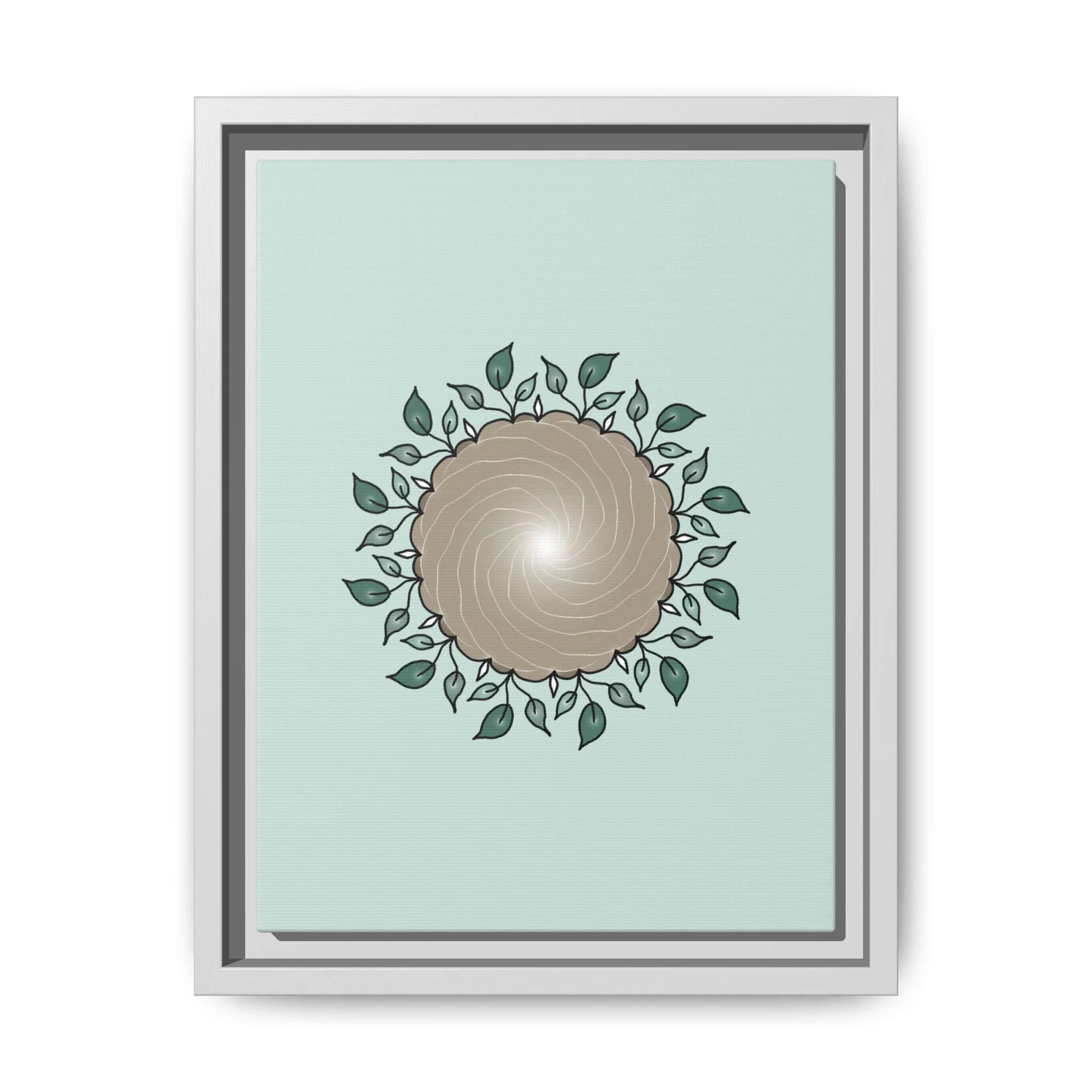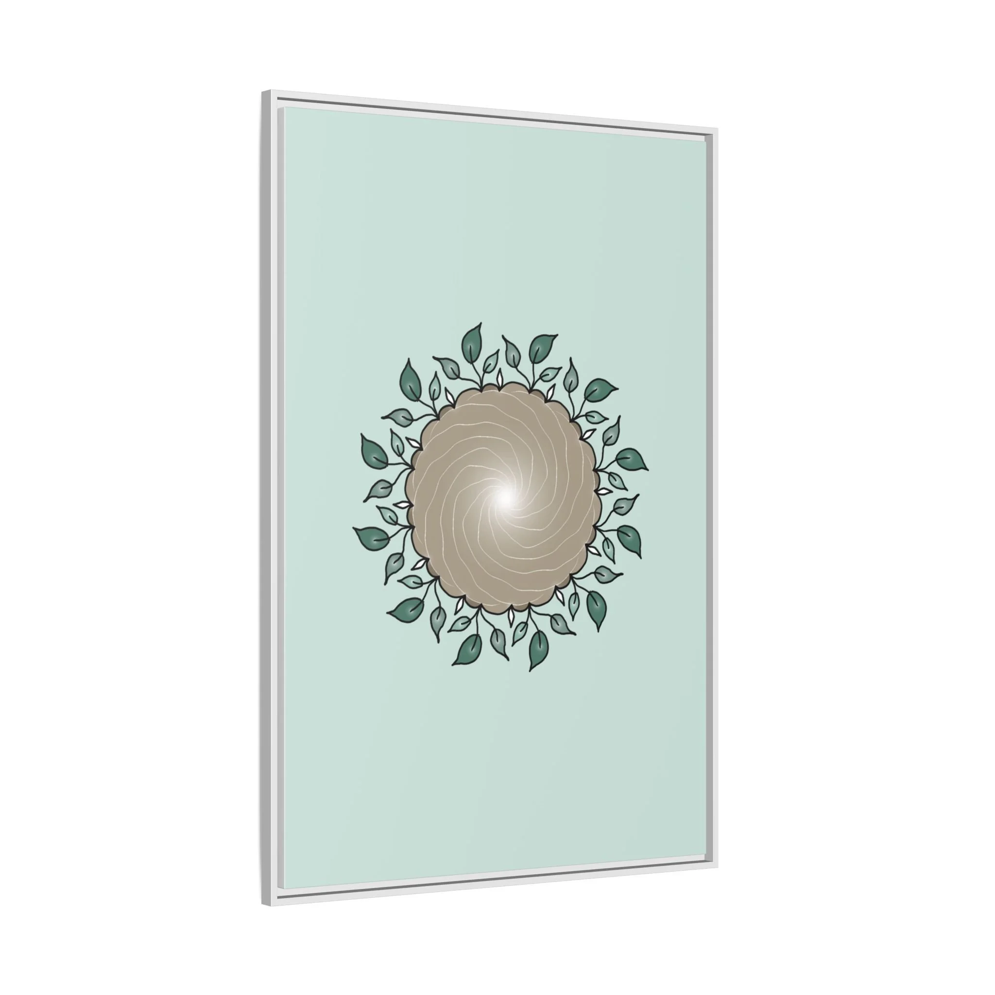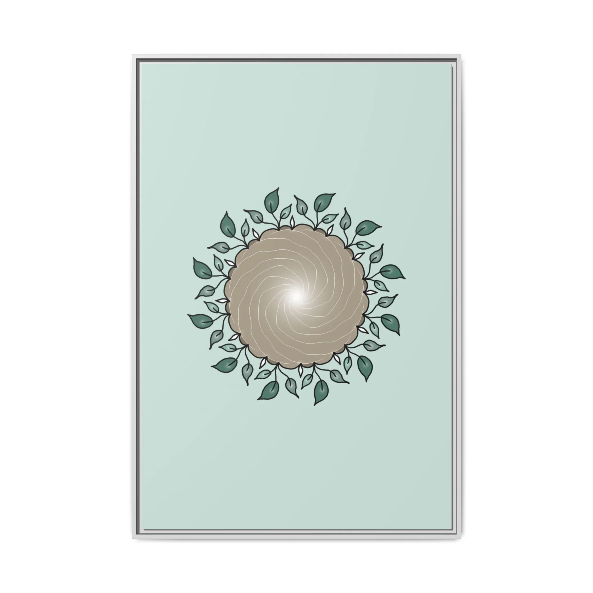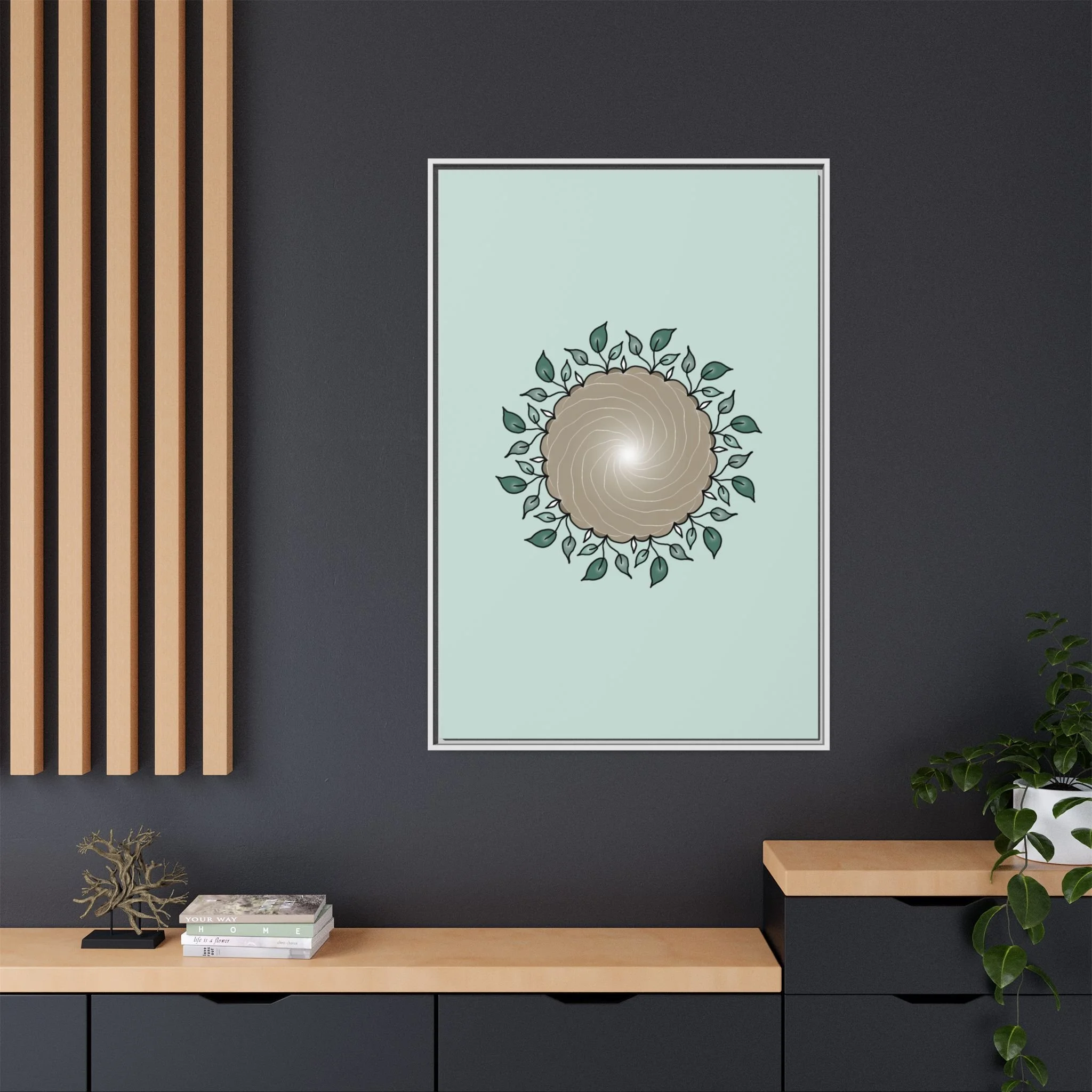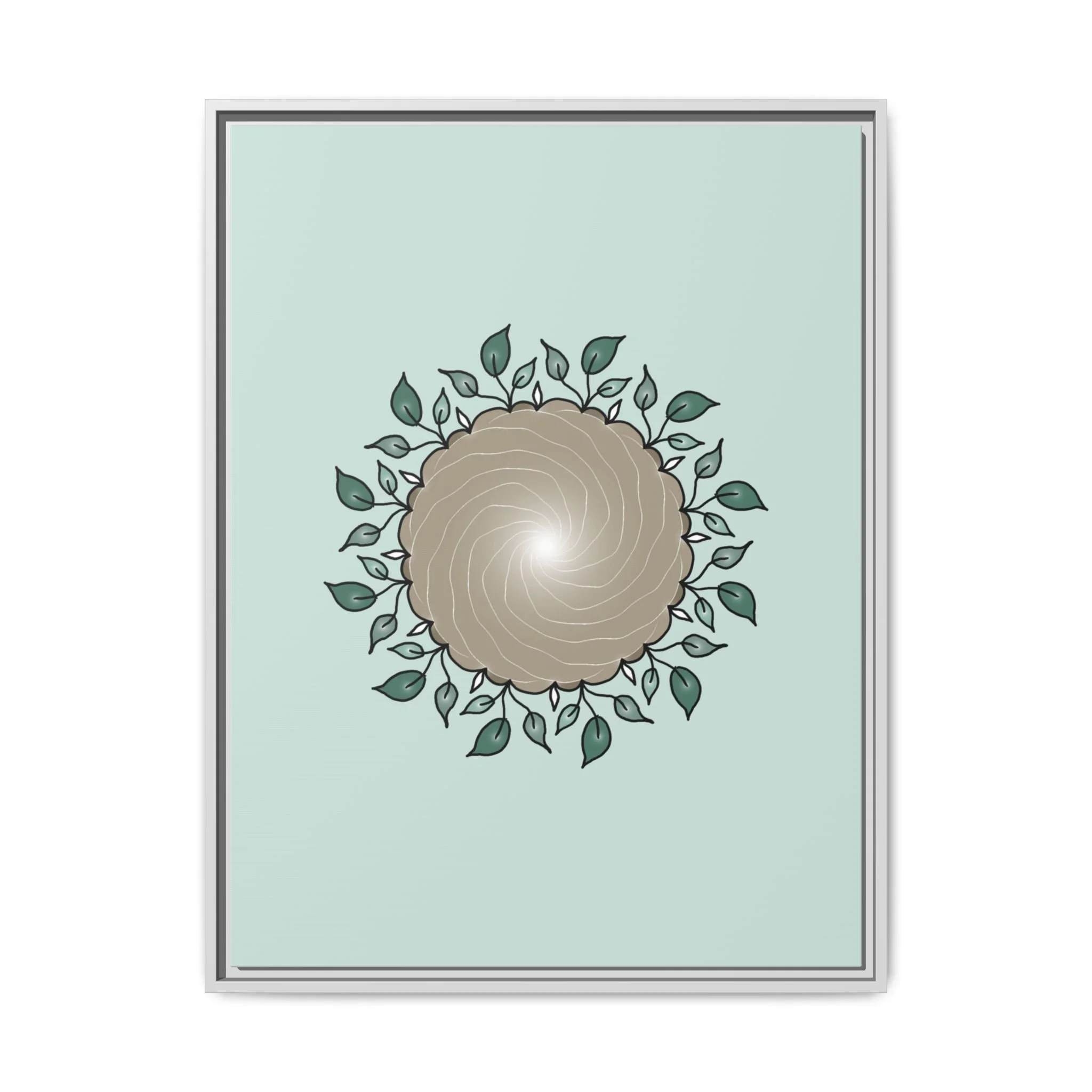 This matte canvas print evokes the grounding energy of nature with its soft sage green background and organic, spiraling center. The earthy cream tones and surrounding leaf-like border create a sense of natural rhythm and growth, making it a perfect visual anchor for slowing down. Framed in a slim pine profile, it brings the quiet essence of a forest glade into a minimalist bedroom, a home office, or a meditation space.