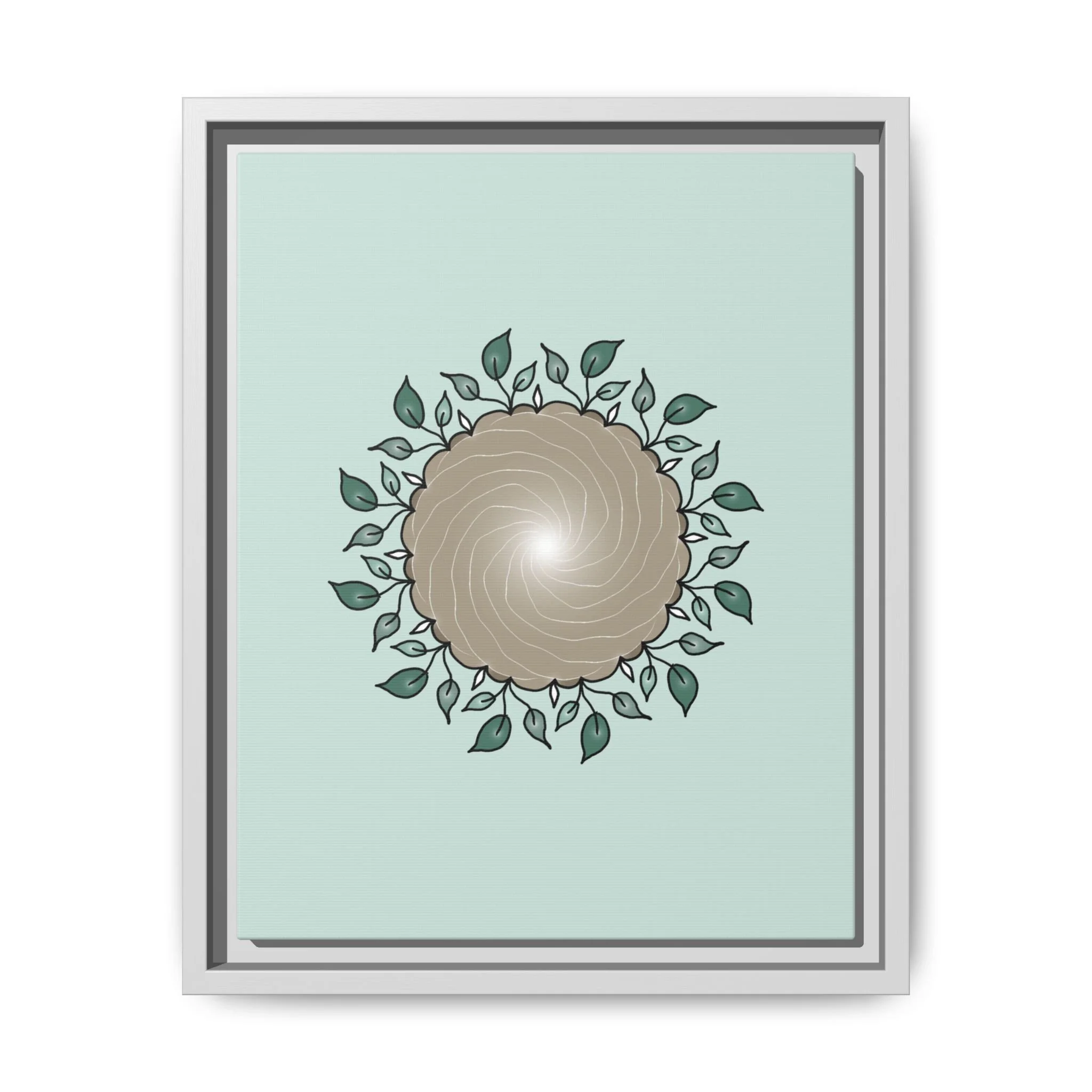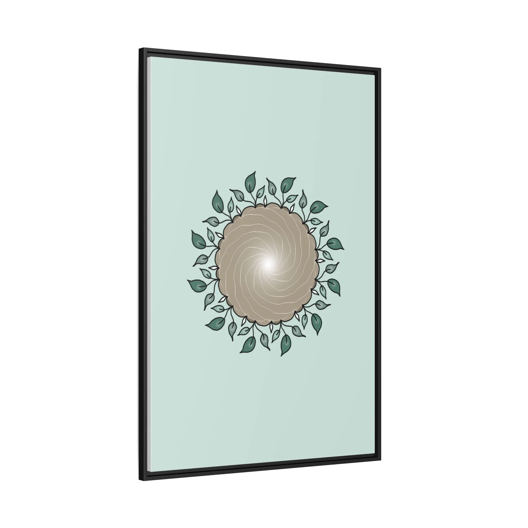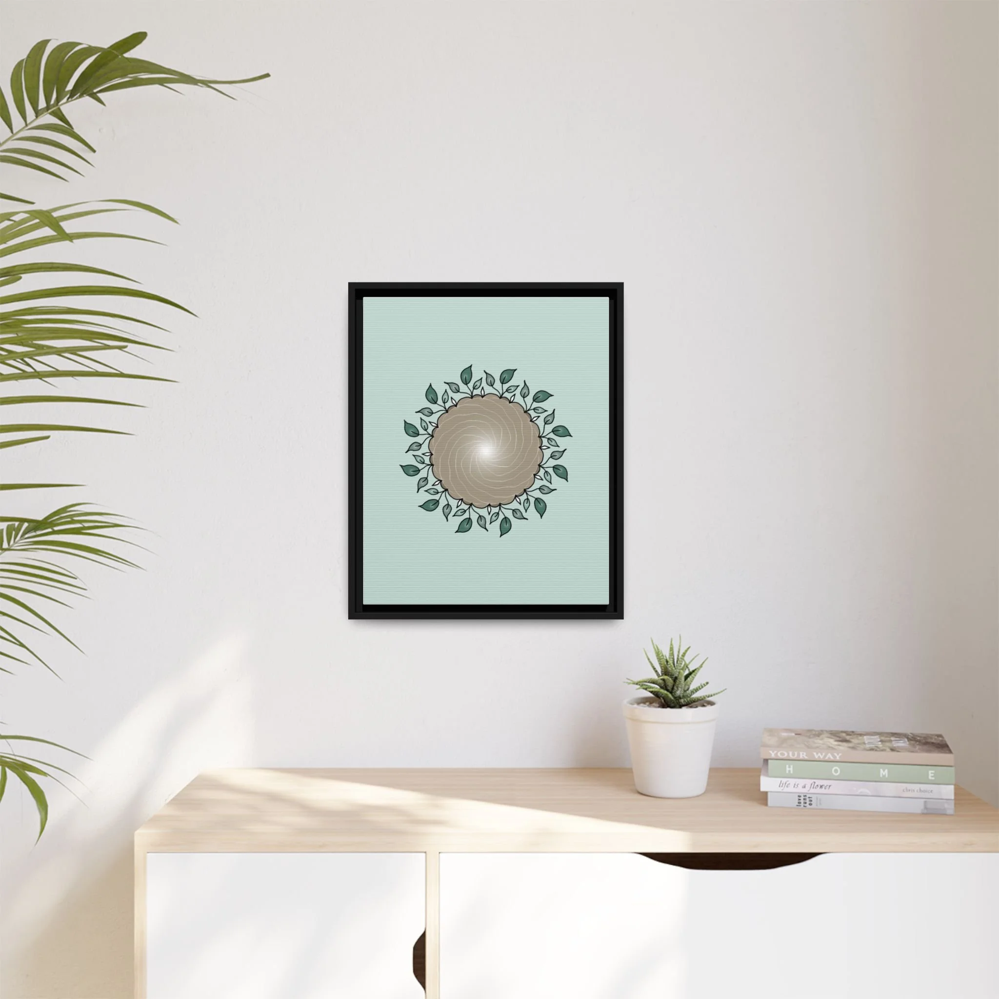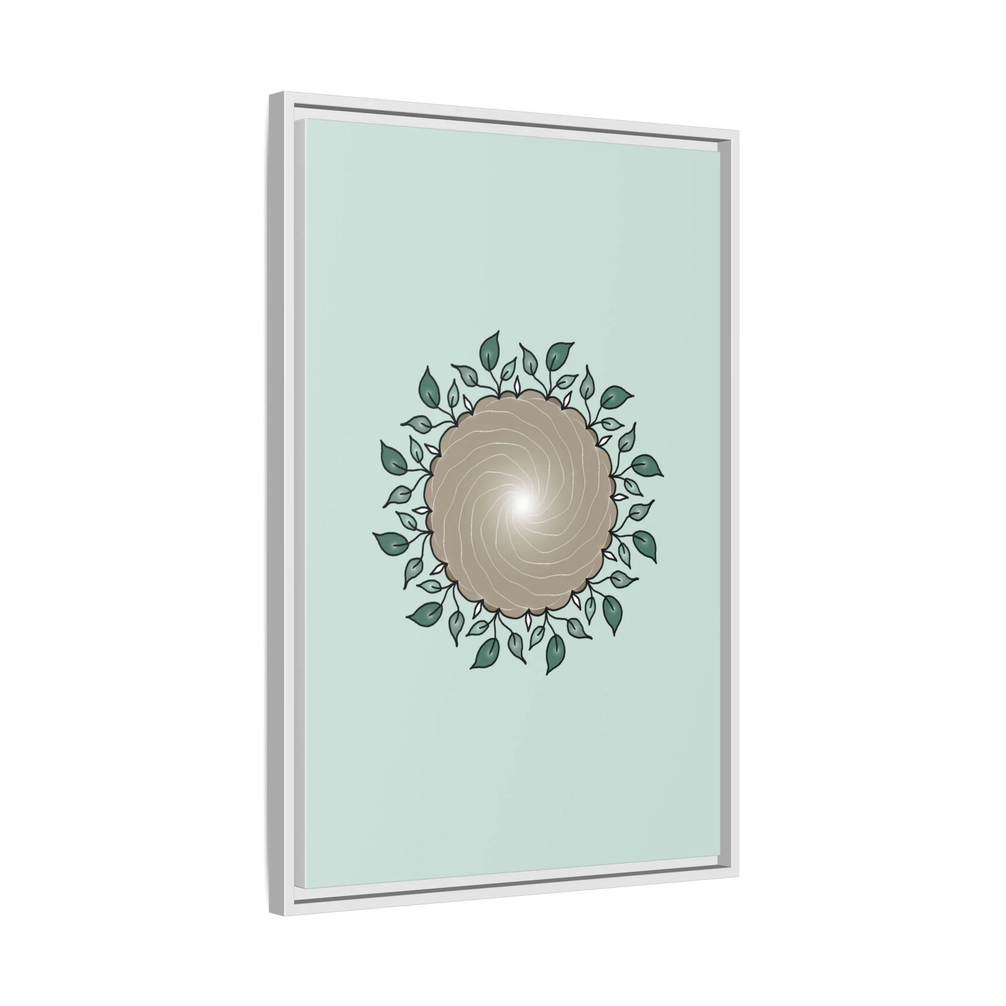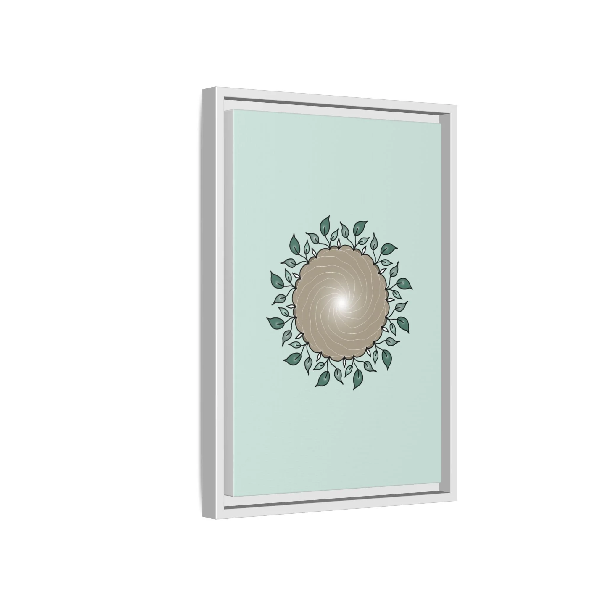 This matte canvas print evokes the grounding energy of nature with its soft sage green background and organic, spiraling center. The earthy cream tones and surrounding leaf-like border create a sense of natural rhythm and growth, making it a perfect visual anchor for slowing down. Framed in a slim pine profile, it brings the quiet essence of a forest glade into a minimalist bedroom, a home office, or a meditation space.