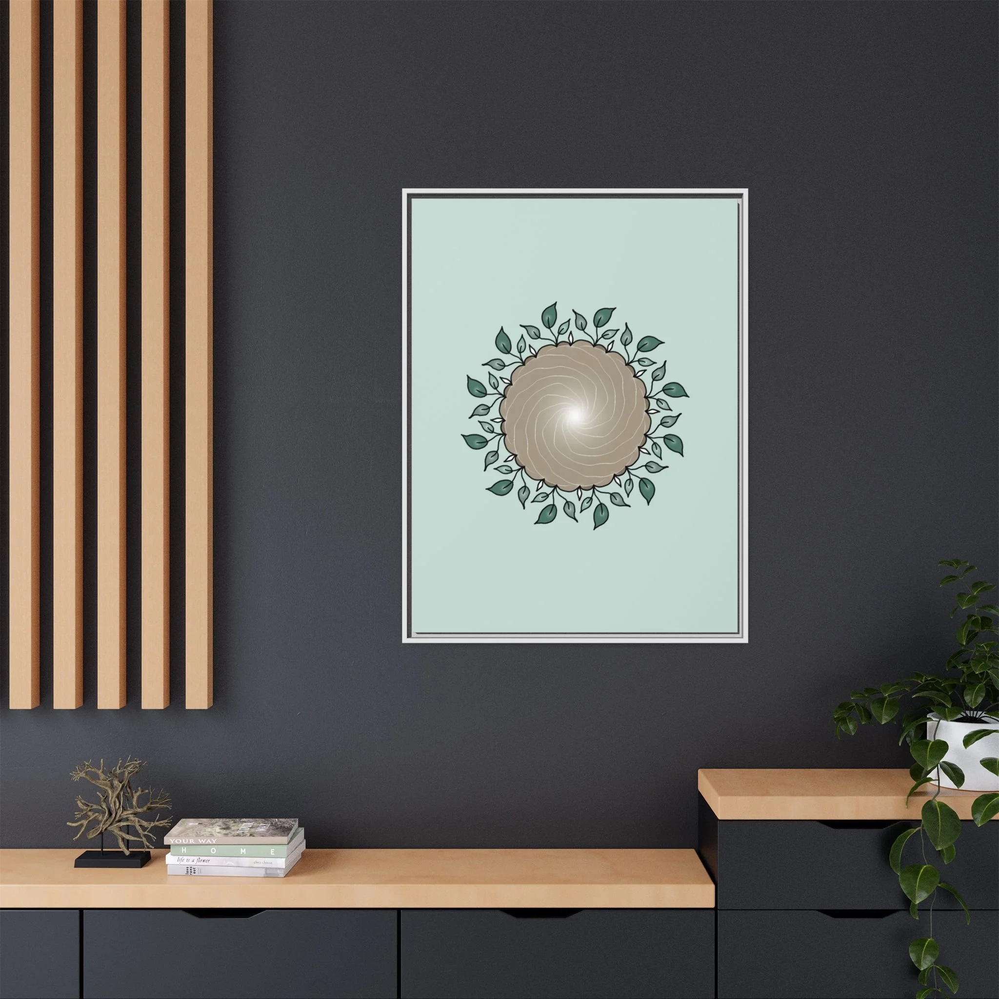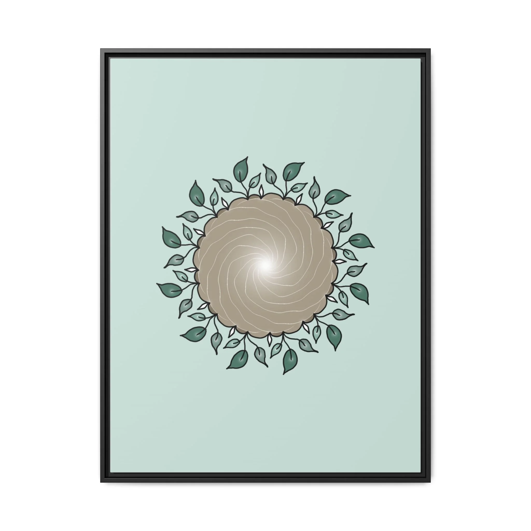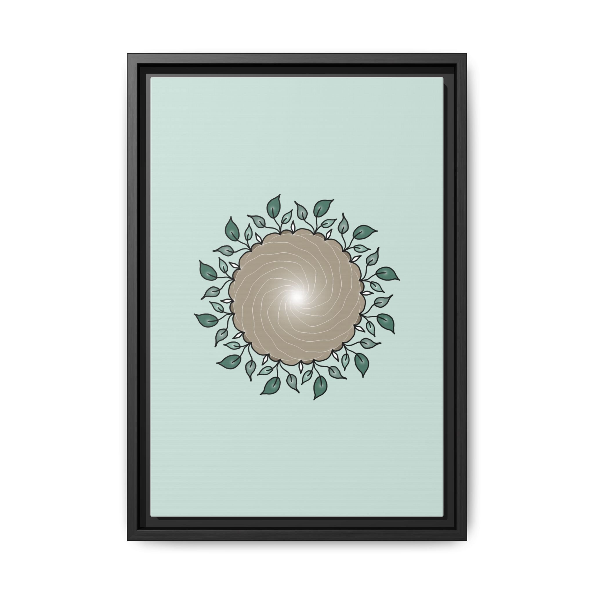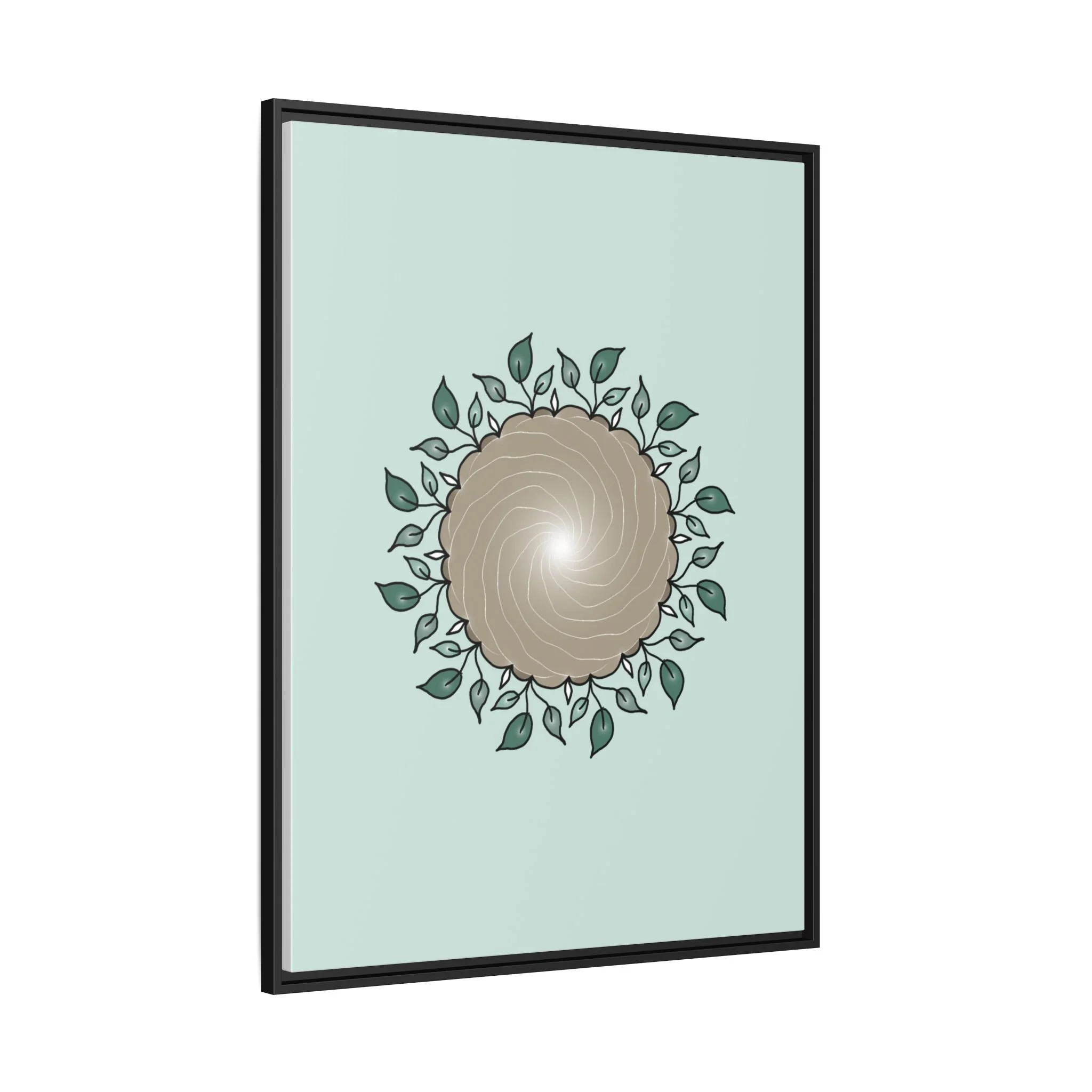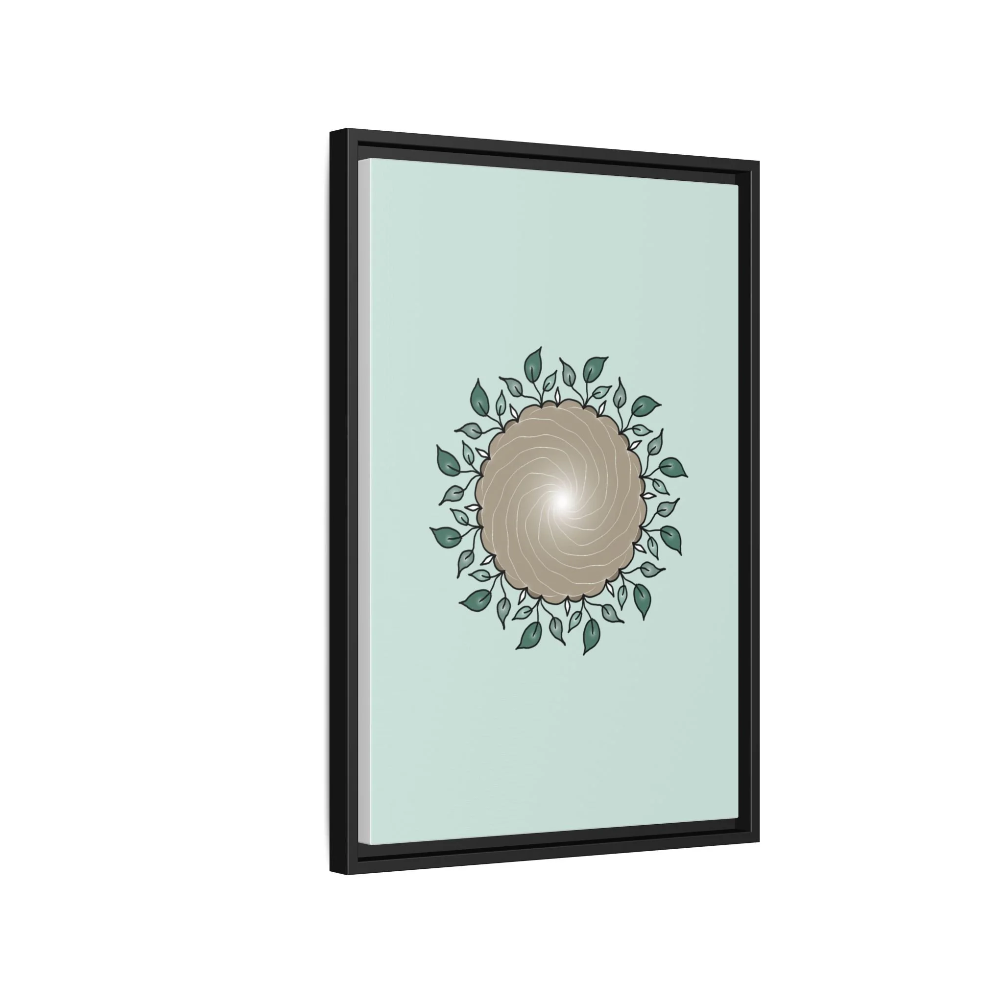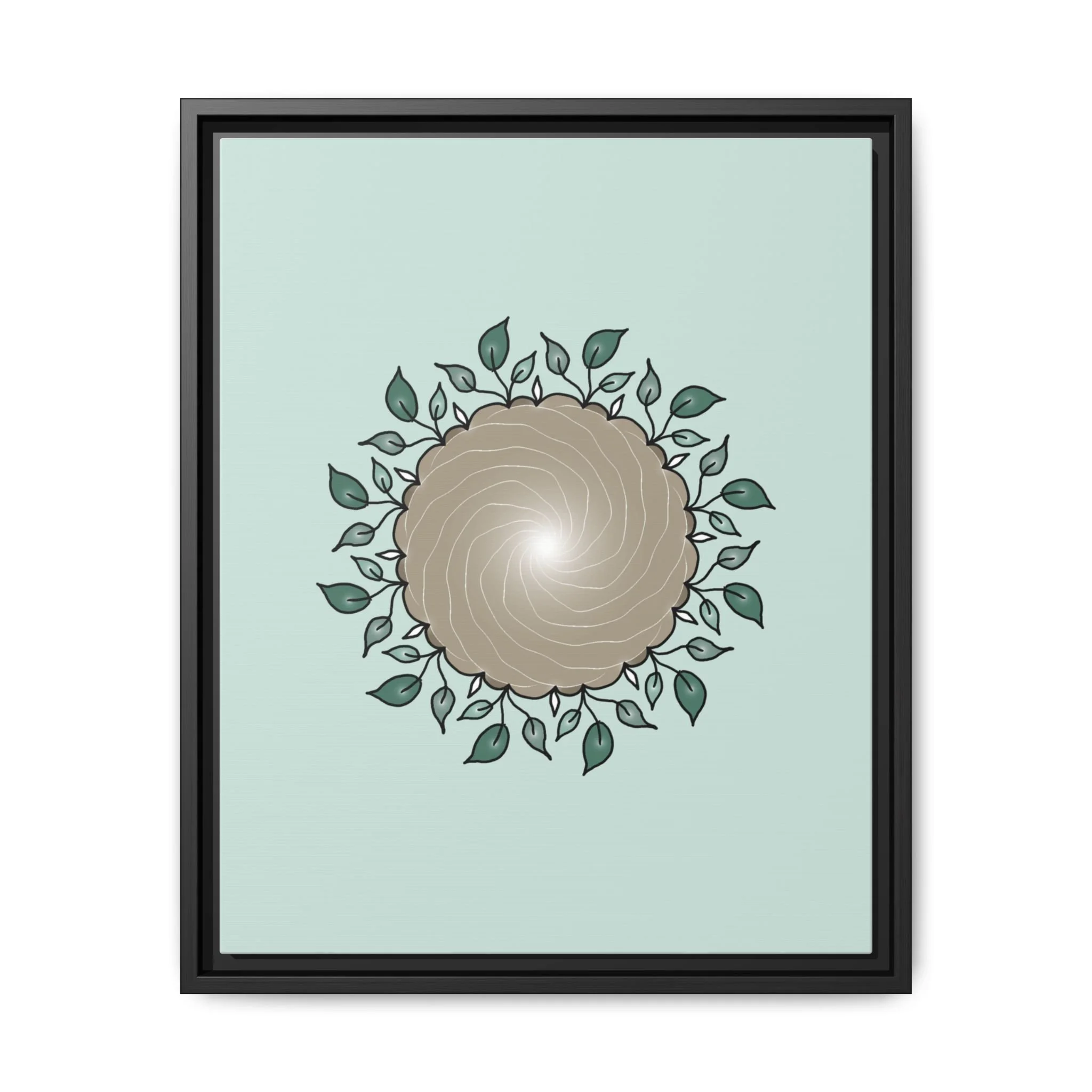 This matte canvas print evokes the grounding energy of nature with its soft sage green background and organic, spiraling center. The earthy cream tones and surrounding leaf-like border create a sense of natural rhythm and growth, making it a perfect visual anchor for slowing down. Framed in a slim pine profile, it brings the quiet essence of a forest glade into a minimalist bedroom, a home office, or a meditation space.