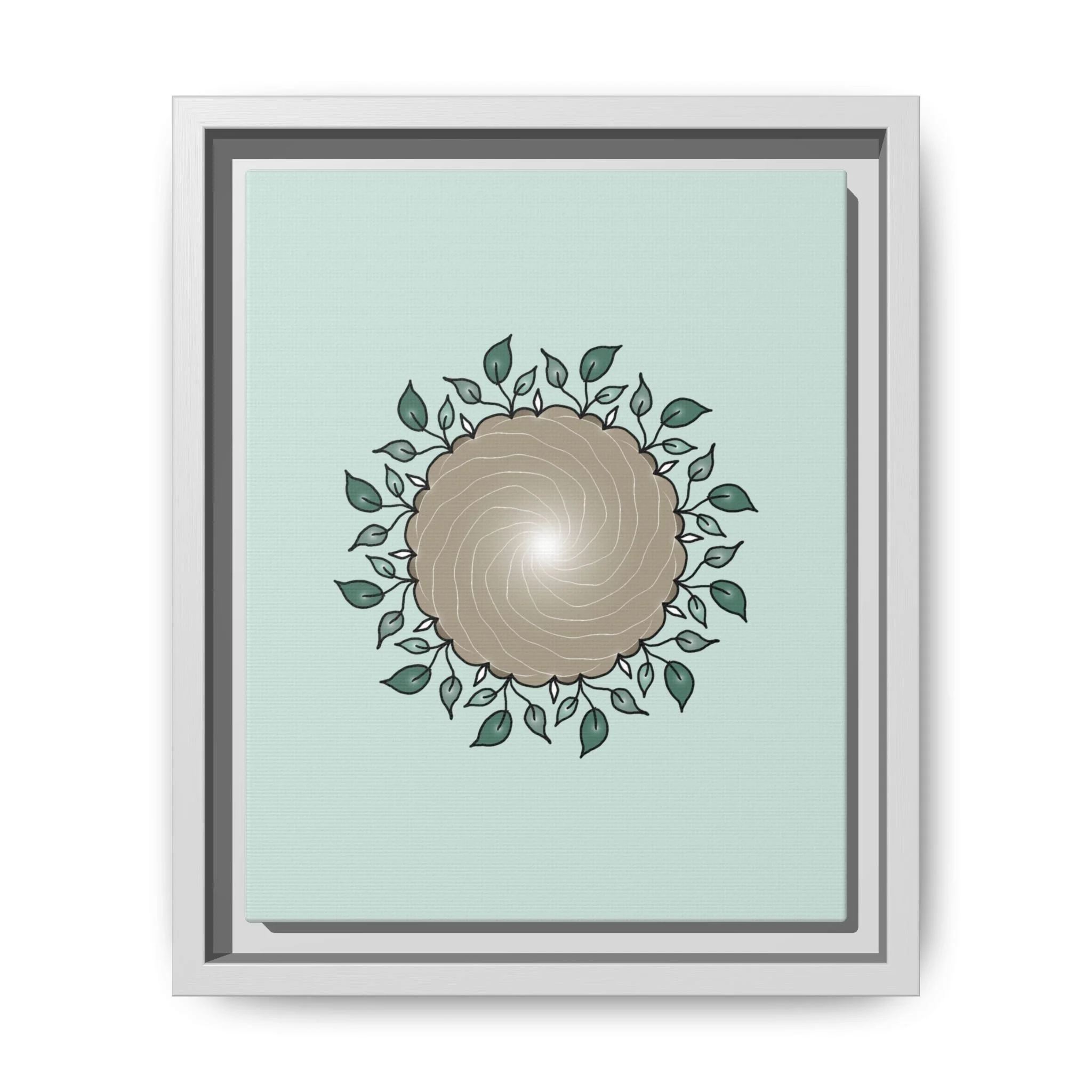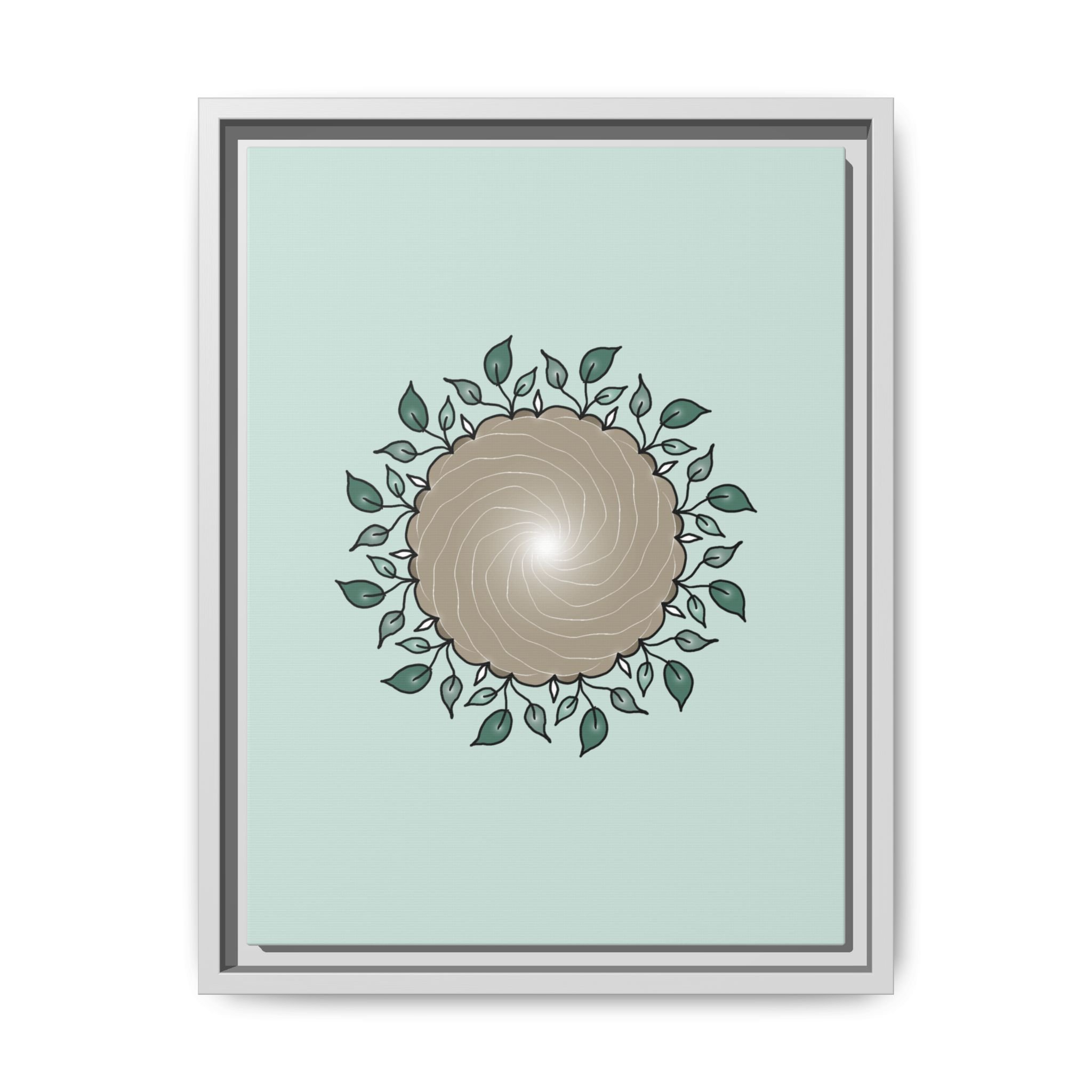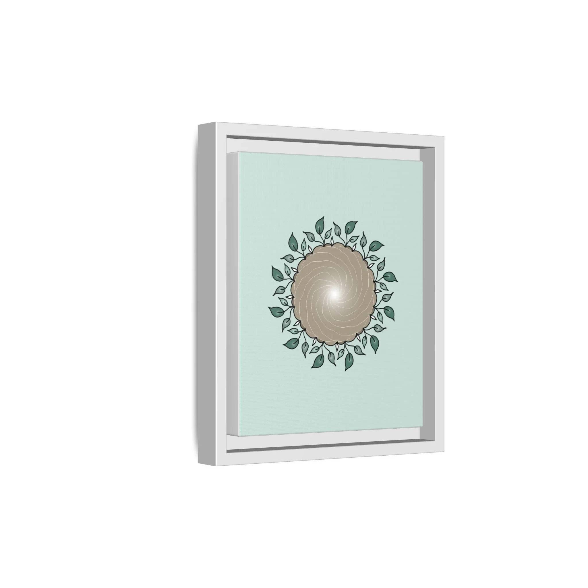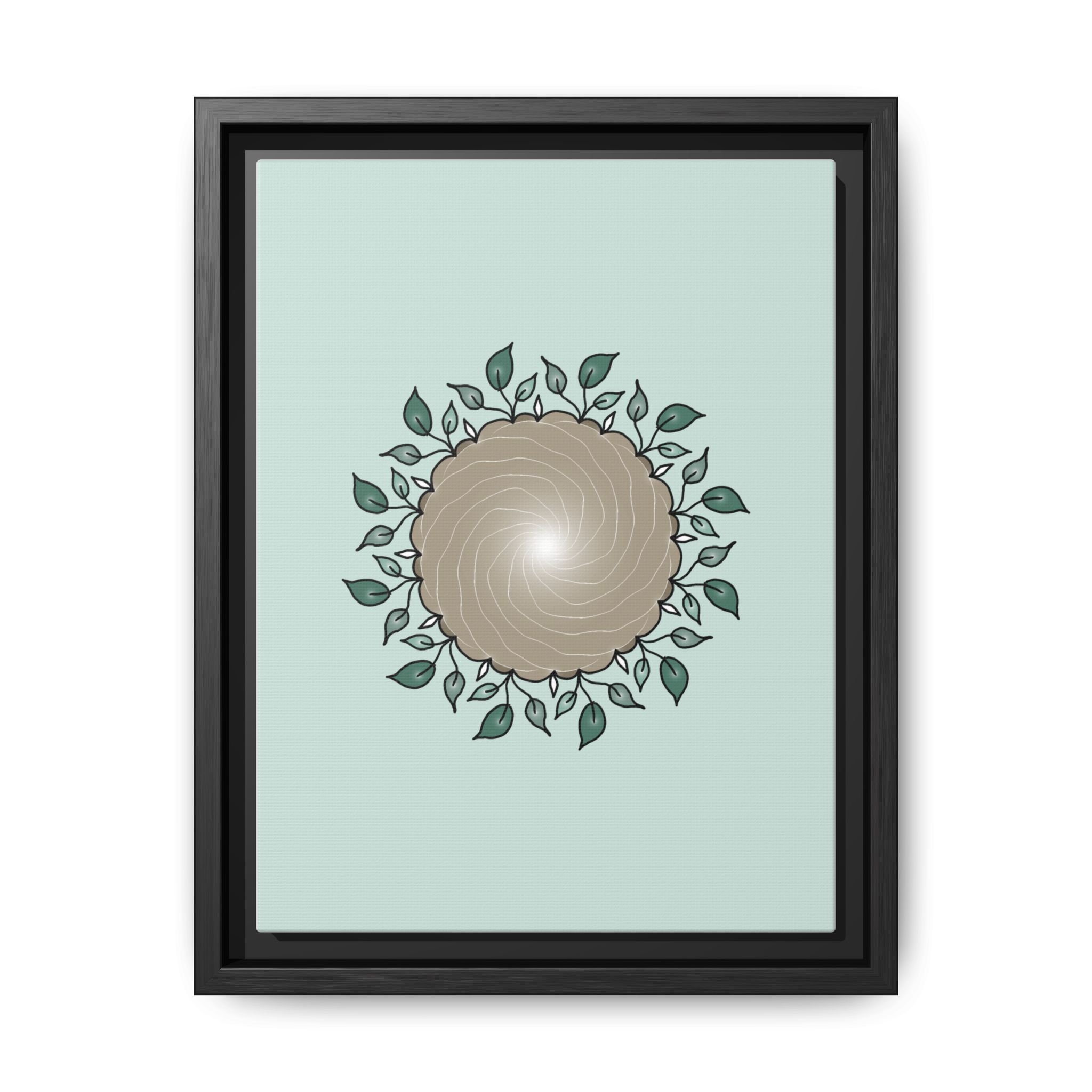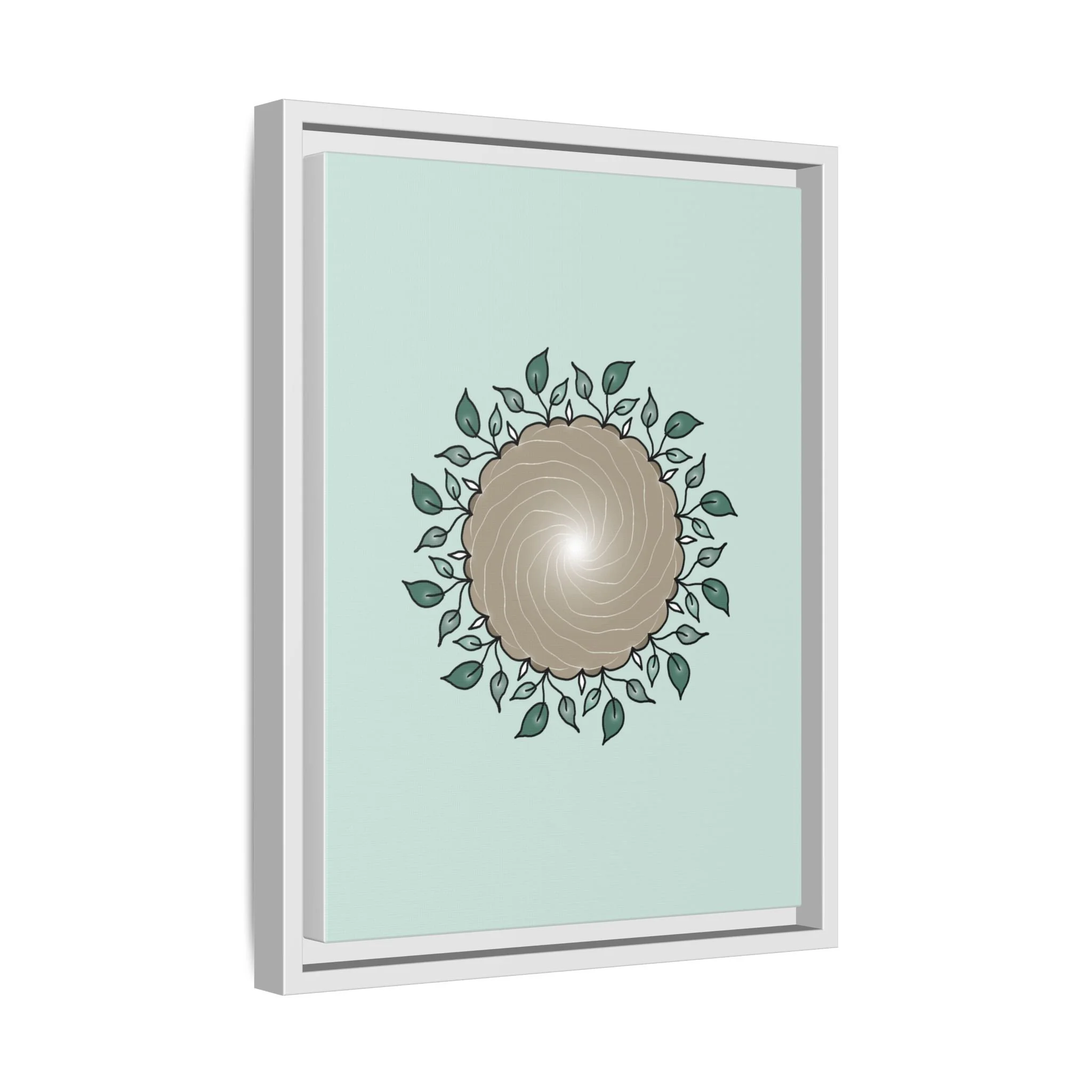 This matte canvas print evokes the grounding energy of nature with its soft sage green background and organic, spiraling center. The earthy cream tones and surrounding leaf-like border create a sense of natural rhythm and growth, making it a perfect visual anchor for slowing down. Framed in a slim pine profile, it brings the quiet essence of a forest glade into a minimalist bedroom, a home office, or a meditation space.