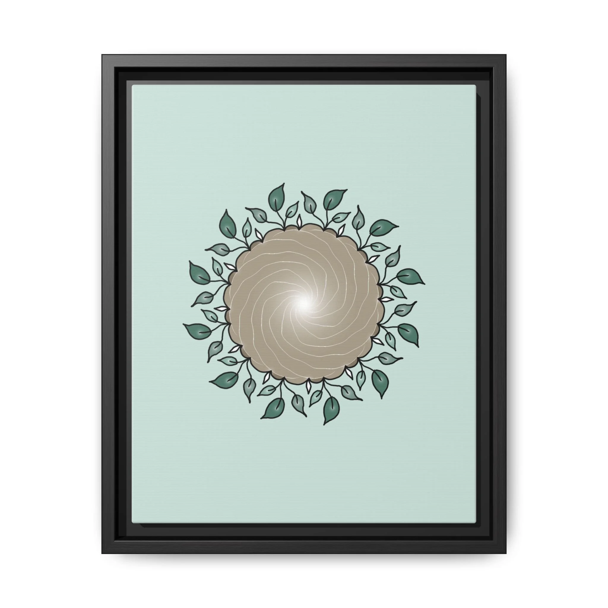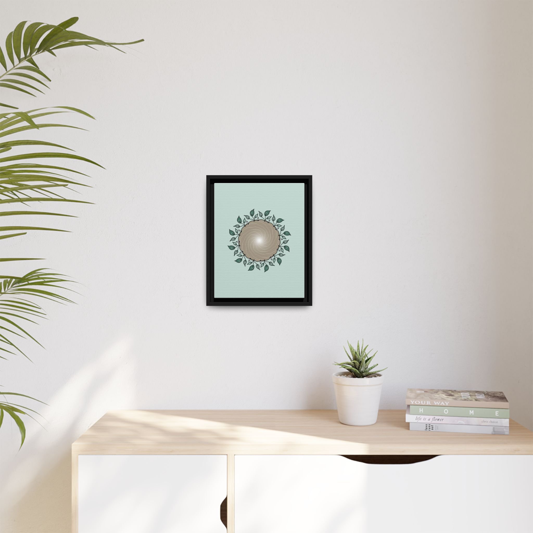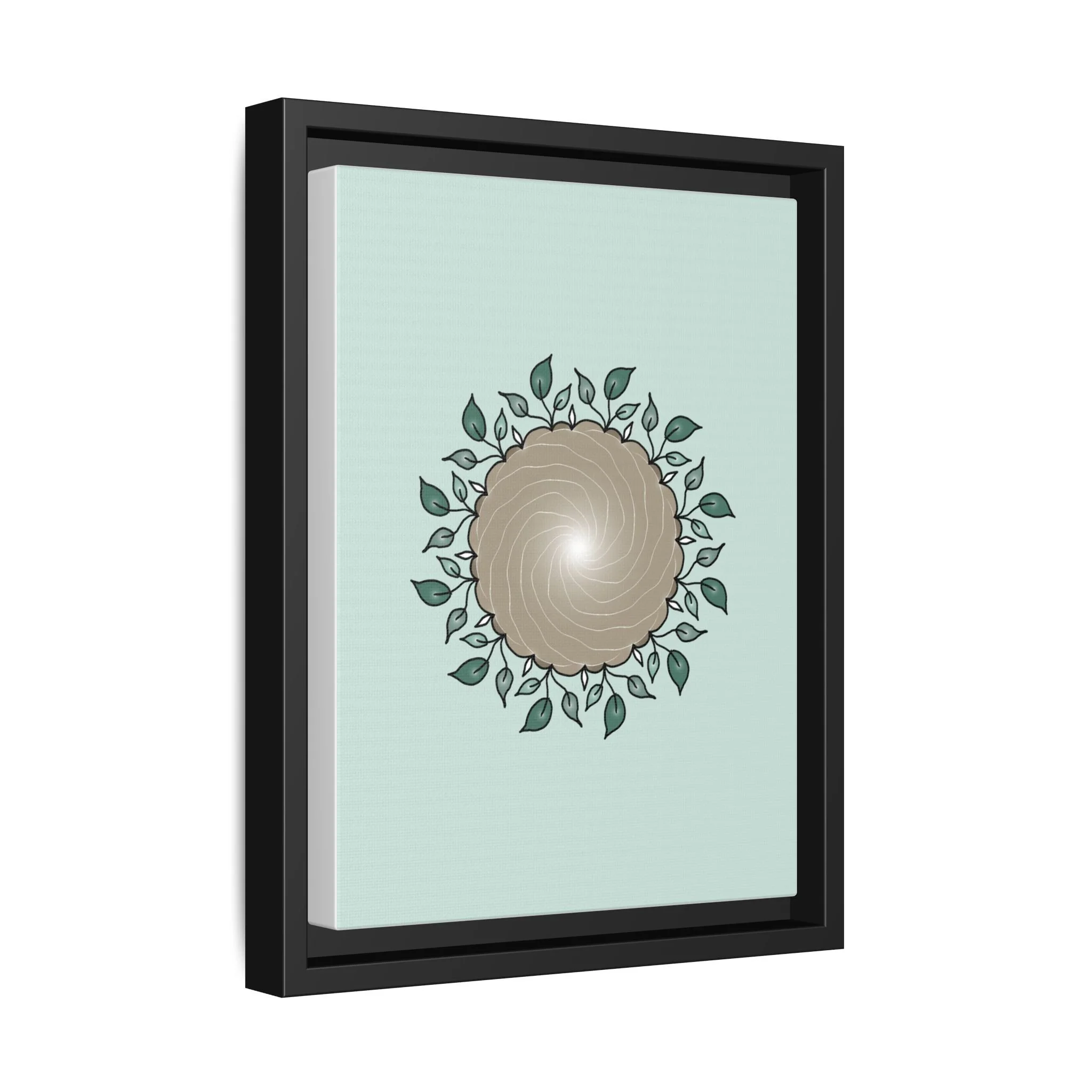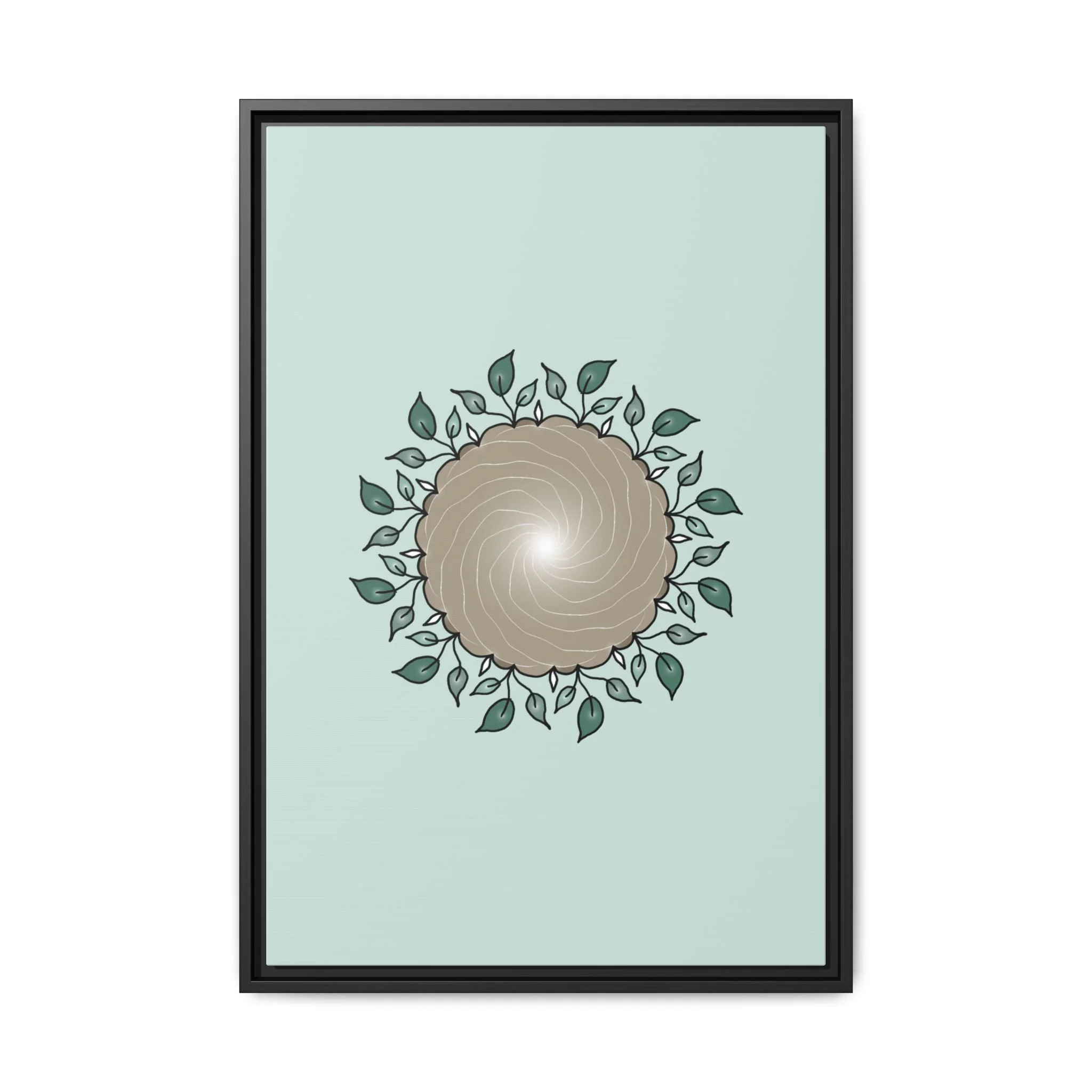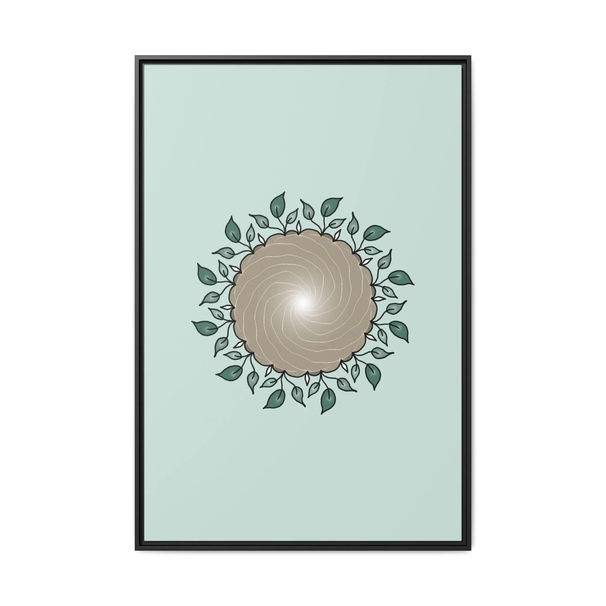 This matte canvas print evokes the grounding energy of nature with its soft sage green background and organic, spiraling center. The earthy cream tones and surrounding leaf-like border create a sense of natural rhythm and growth, making it a perfect visual anchor for slowing down. Framed in a slim pine profile, it brings the quiet essence of a forest glade into a minimalist bedroom, a home office, or a meditation space.