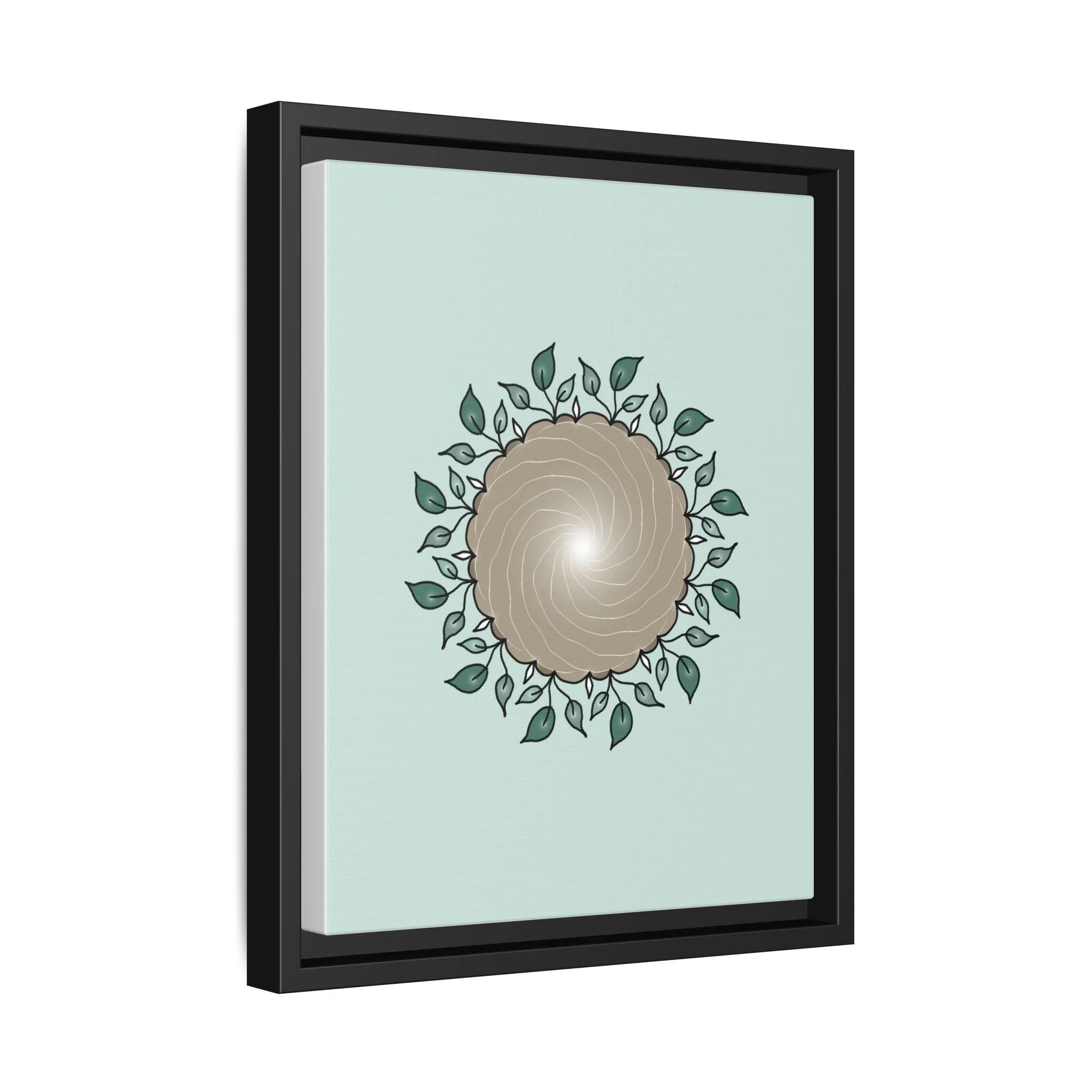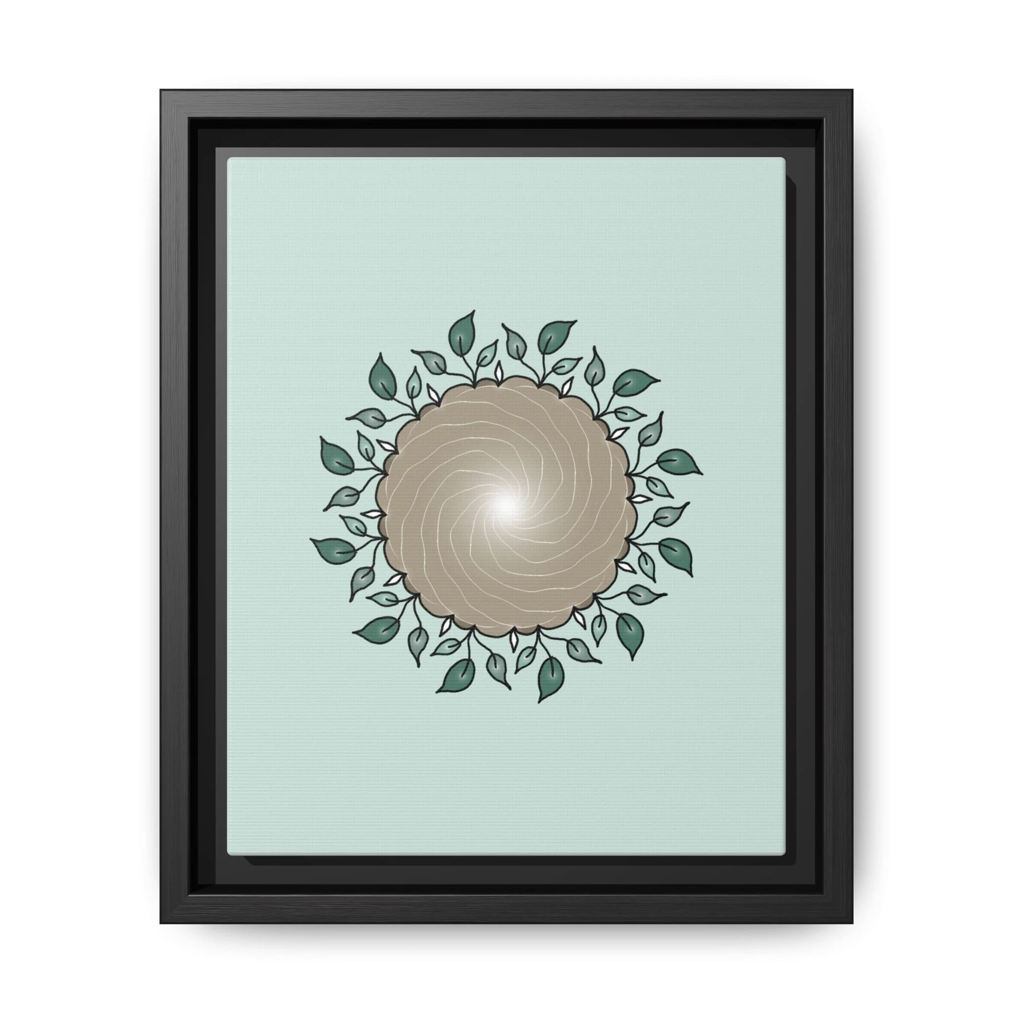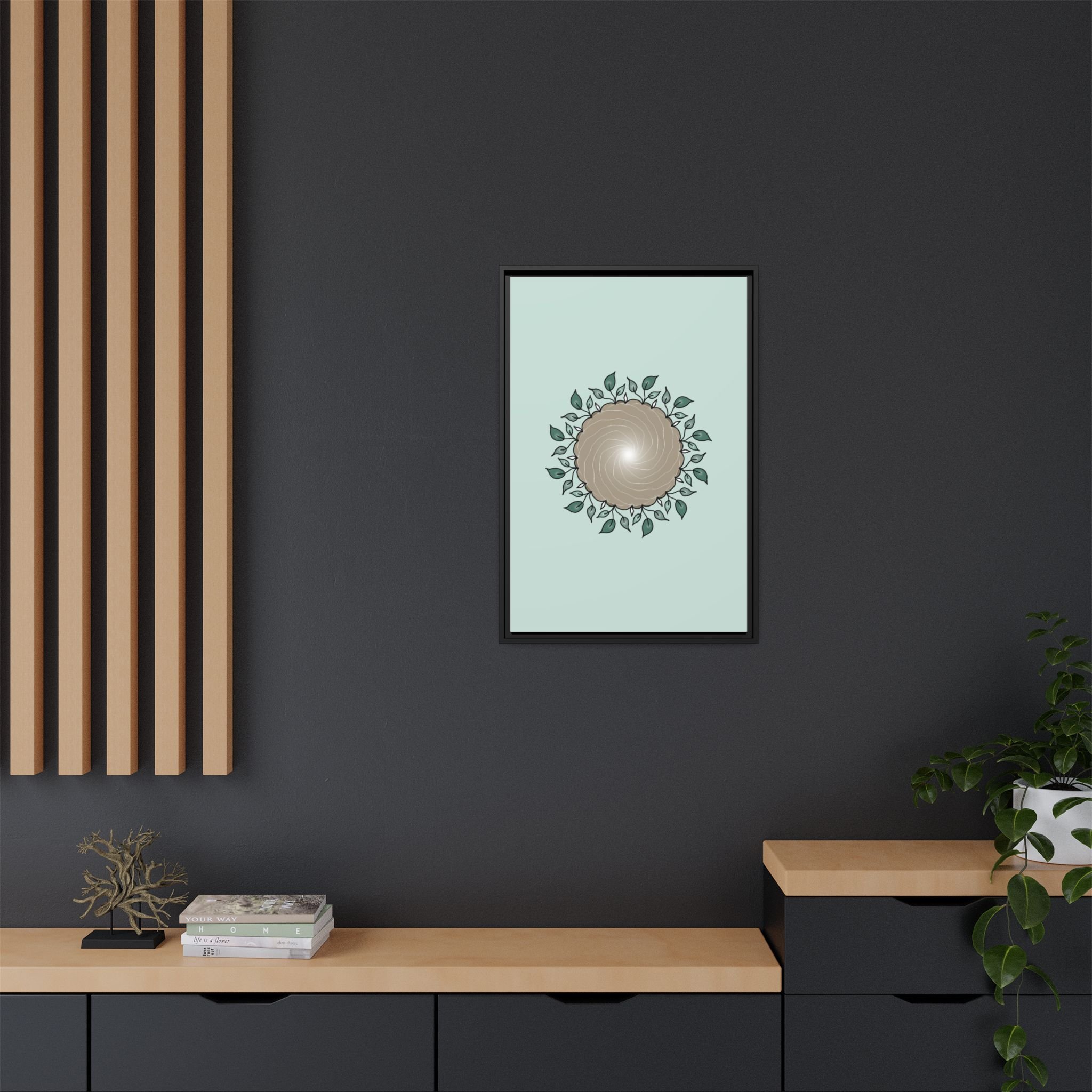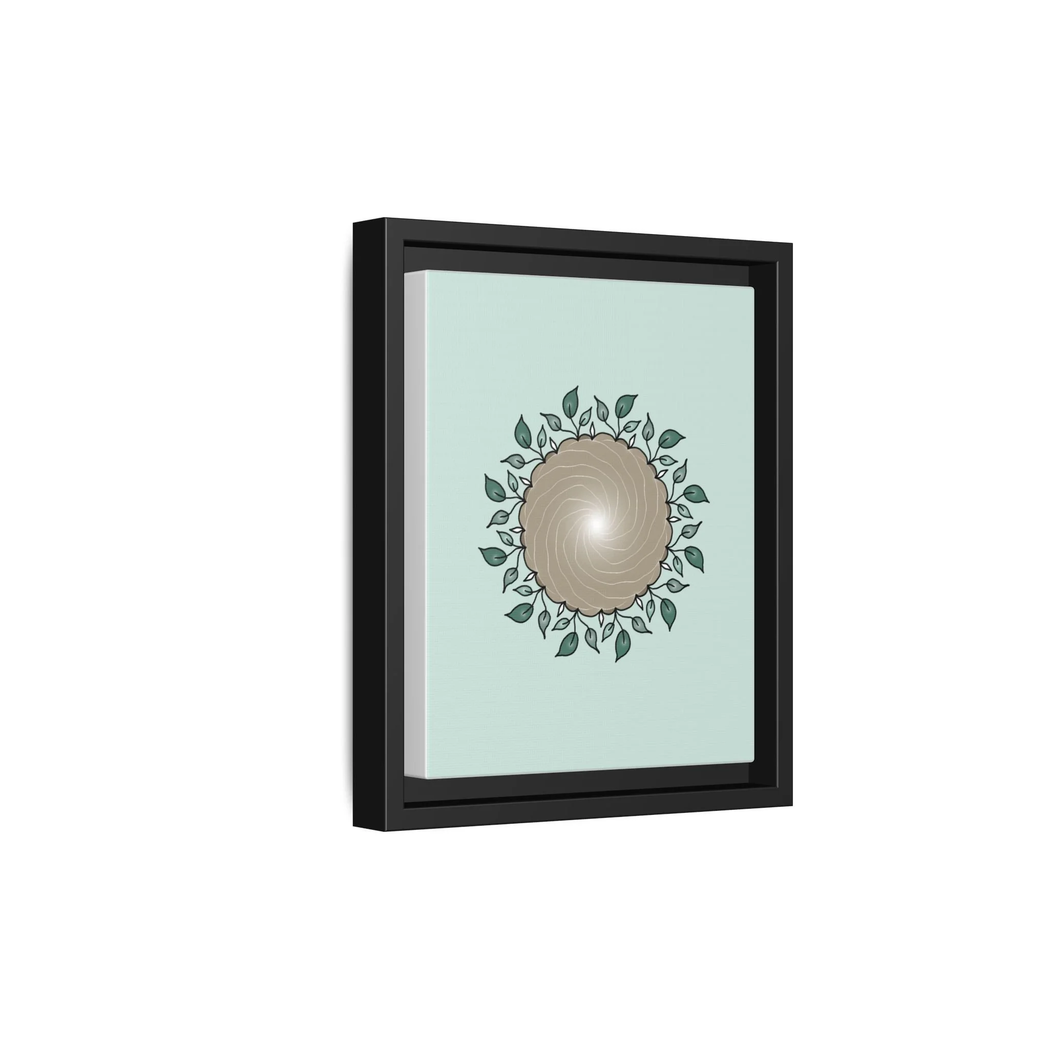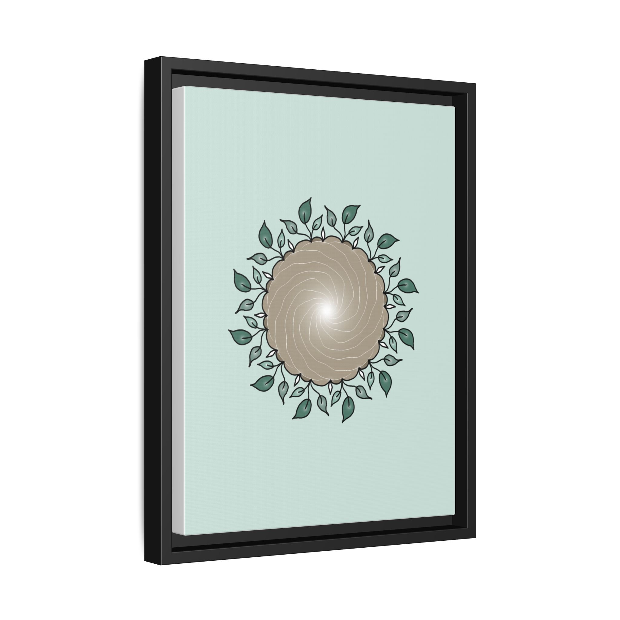 This matte canvas print evokes the grounding energy of nature with its soft sage green background and organic, spiraling center. The earthy cream tones and surrounding leaf-like border create a sense of natural rhythm and growth, making it a perfect visual anchor for slowing down. Framed in a slim pine profile, it brings the quiet essence of a forest glade into a minimalist bedroom, a home office, or a meditation space.