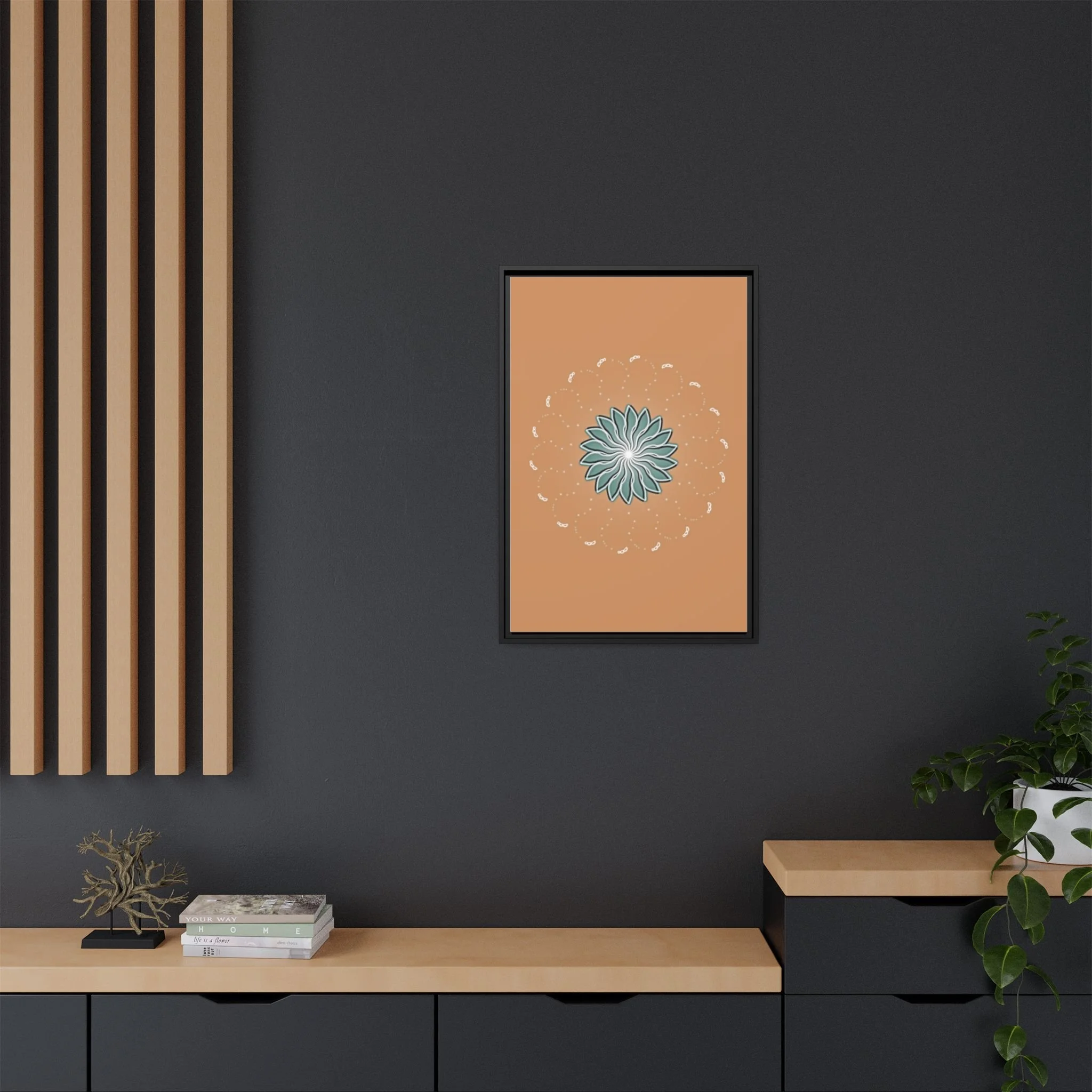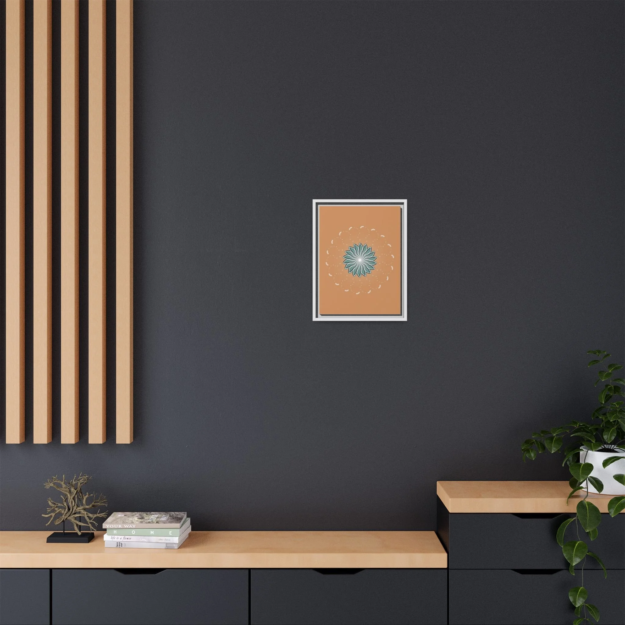 This matte canvas print strikes a beautiful balance between warm and cool tones, featuring a rich terracotta background with a cool teal floral center. The delicate white dotted swirls surrounding the flower create an airy, expansive feel, like seeds floating in the breeze. Framed in a slim pine profile, the piece reads earthy and balanced — it fits perfectly in a southwest-style living room, a bright dining area, or a plant-filled conservatory.