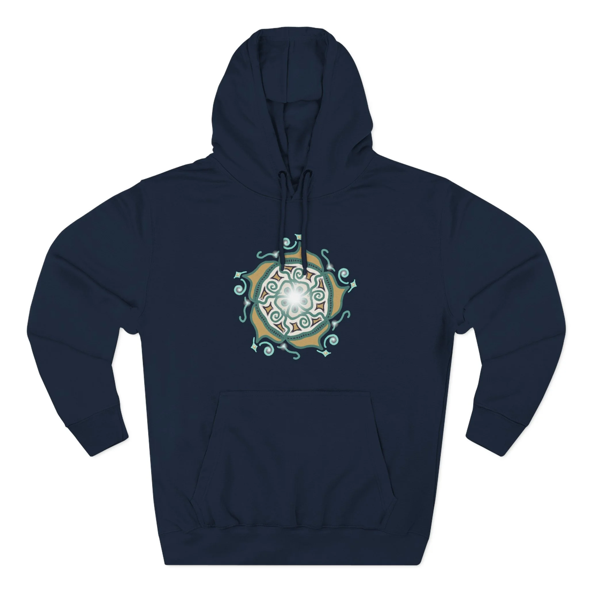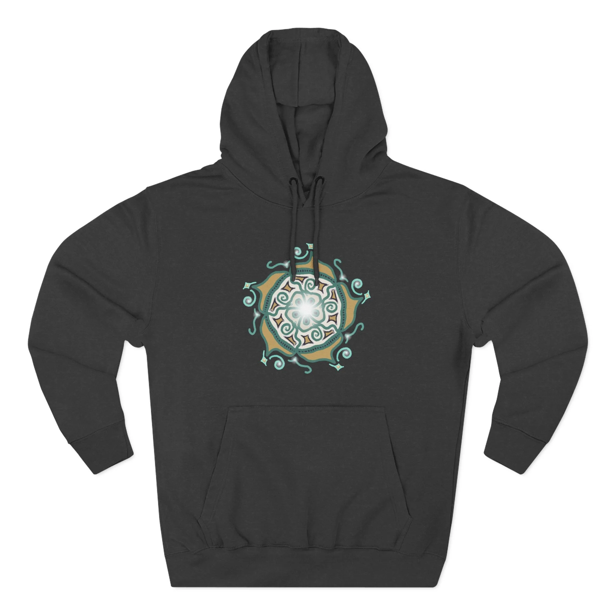 Soft, warm, and quietly artful — this hoodie blends cozy everyday wear with a hand-drawn, nature-inspired emblem at the chest. The medium-weight fleece holds shape and color, while the roomy kangaroo pocket and adjustable hood make it a go-to layer for cool mornings, late-night walks, and slow coffee runs. The emblem’s swirls and earth-toned palette give a subtle, organic look that reads like a personal talisman: familiar, calm, and quietly confident. It settles into your wardrobe without shouting, ready to be worn on hikes, creative studio days, or evenings around a fire.