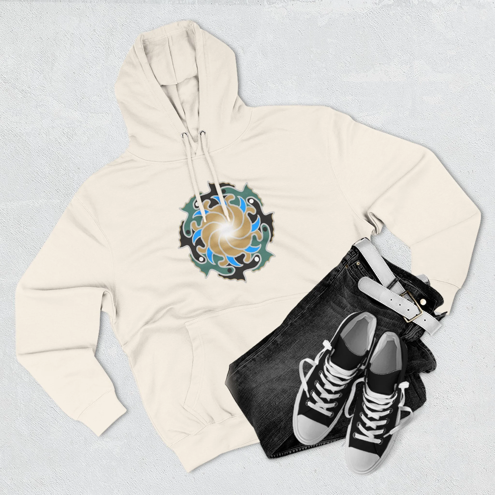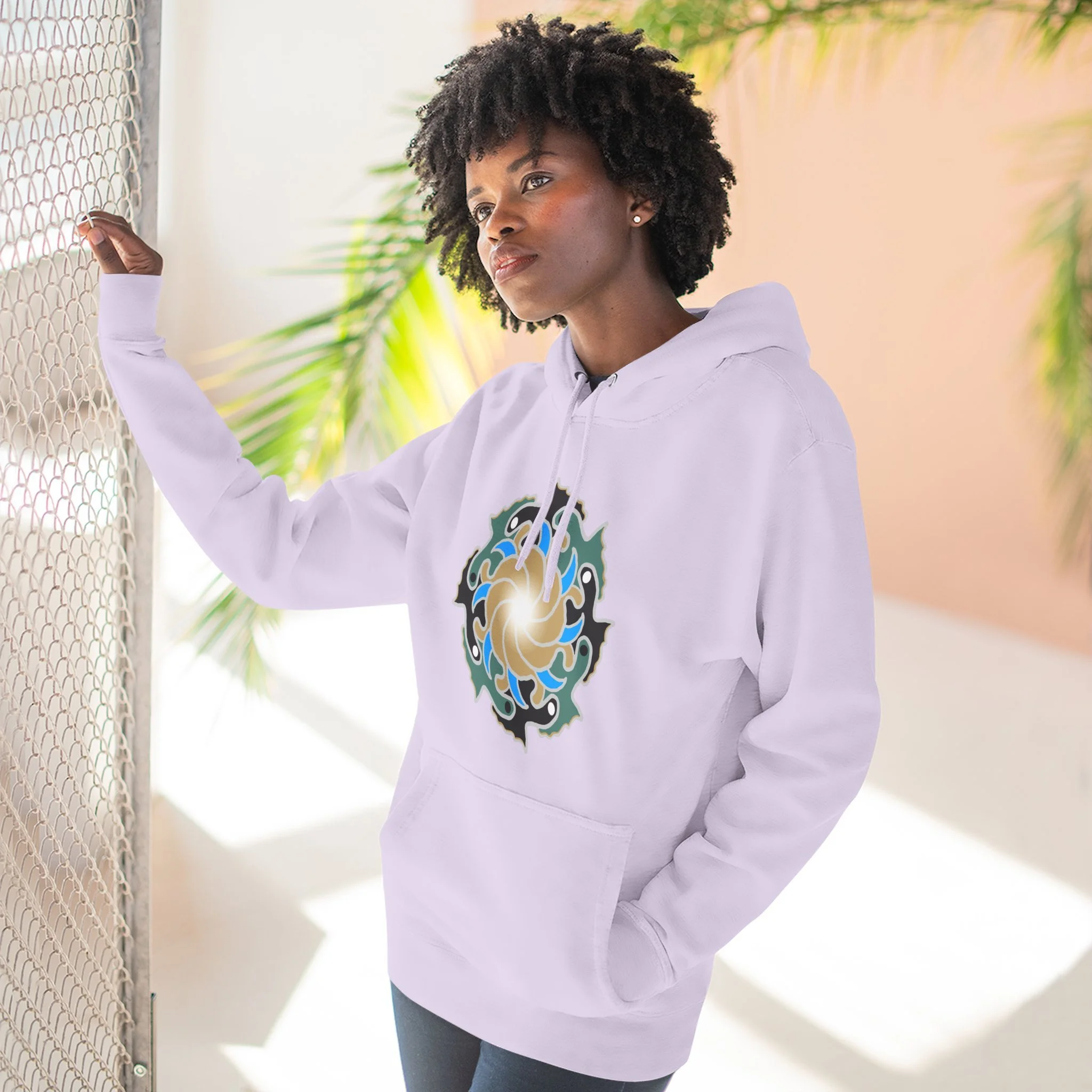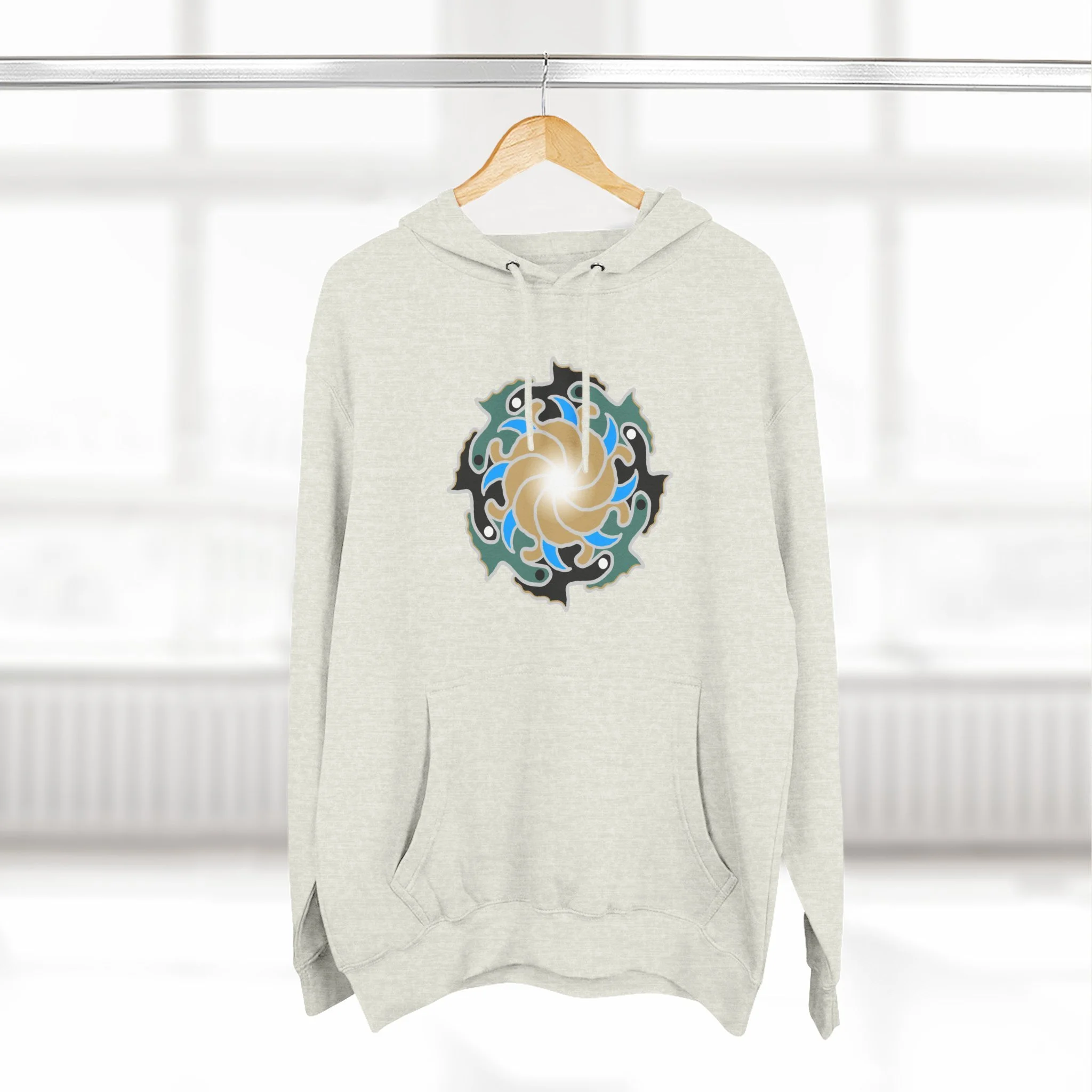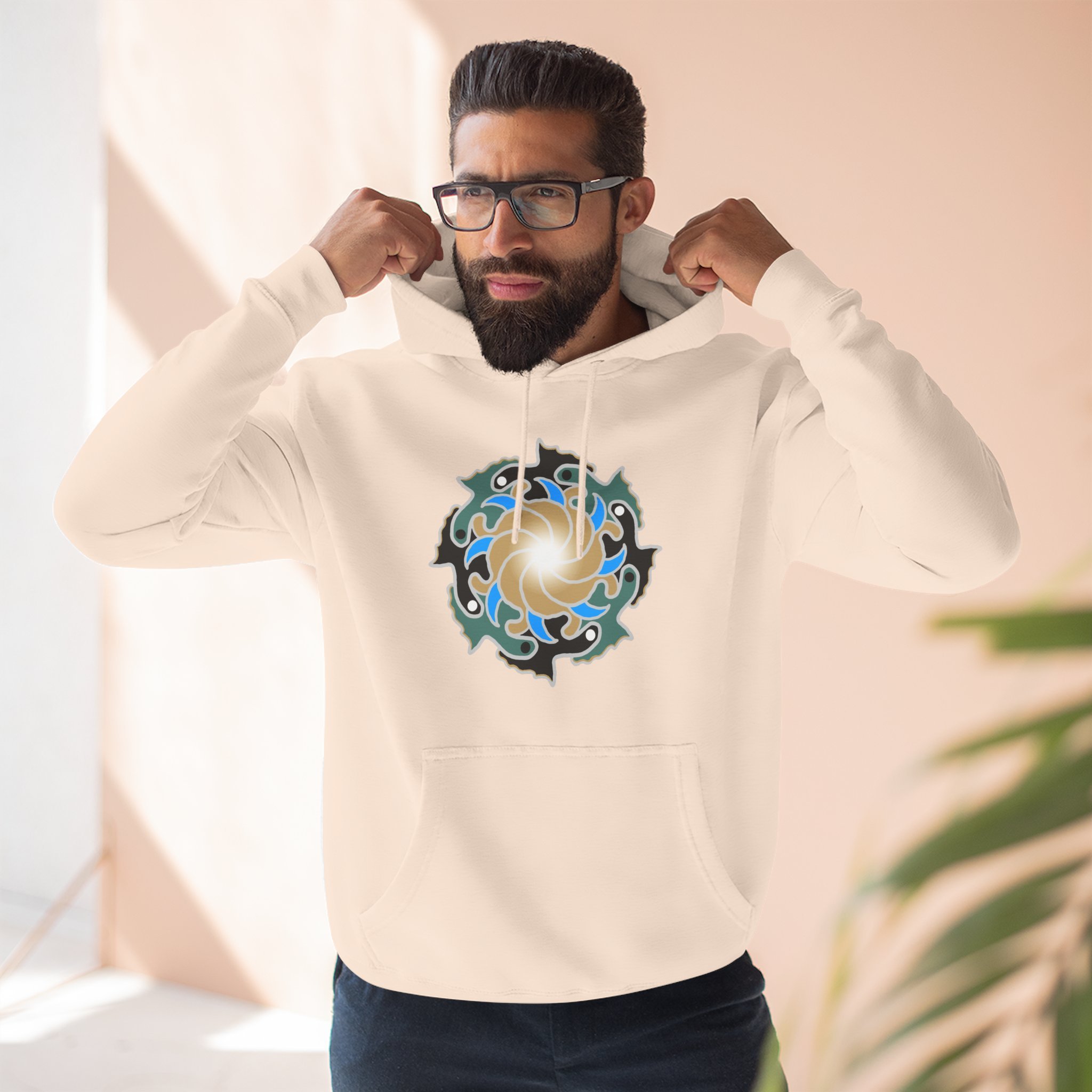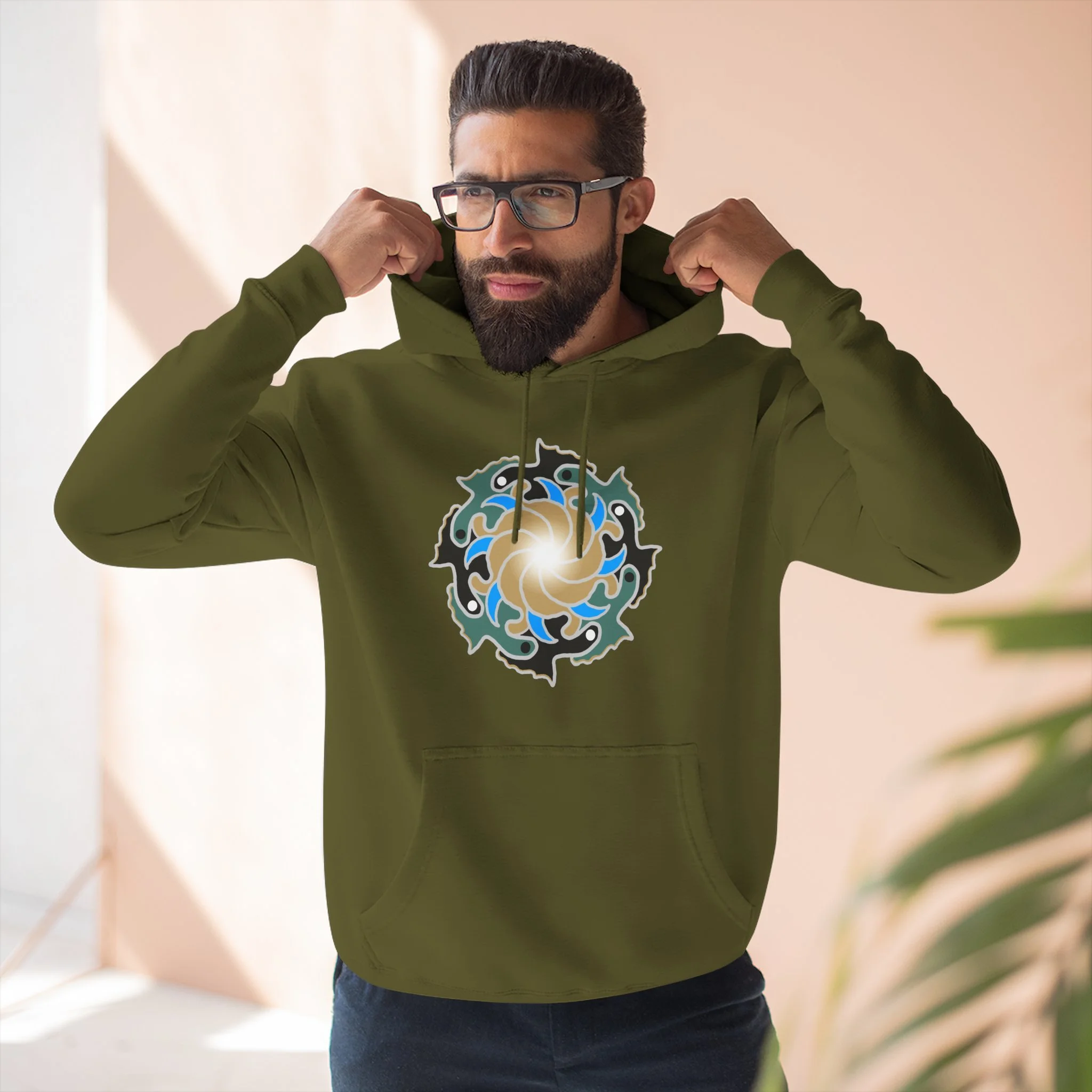 This midweight fleece hoodie brings calm energy to chilly days. The soft, brushed interior and structured hood cradle you while the centered, mandala-inspired emblem adds a quiet focal point — like a small ritual you slip into before heading out. The roomy kangaroo pocket keeps hands warm and phone tucked away. Thoughtful construction (twill neck tape, double-needle seams, and minimal shrinkage) means this hoodie wears in, not out. It sits comfortably in everyday rhythms: layered over a tee for morning coffee, pulled on after evening walks, or worn while sketching, journaling, or settling in with a book.