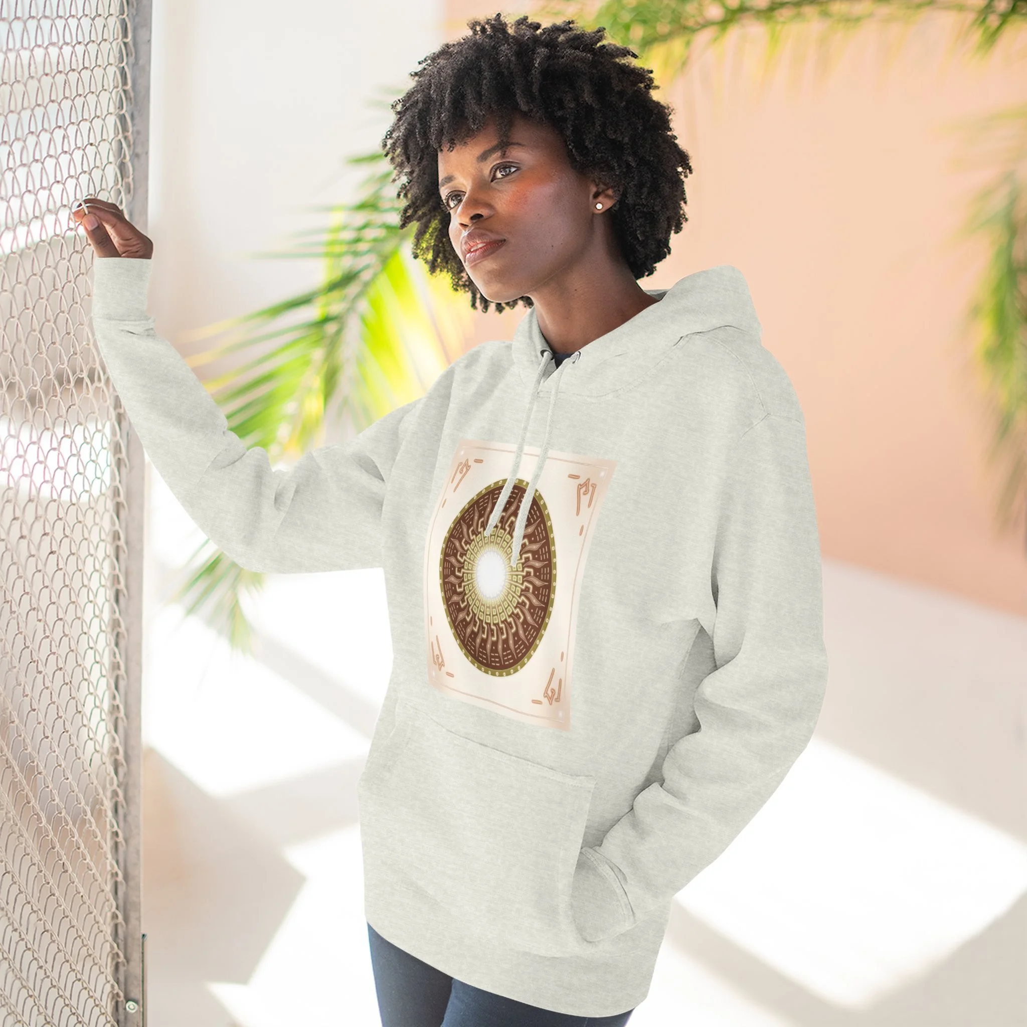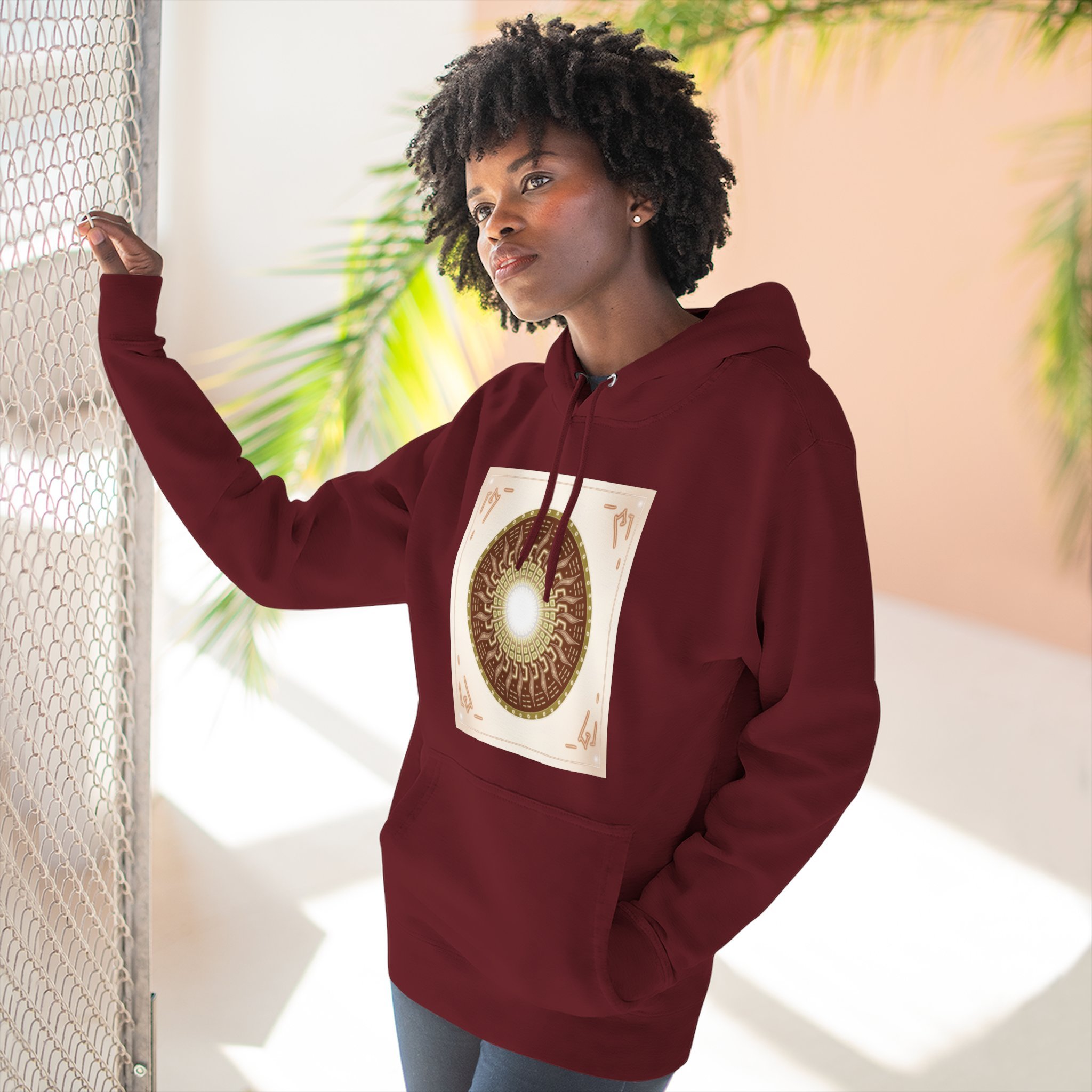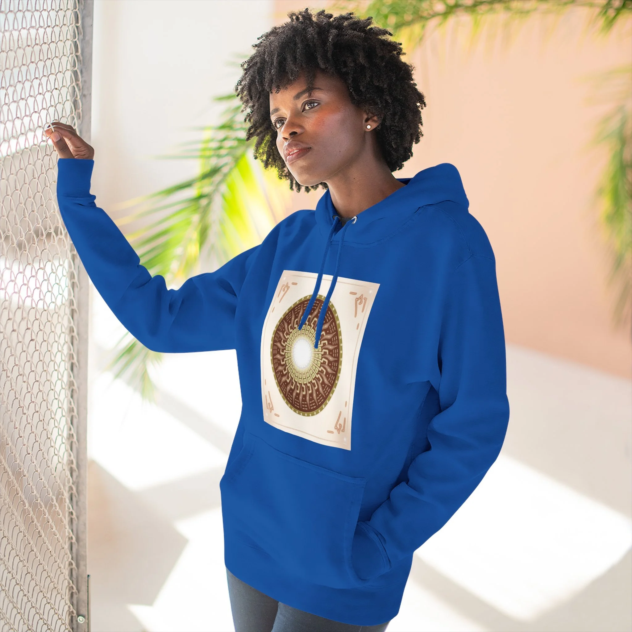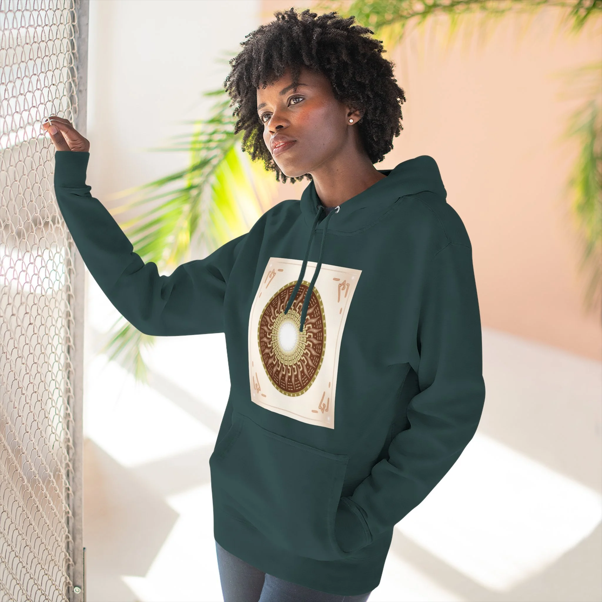 This hoodie carries a quiet, resonant energy — soft, warm fleece wrapped around a symbolic mandala-like design that draws the eye to its glowing center. It feels like a portable calm: the roomy hood, adjustable drawstrings, and kangaroo pouch make it a go-to layer for slow mornings, creative studio sessions, or late-night walks. The medium-heavy fabric and structured neck tape keep the silhouette clean while the embroidery option adds a handcrafted touch to the chest. Wear it when you want comfort that looks thoughtful and imagery that invites a second look.