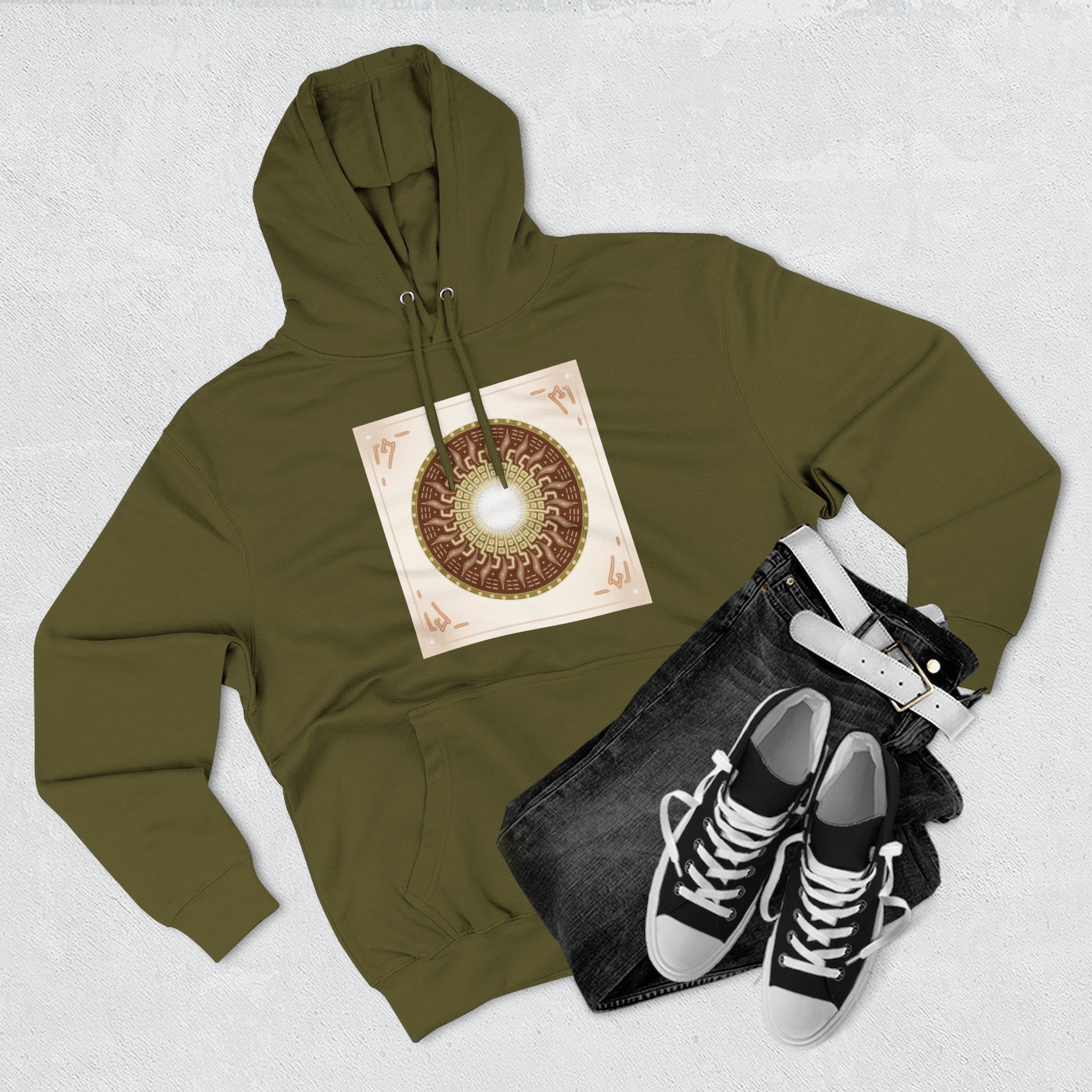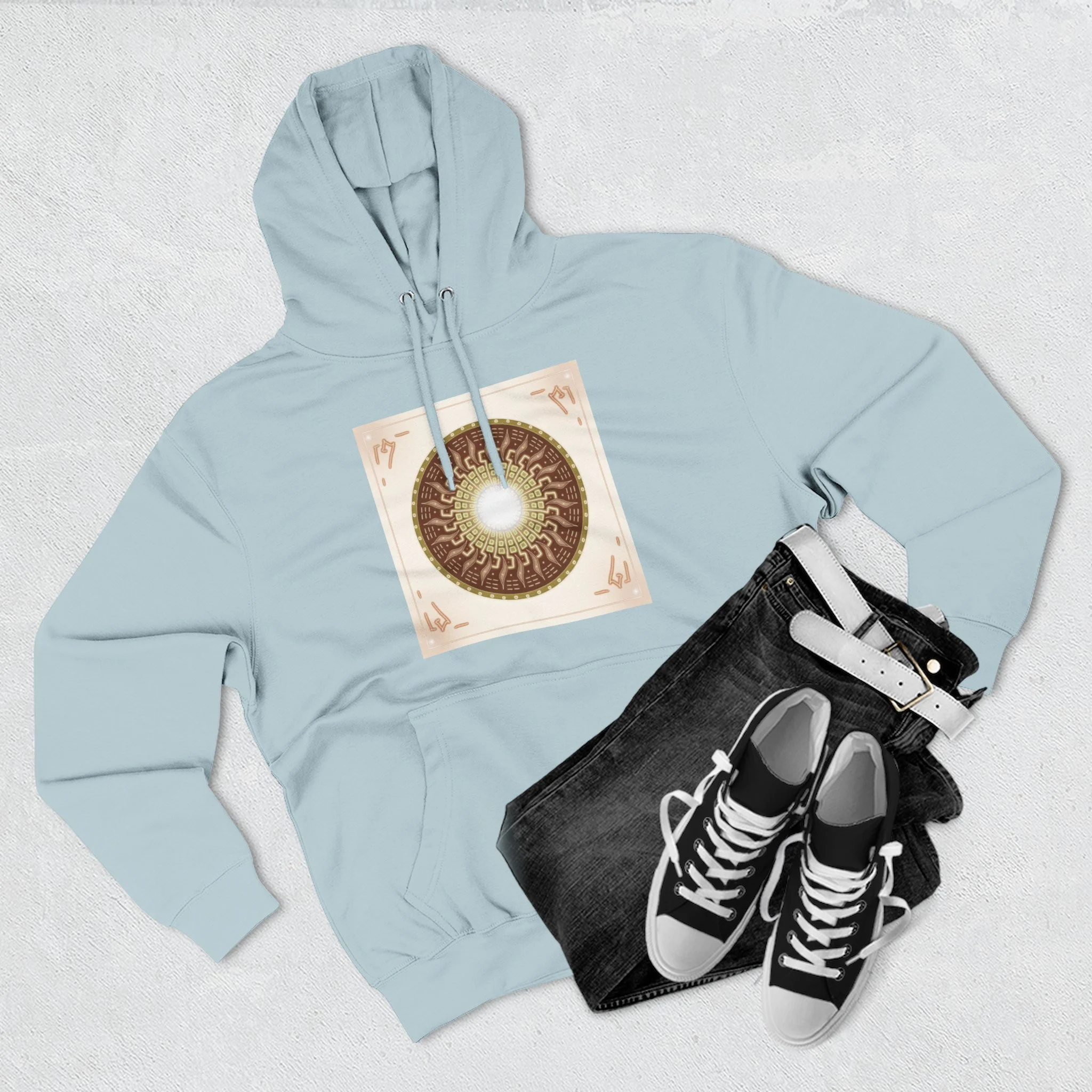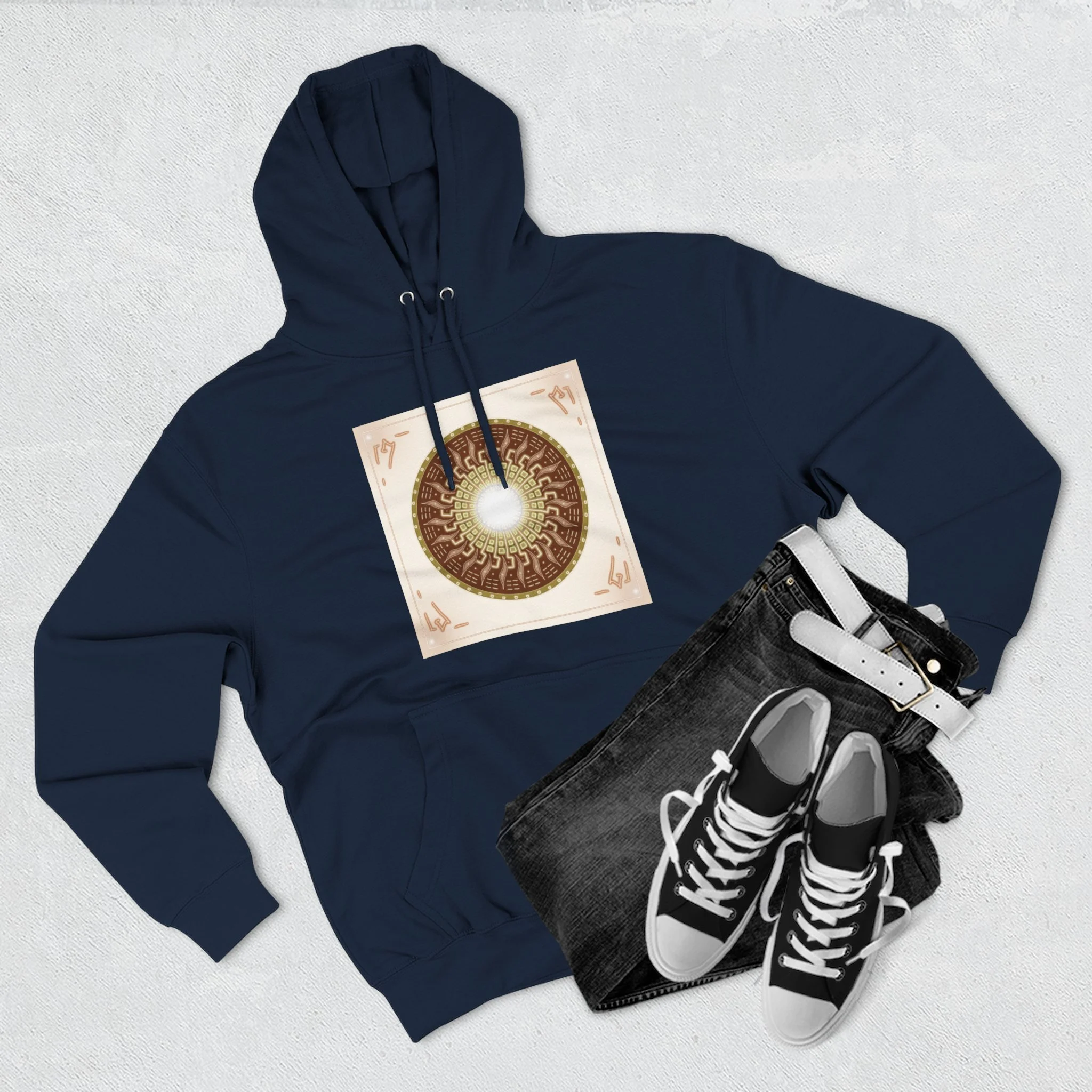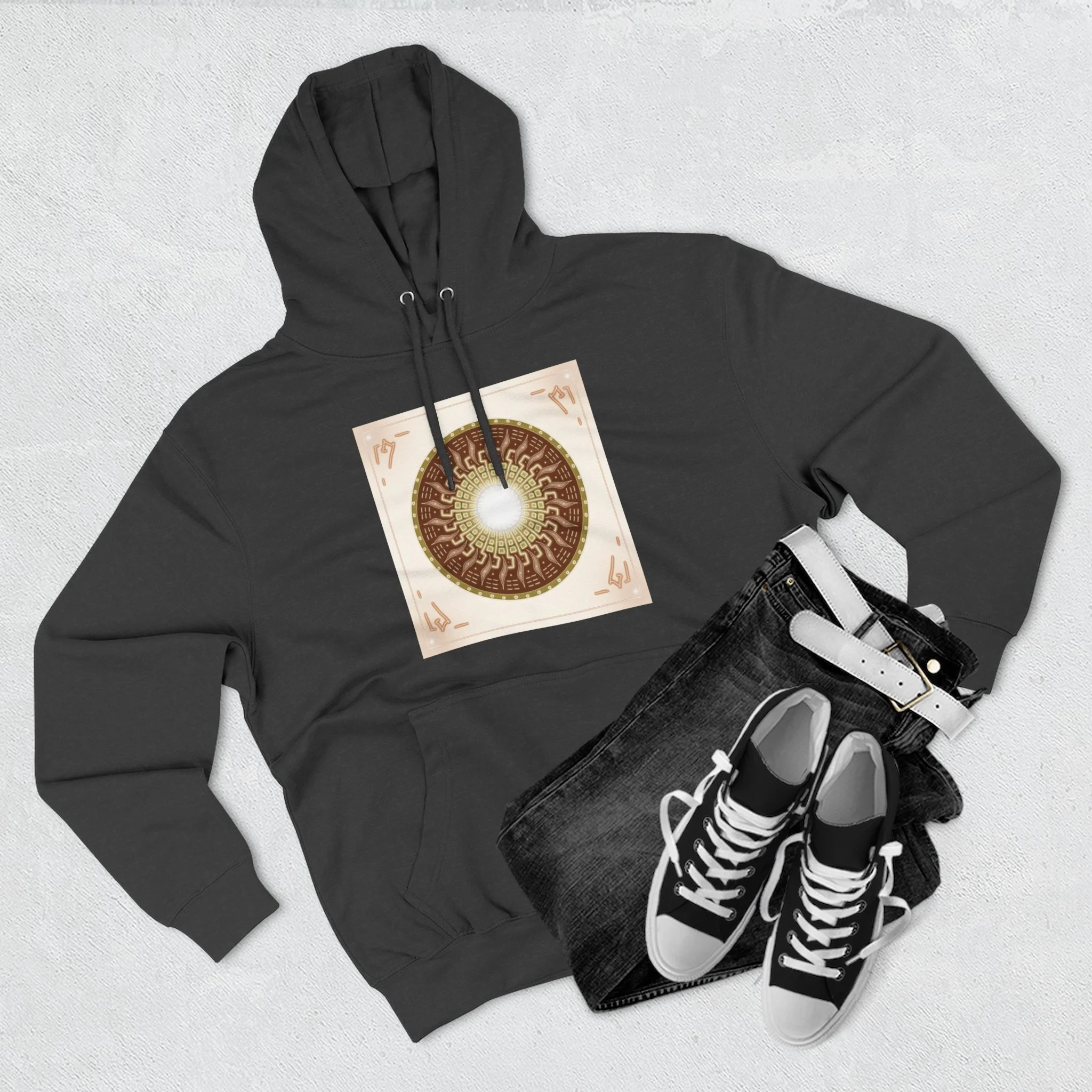 This hoodie carries a quiet, resonant energy — soft, warm fleece wrapped around a symbolic mandala-like design that draws the eye to its glowing center. It feels like a portable calm: the roomy hood, adjustable drawstrings, and kangaroo pouch make it a go-to layer for slow mornings, creative studio sessions, or late-night walks. The medium-heavy fabric and structured neck tape keep the silhouette clean while the embroidery option adds a handcrafted touch to the chest. Wear it when you want comfort that looks thoughtful and imagery that invites a second look.