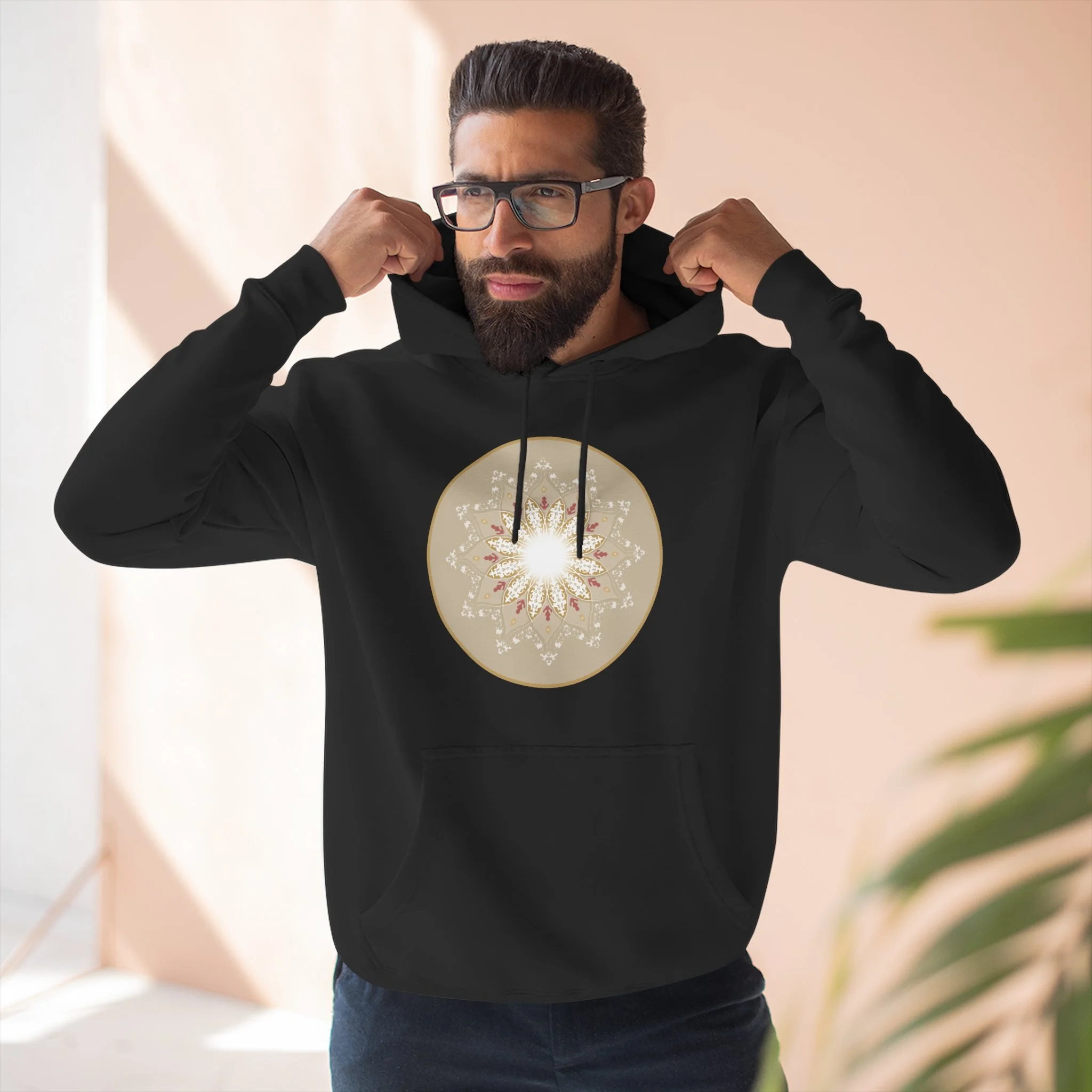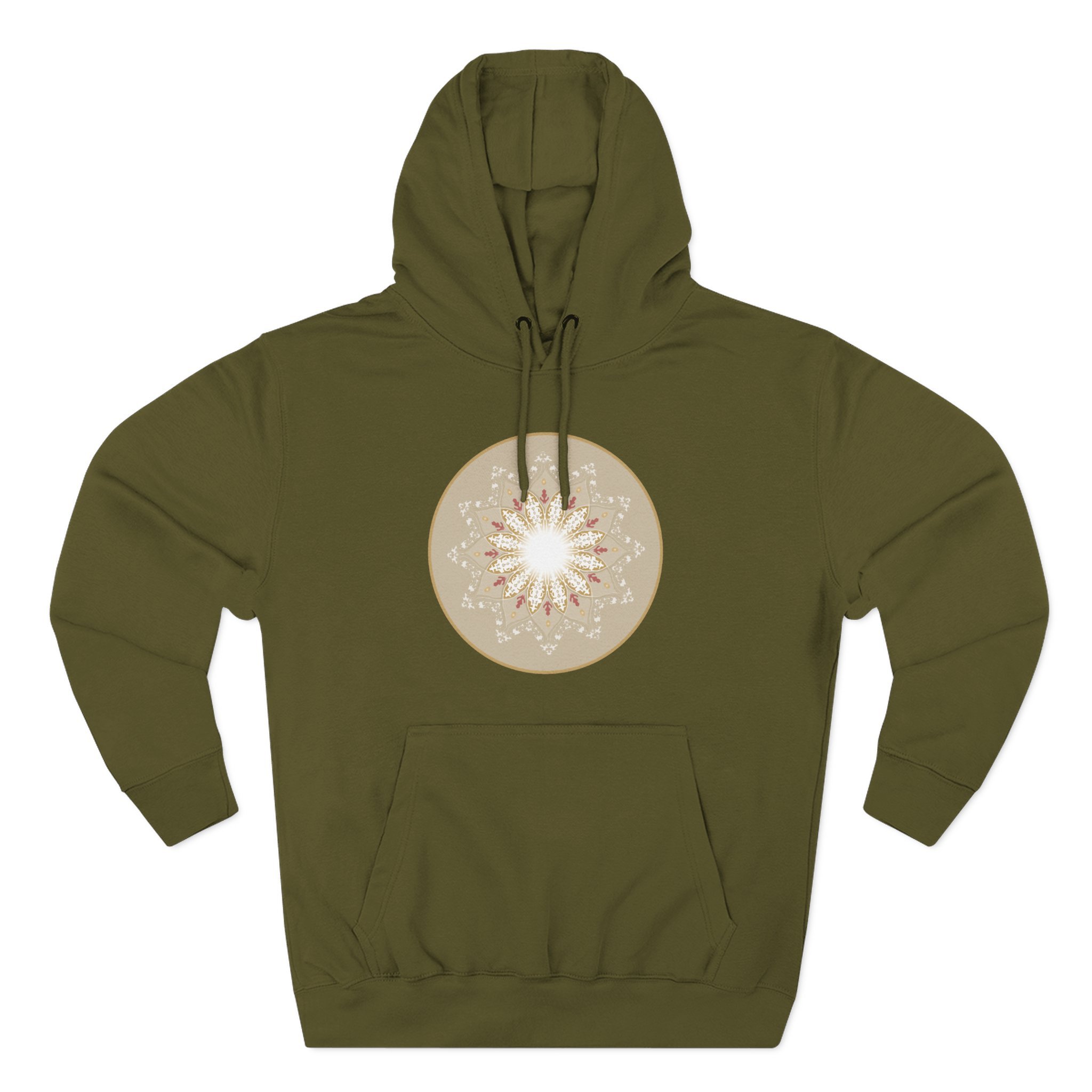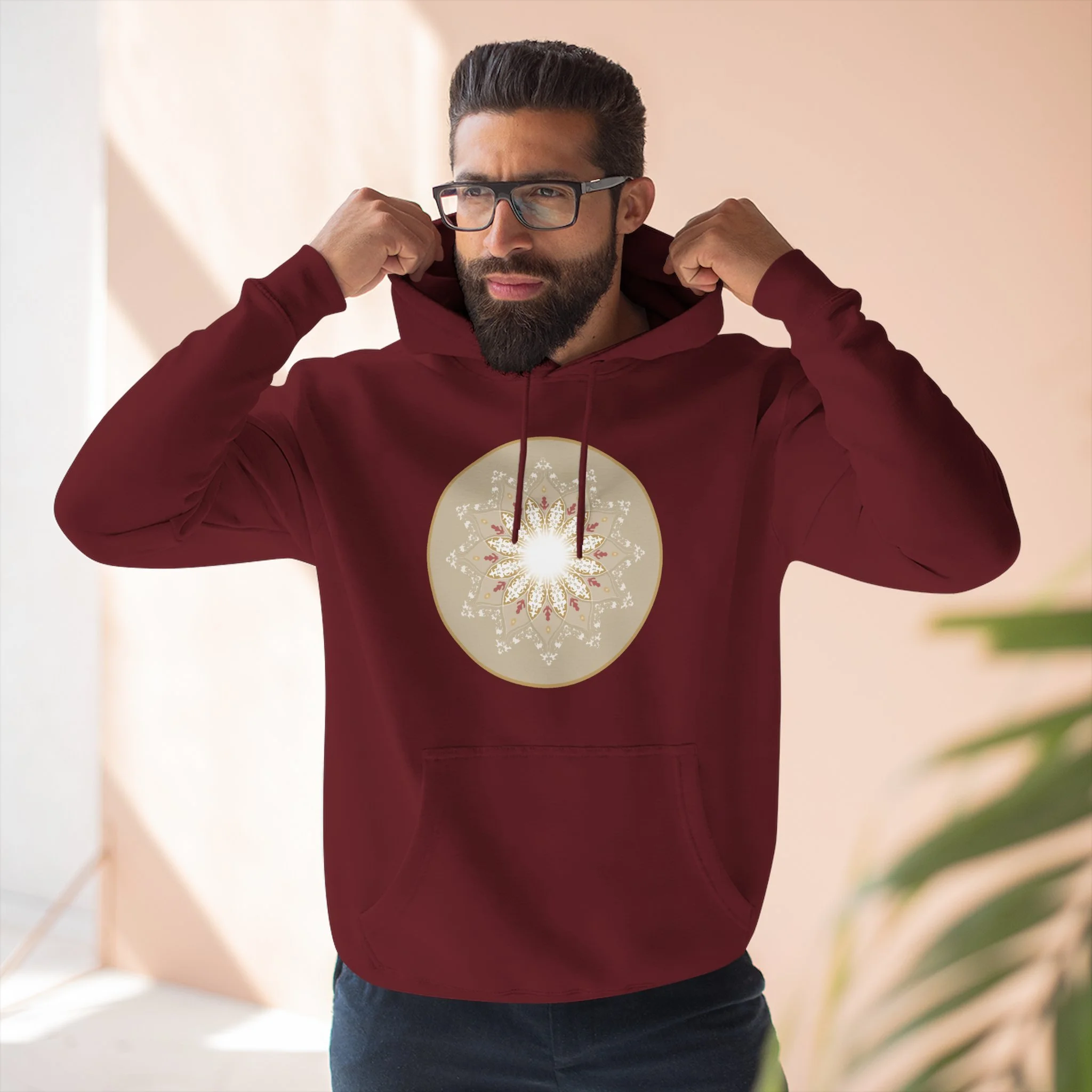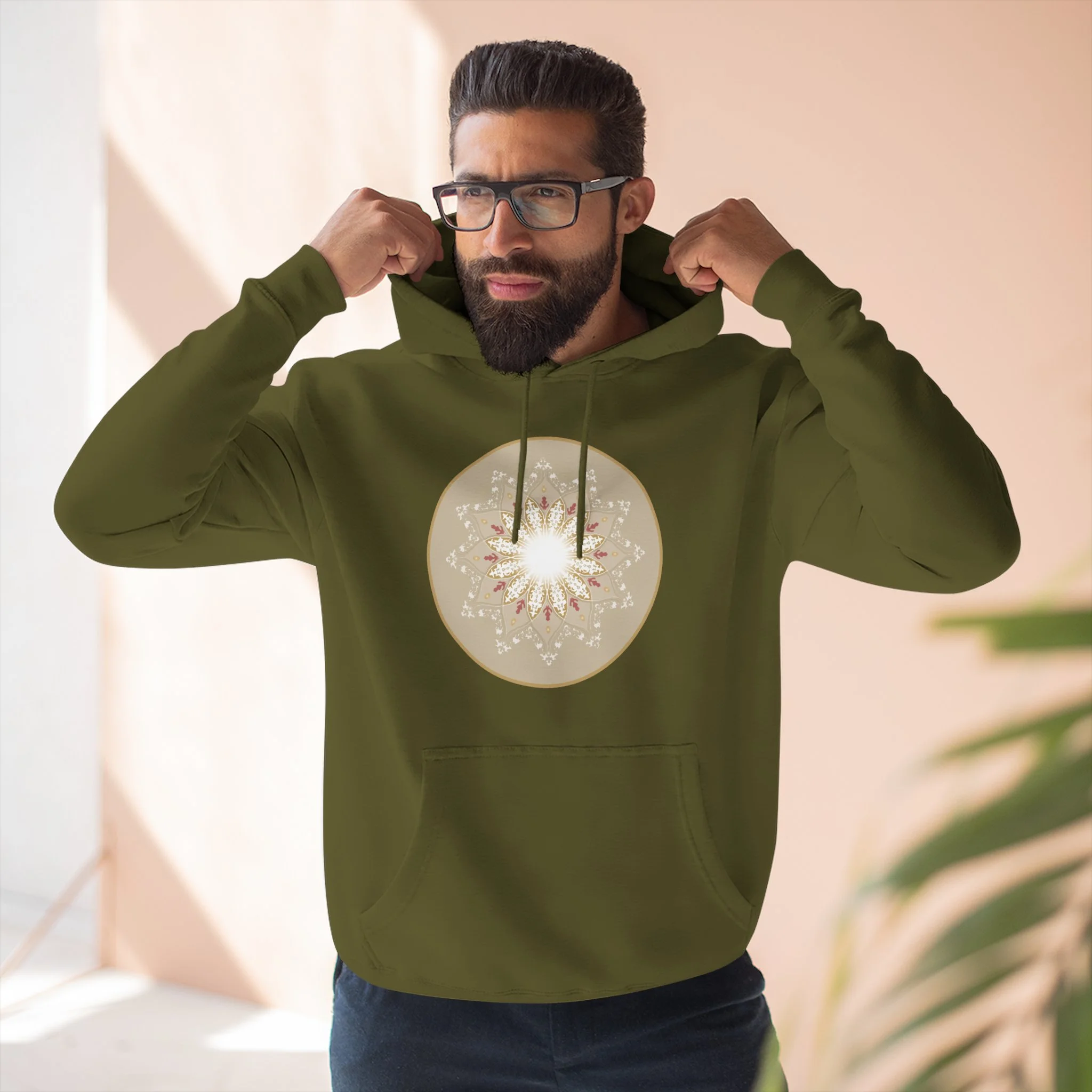 A cozy, mid-weight hoodie with a calm, sunburst-inspired mandala printed on the chest. The soft three-end fleece and combed ring-spun cotton blend feel warm against the skin while staying breathable. A roomy kangaroo pocket and adjustable hood with woven drawcords make it comfortable for slow mornings, chilly walks, or quiet studio hours. The neutral, earthy circular motif sits centered over the heart, catching light without shouting — it’s for people who prefer subtle, grounded style that speaks in small, steady gestures.