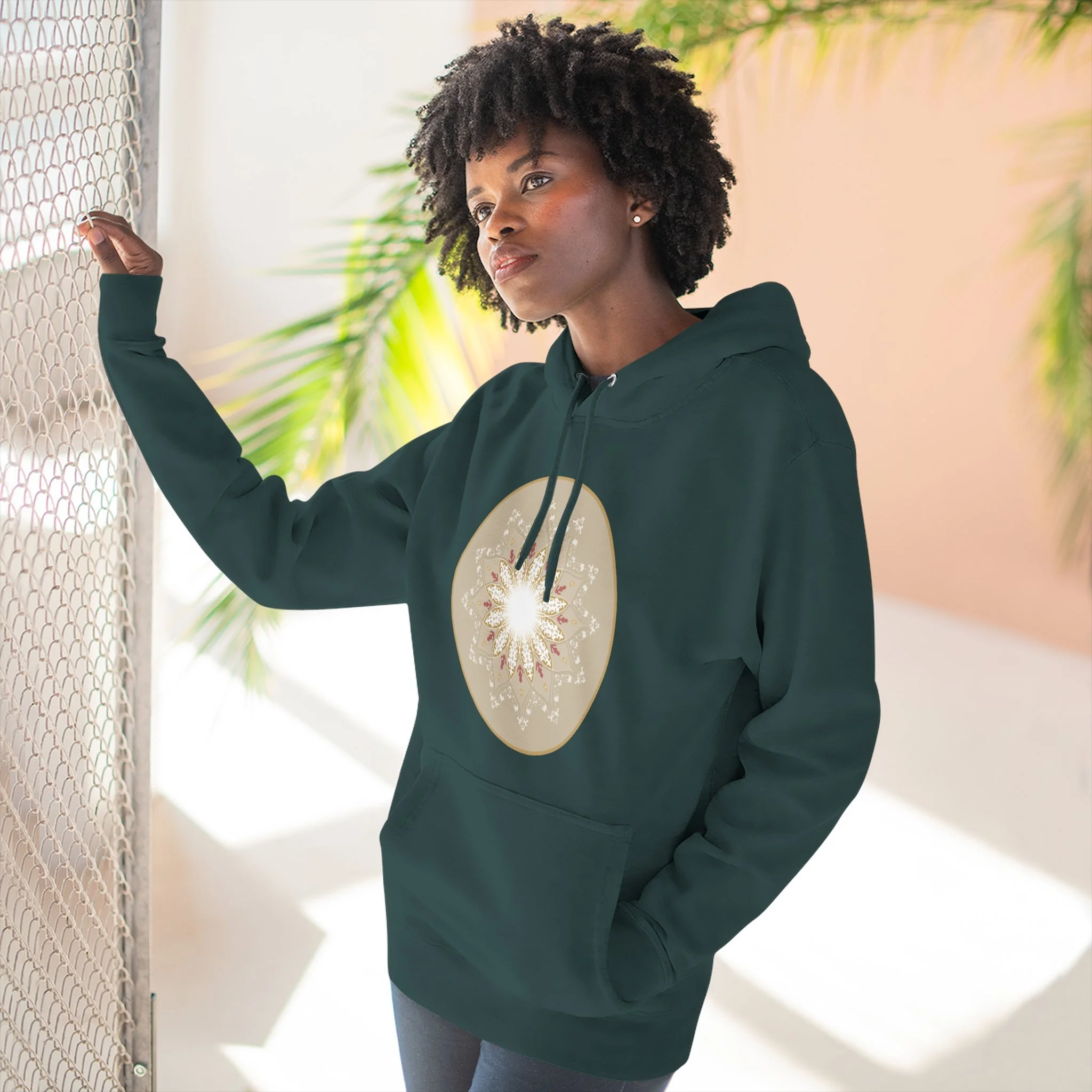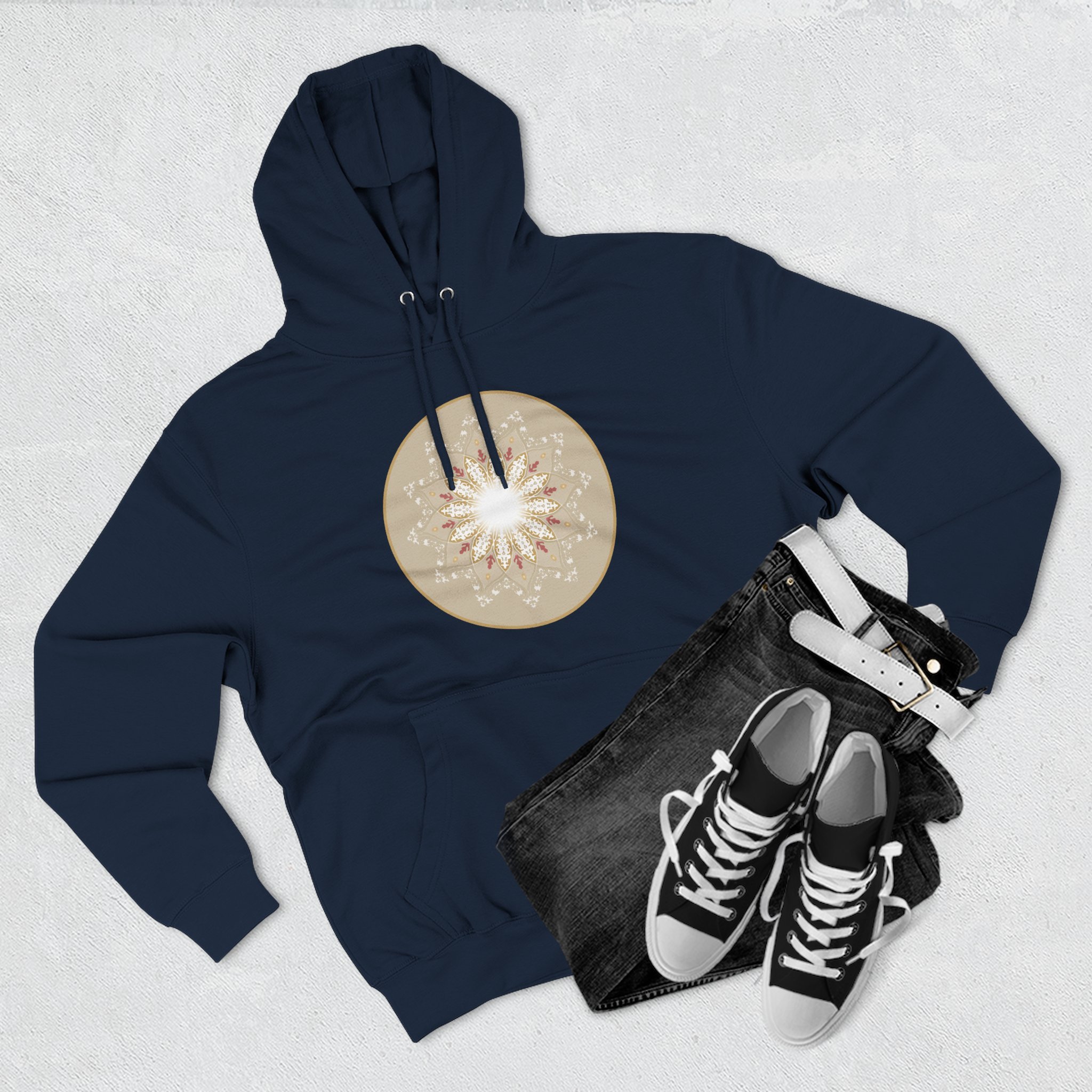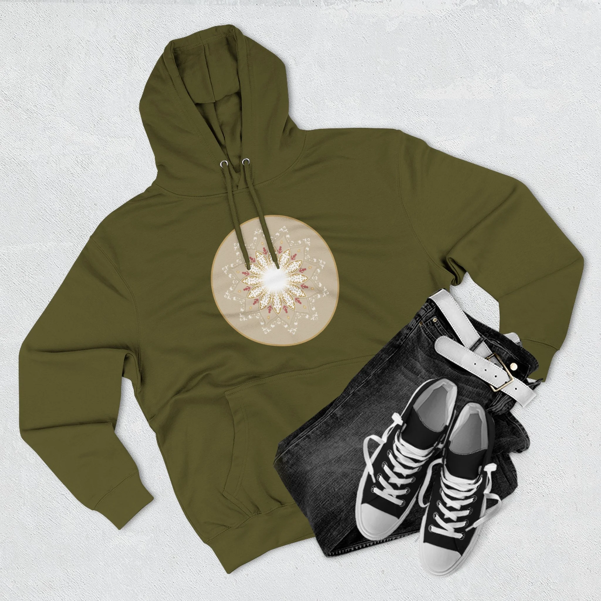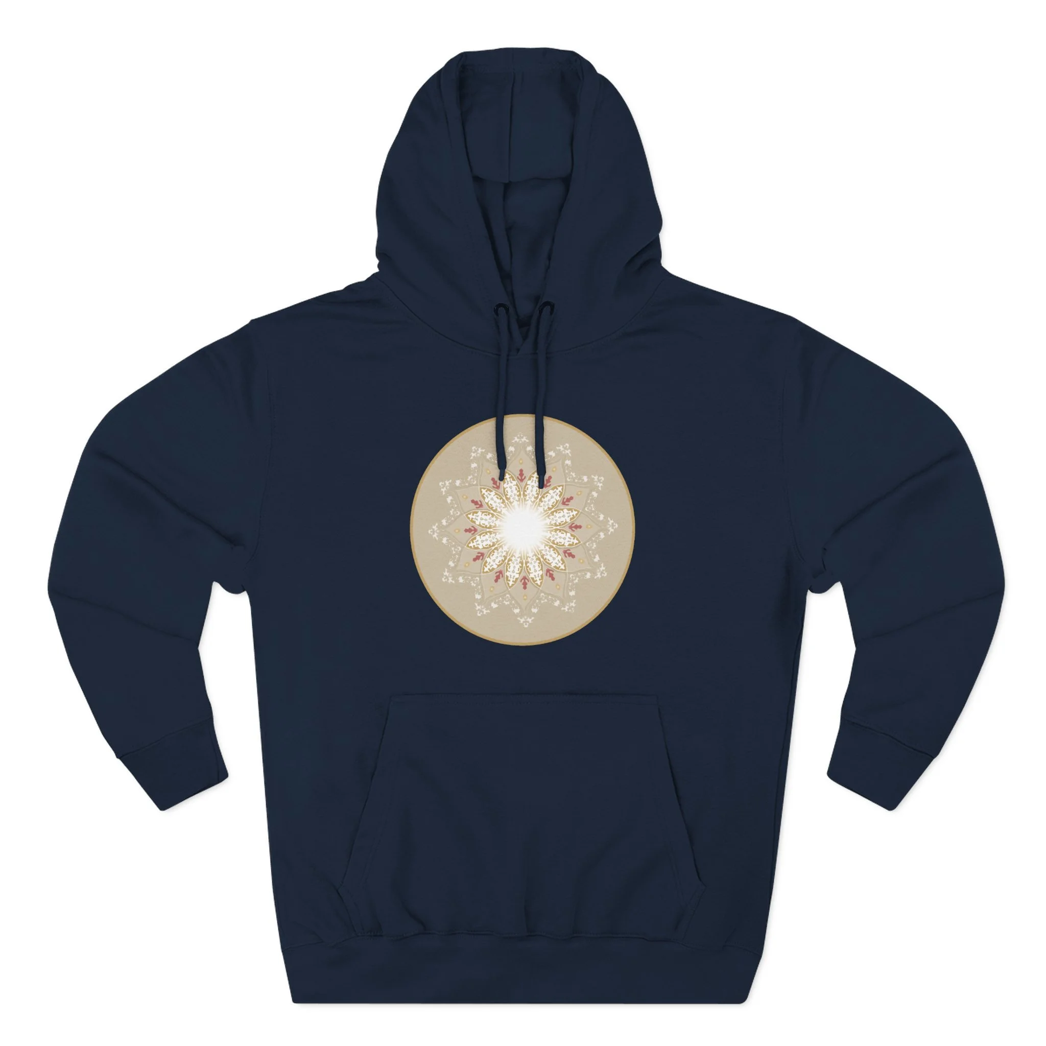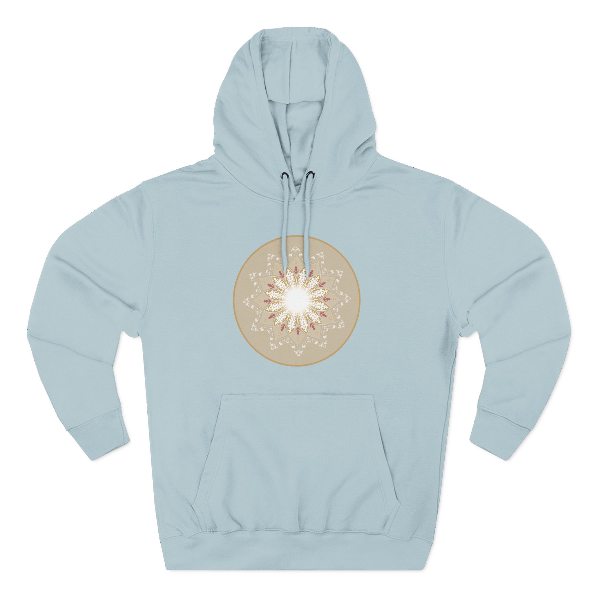 A cozy, mid-weight hoodie with a calm, sunburst-inspired mandala printed on the chest. The soft three-end fleece and combed ring-spun cotton blend feel warm against the skin while staying breathable. A roomy kangaroo pocket and adjustable hood with woven drawcords make it comfortable for slow mornings, chilly walks, or quiet studio hours. The neutral, earthy circular motif sits centered over the heart, catching light without shouting — it’s for people who prefer subtle, grounded style that speaks in small, steady gestures.